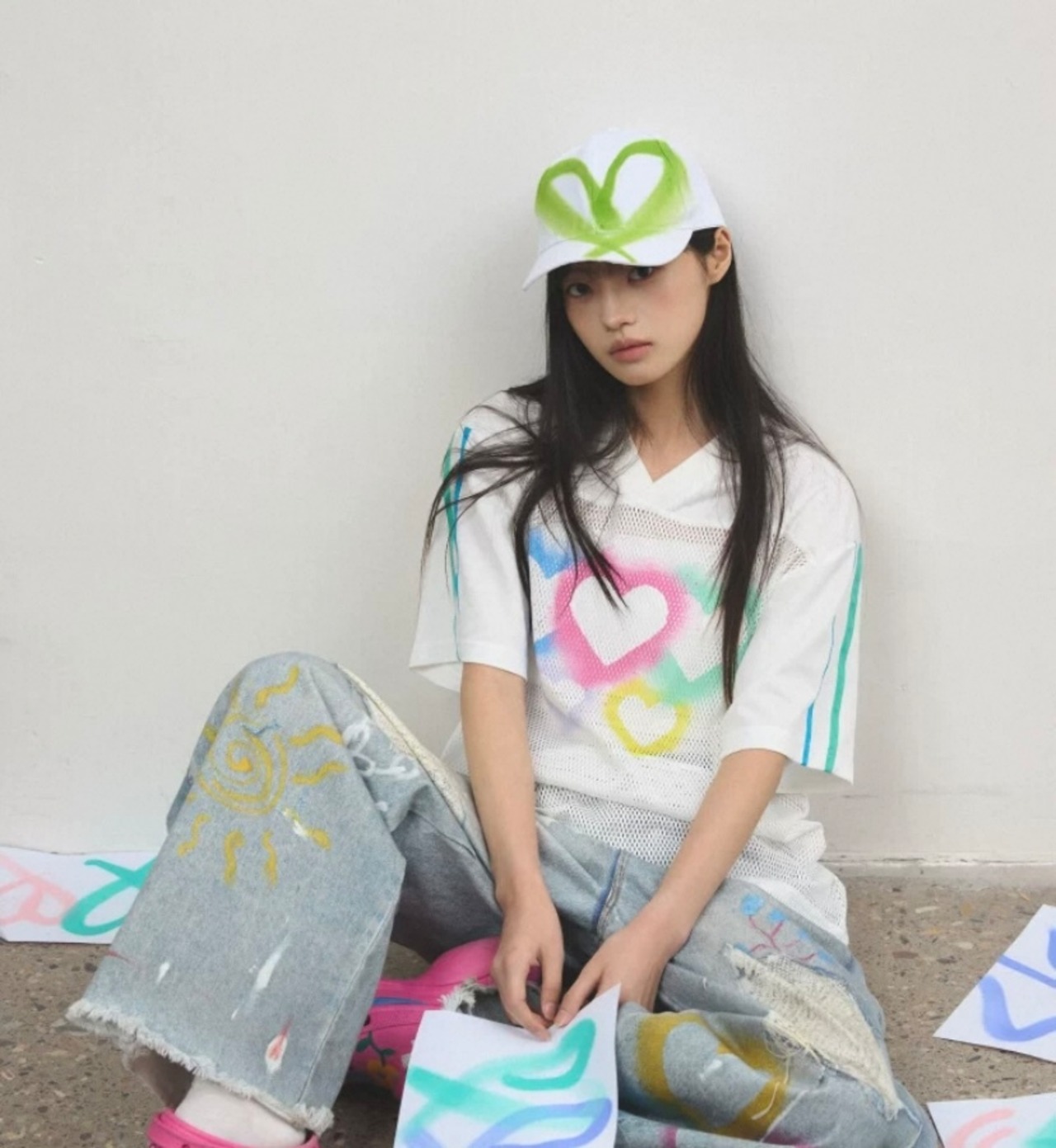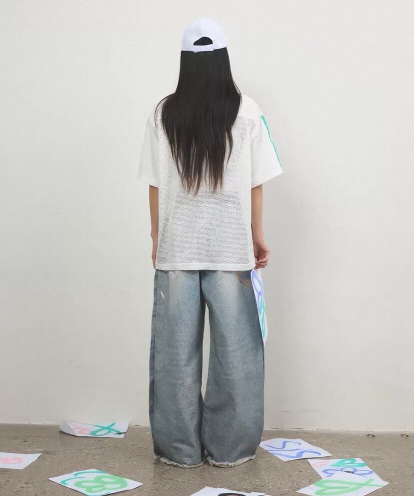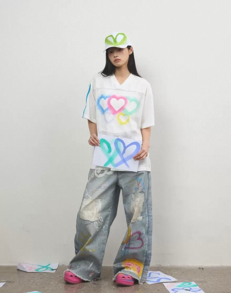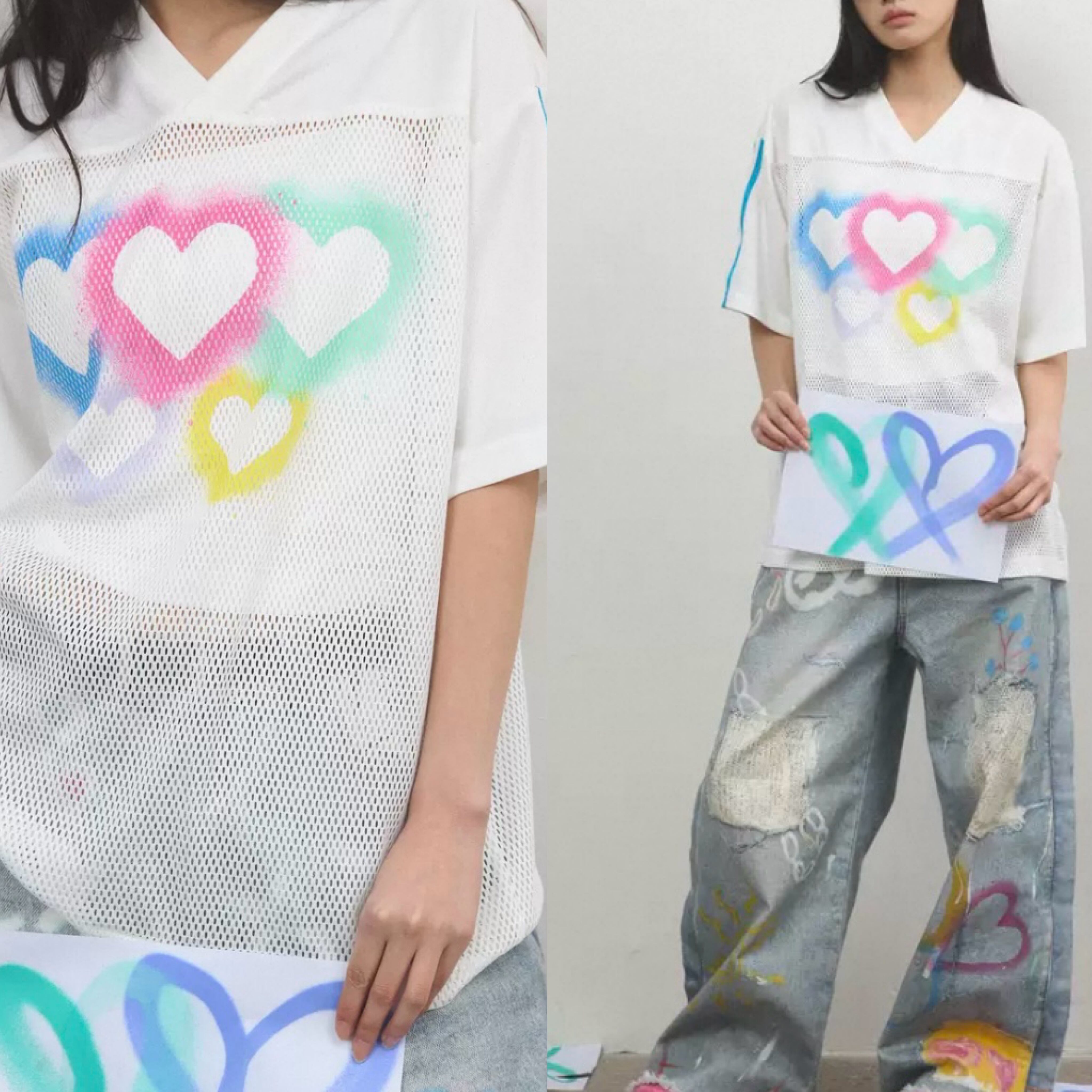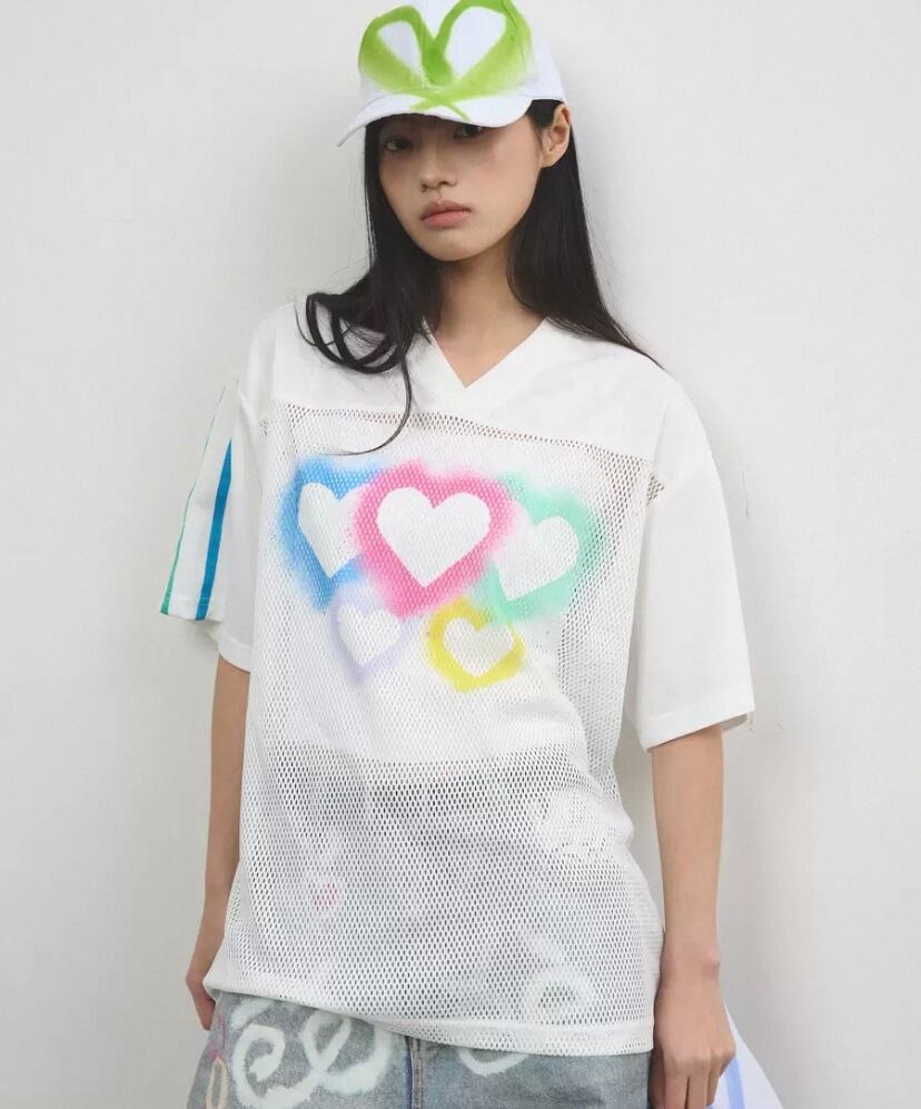 トップス、カジュアル ハート メッシュ、白 ゆったり ブラウス Tシャツ ハート カラフル レインボー ピンク 原宿