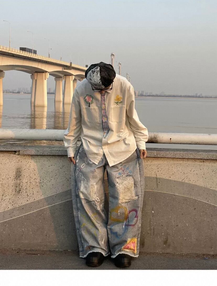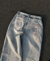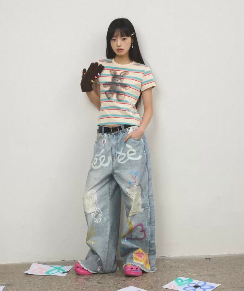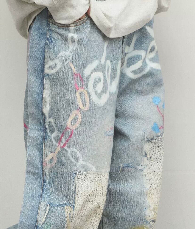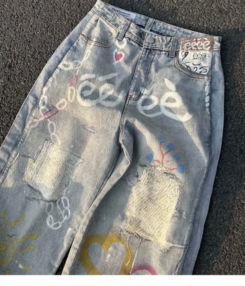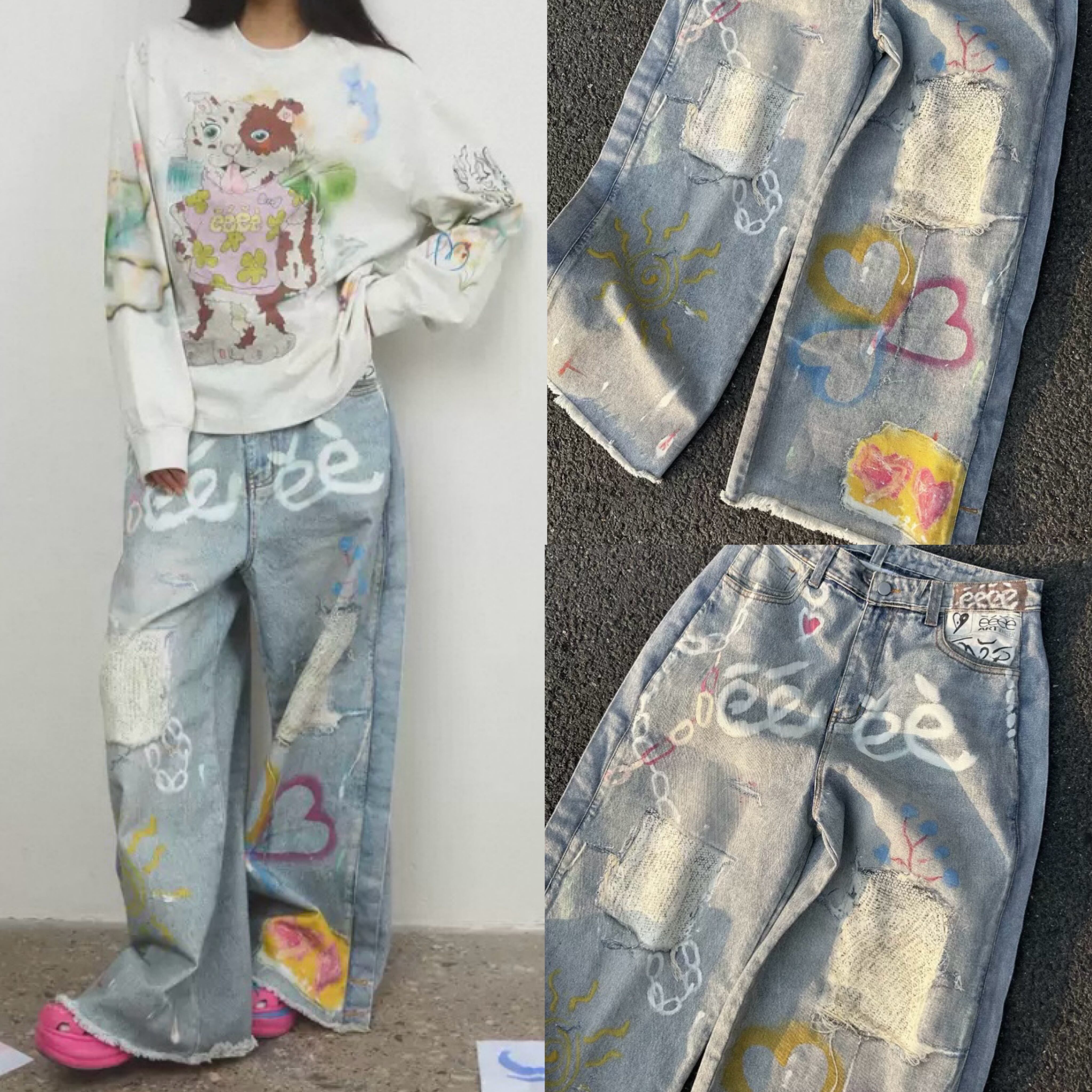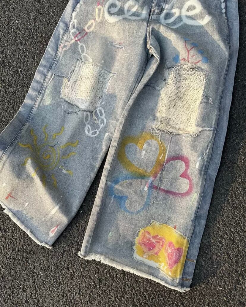 ハート 落書き パンツ ジーパン ジーンズ、水色 カジュアル