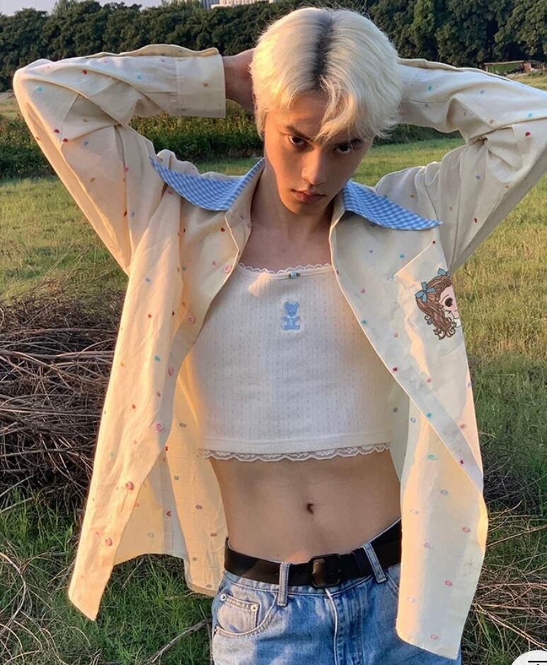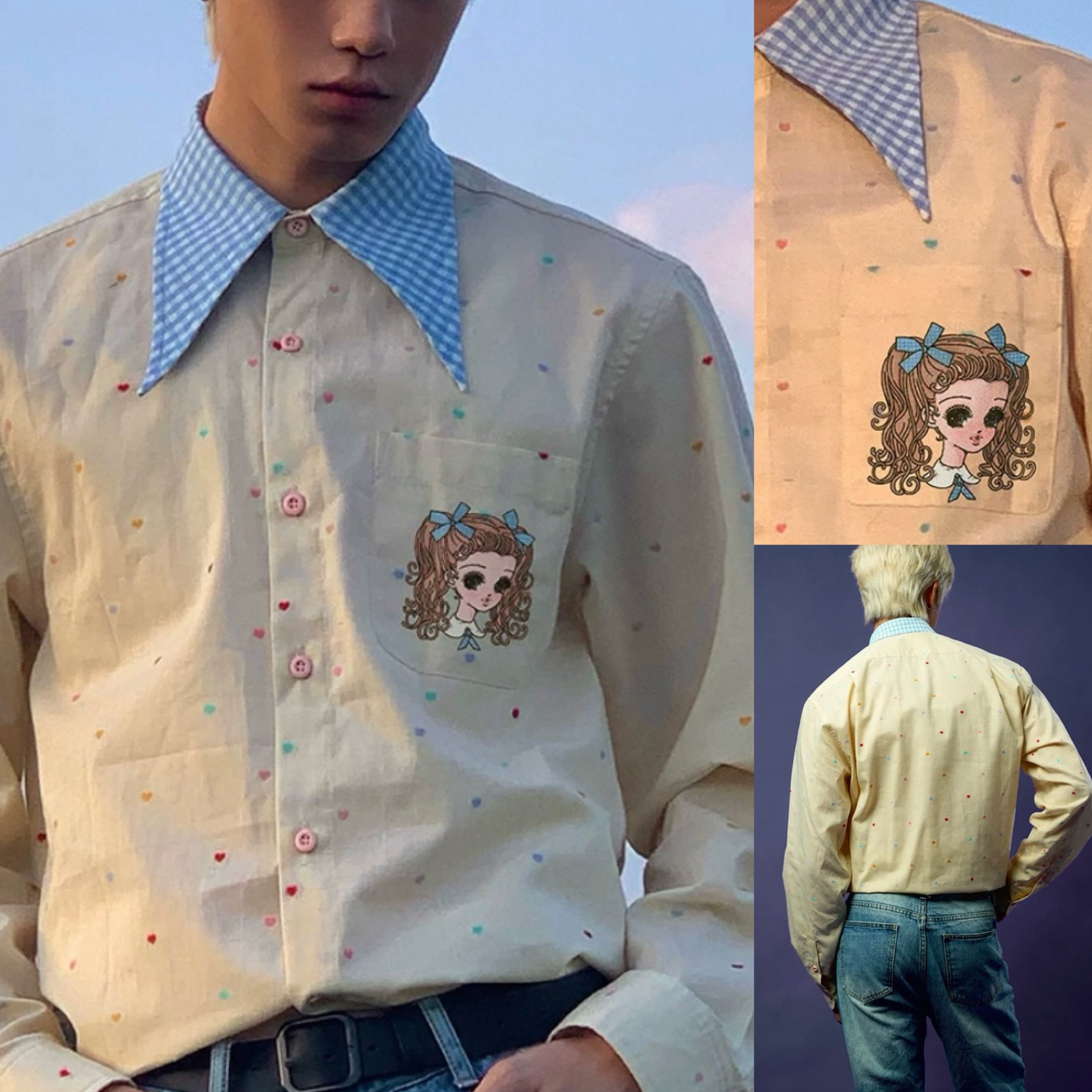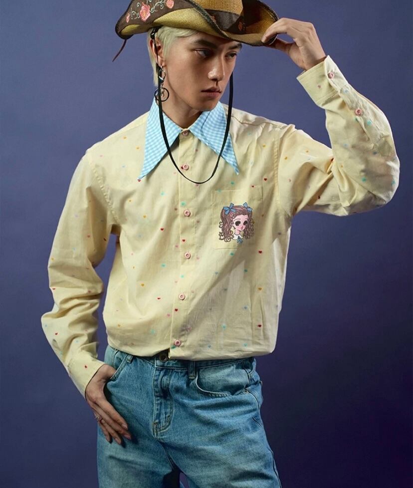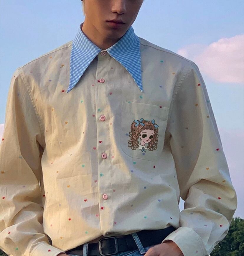 水玉、かわいい 水色、シャツ、ブラウス、トップス オーバーサイズ、XL メンズライク ユニセックス