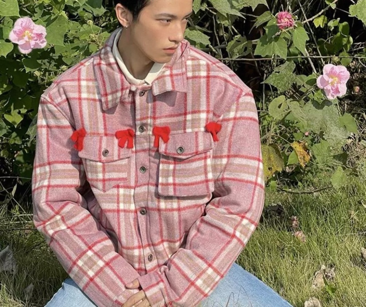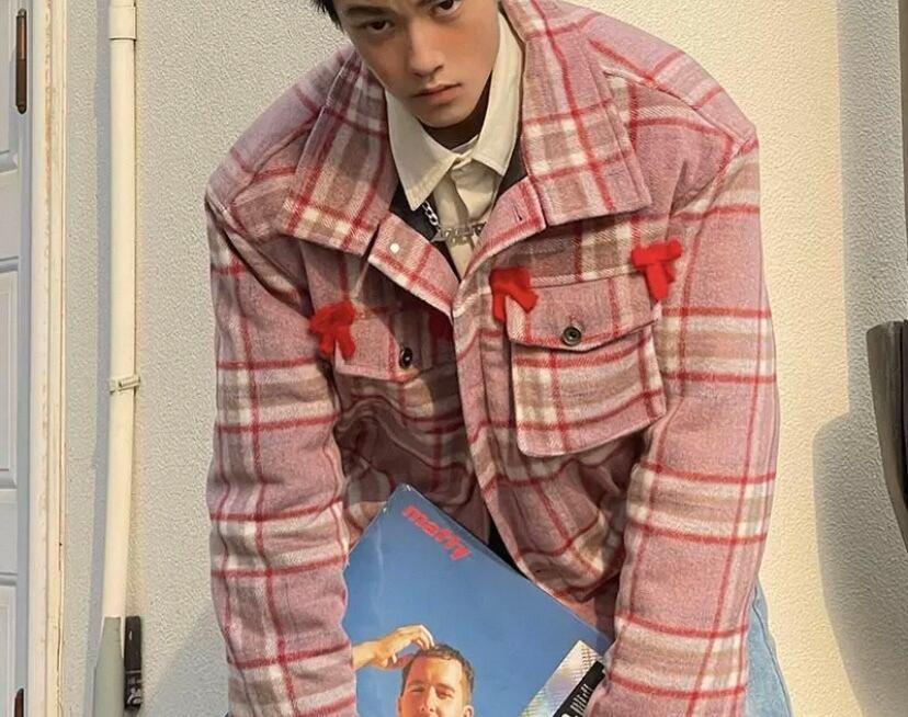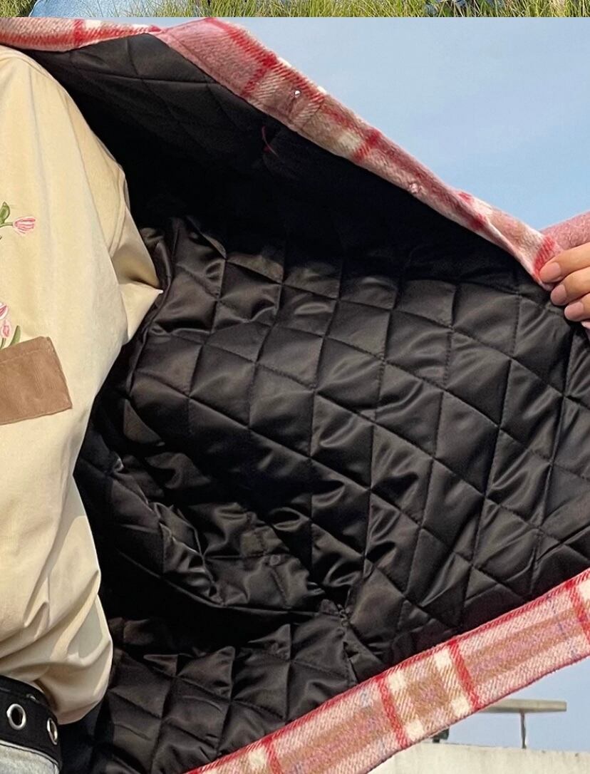 ピンク 赤 チェック、リボン アウター コート、ジャケット、カーディガン、ブルゾン、ユニセックス メンズライク かわいい
