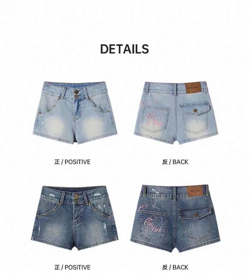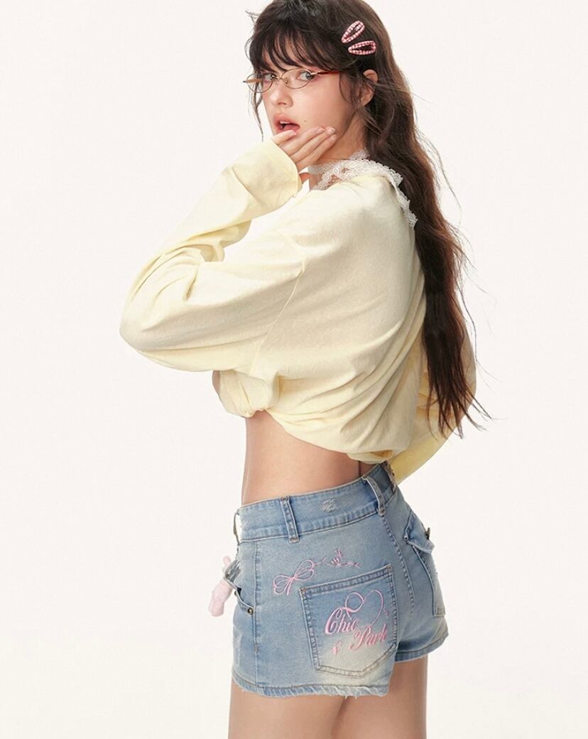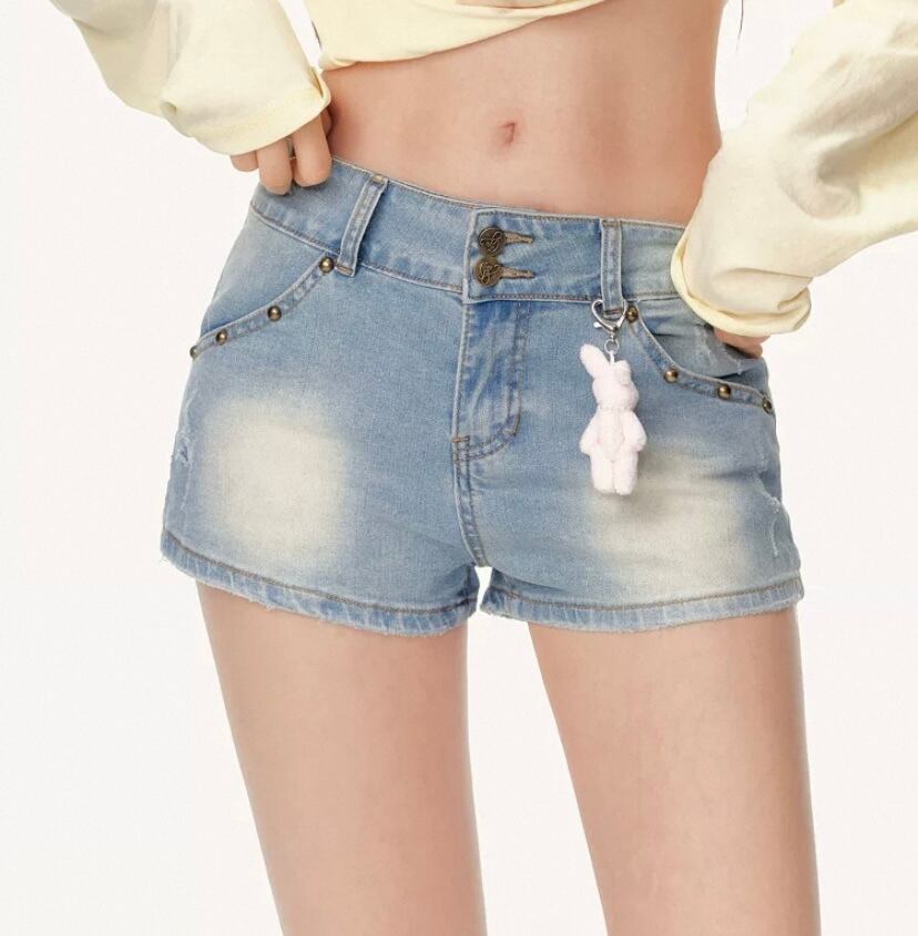 ピンクハート リボン デニム ショート パンツ ホット パンツ ボトムス ギャル ダメージ クラッシュ かわいい