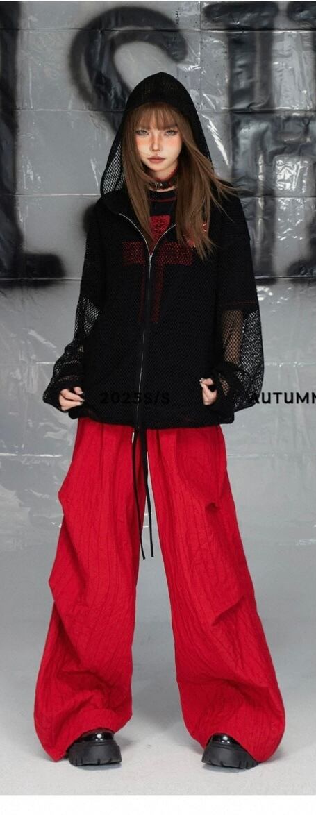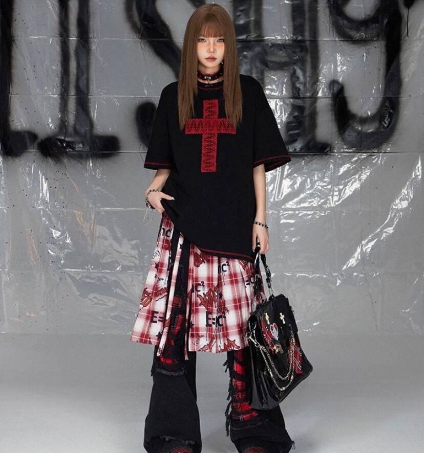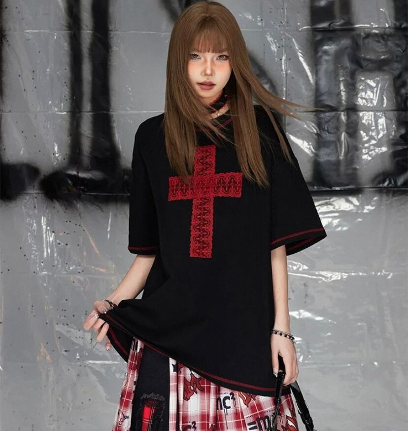 黒 カジュアル Tシャツ、トップス ブラウス クロス 赤 ロック ワイルド ロック