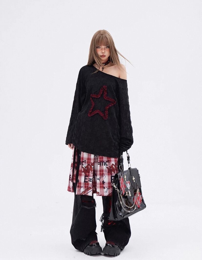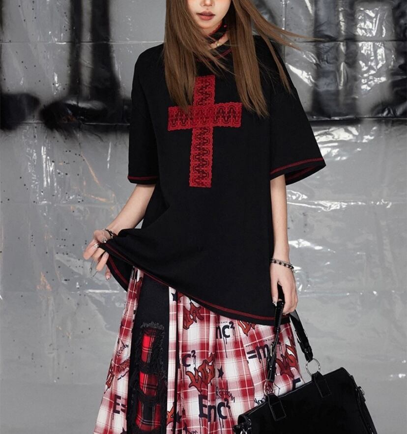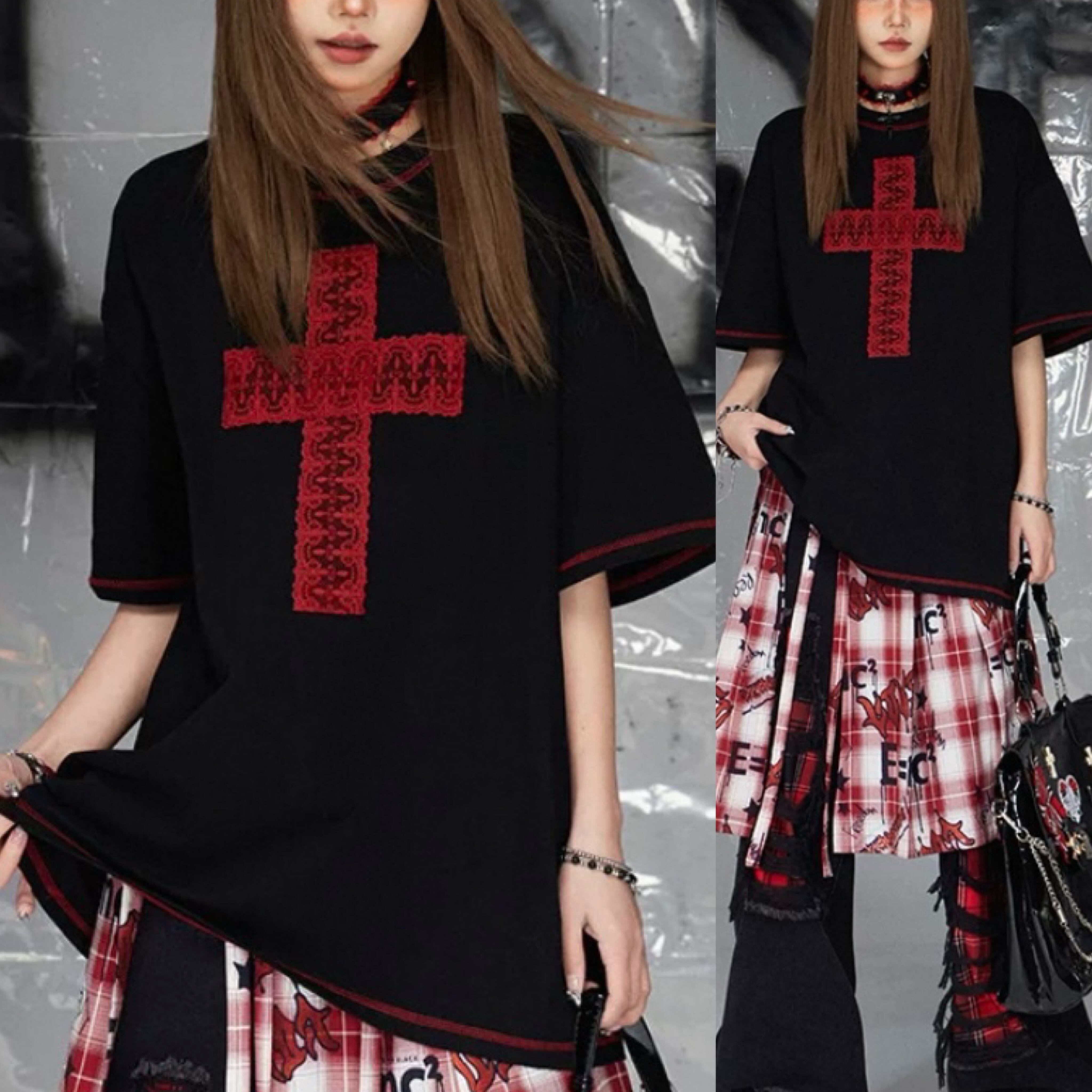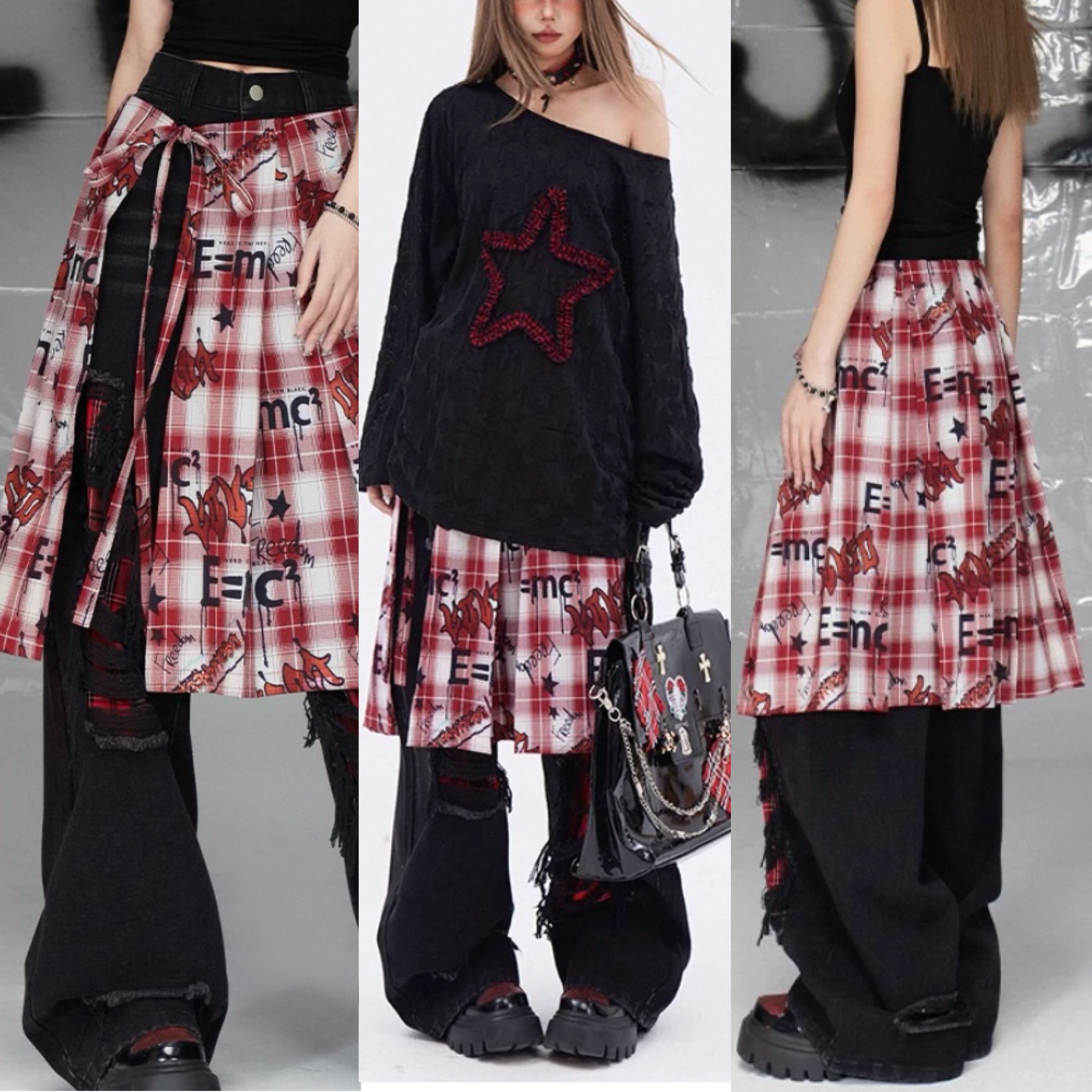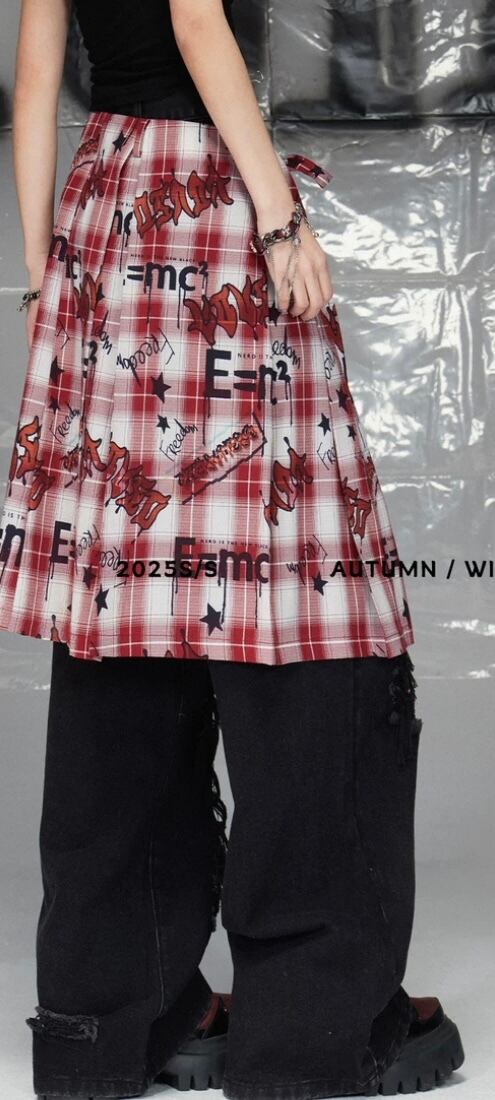 赤 ロック プリーツ スカート シャツ ネルシャツ白 チェック リボン 巻きスカート ボトム ベルト