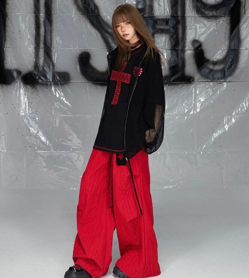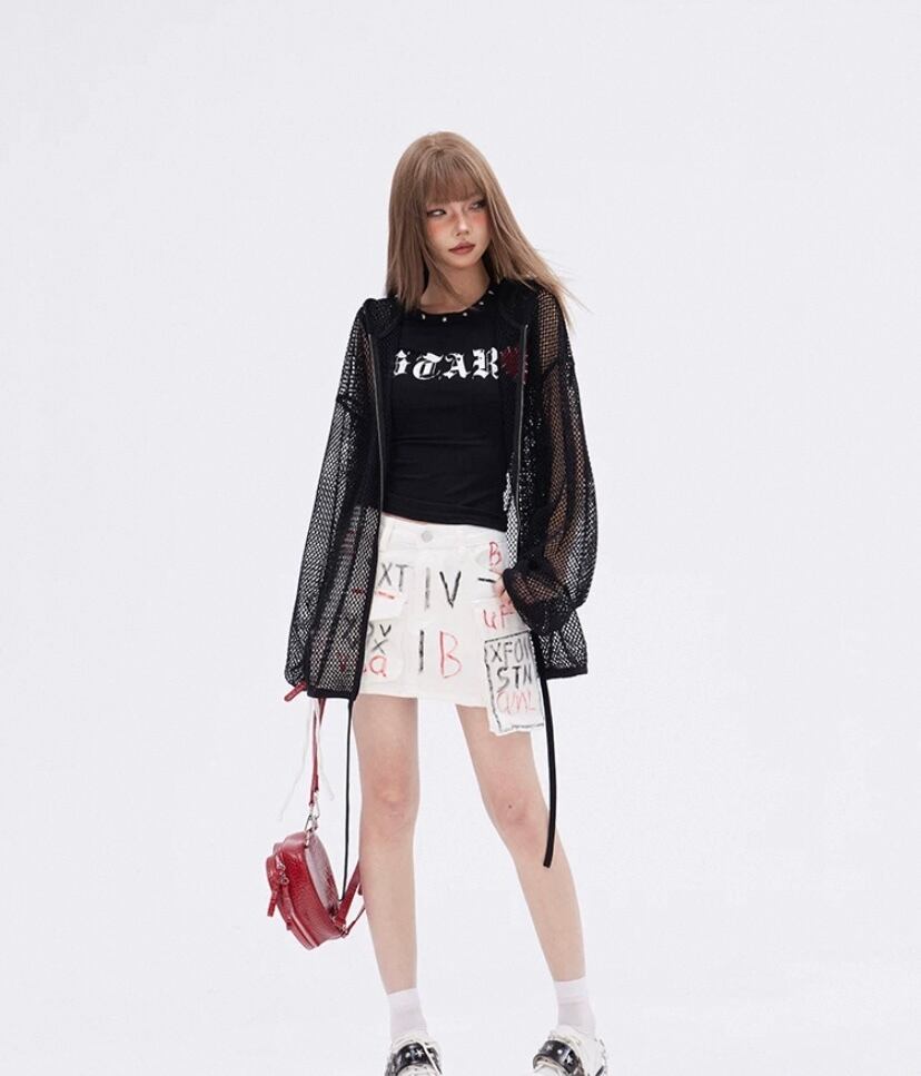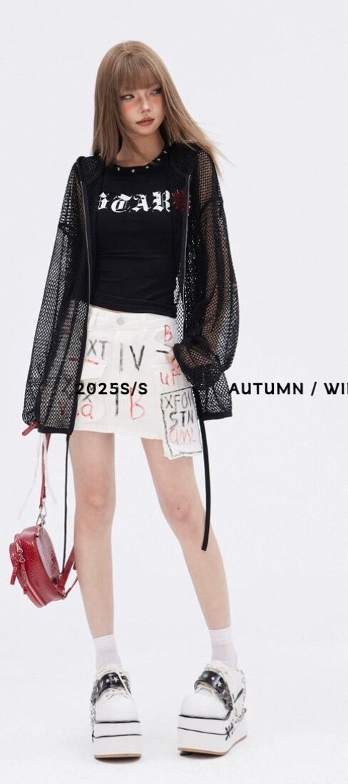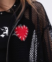 パーカー 黒 フード ハート 赤 メッシュ シースルー