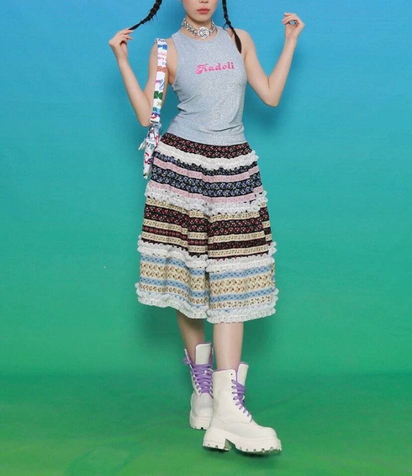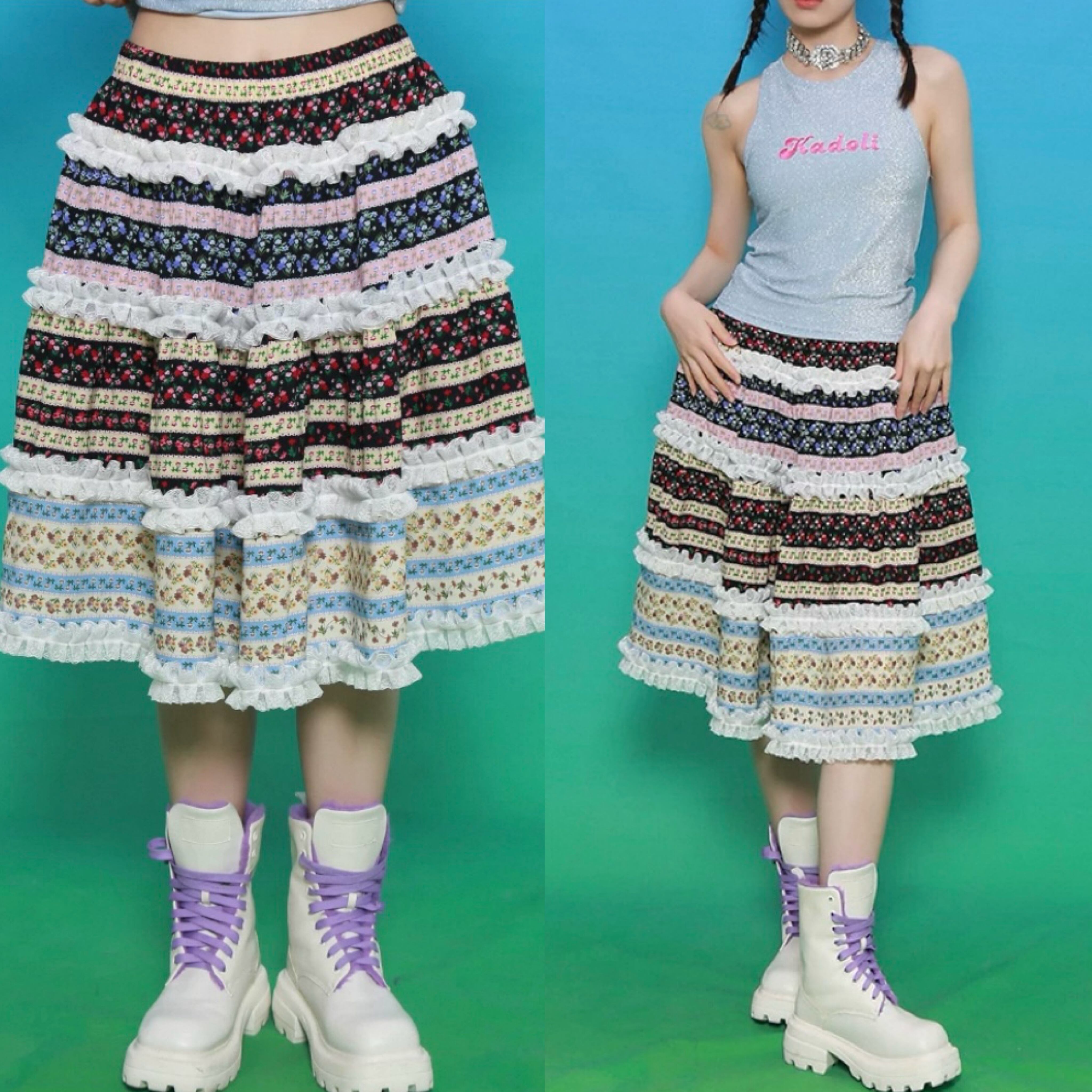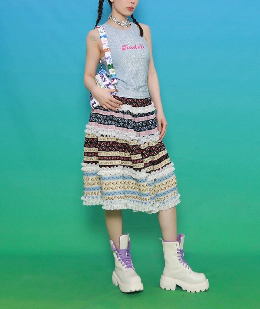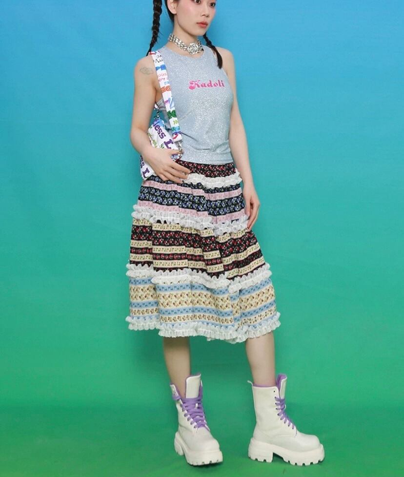 パッチワーク リボン スカート カラフル ボトムス ガーリー、古着 原宿