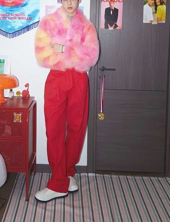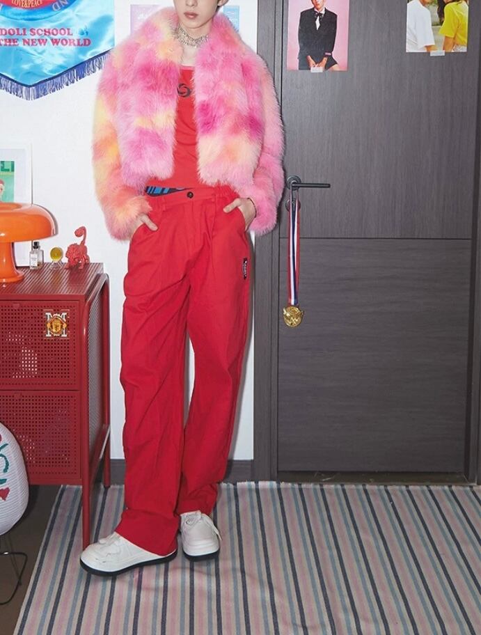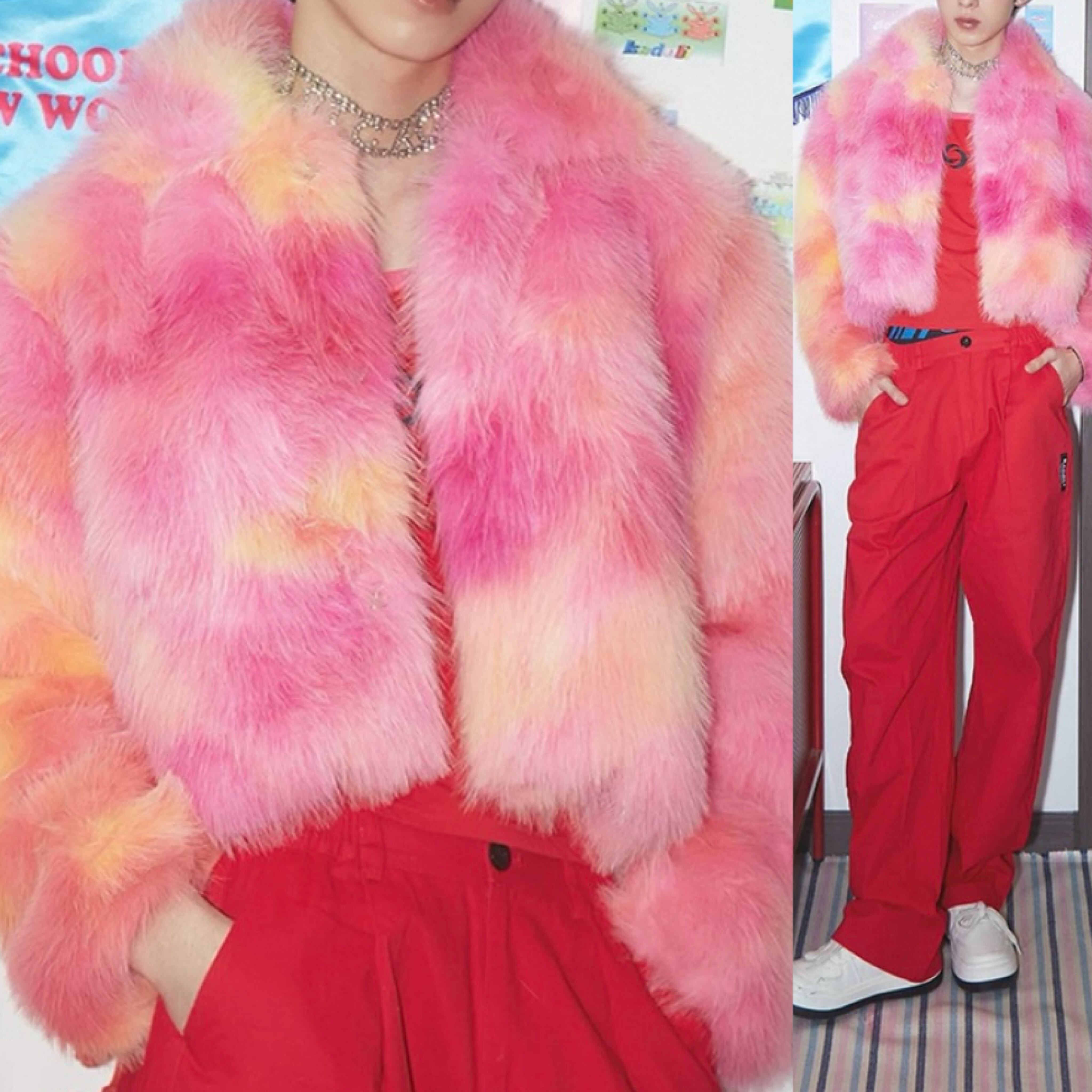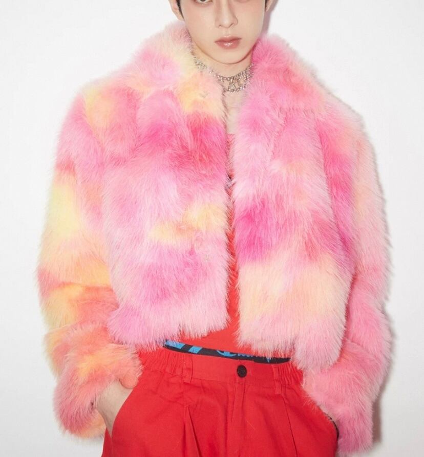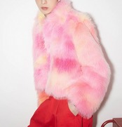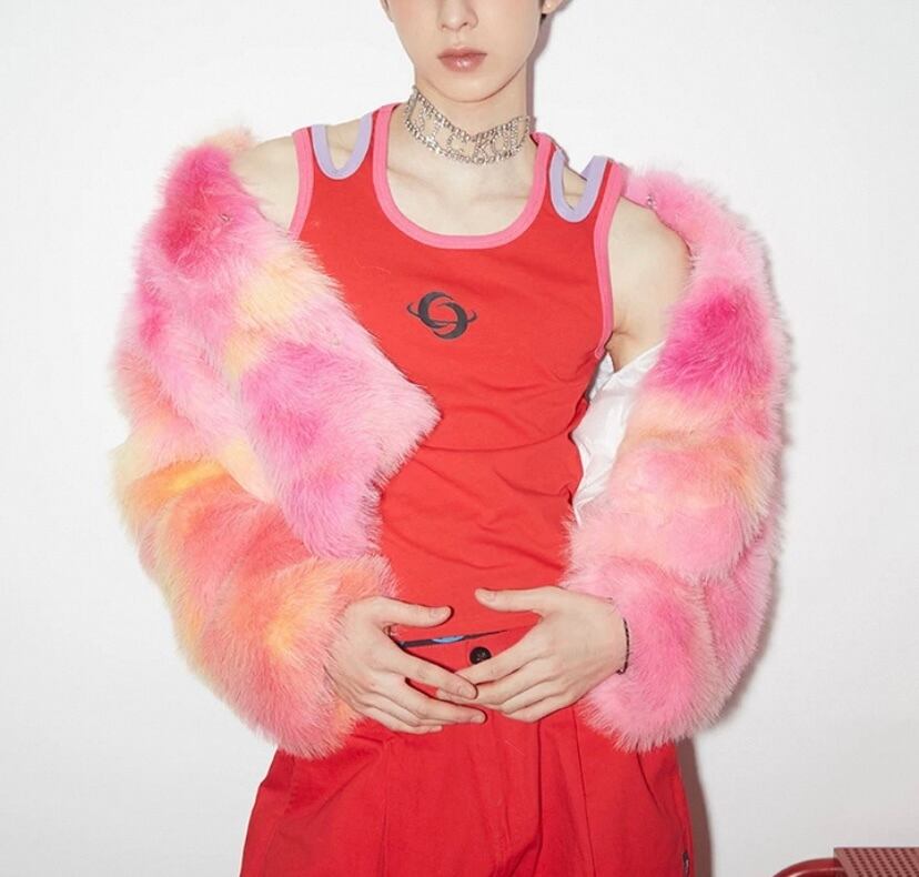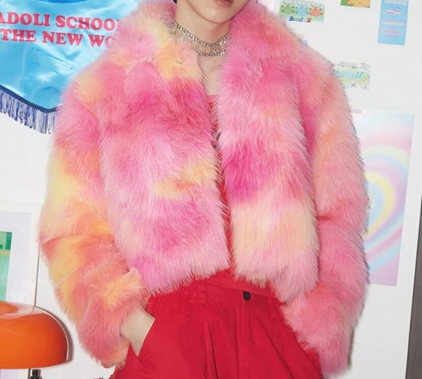 グラデーション ファー、ユニセックス、オレンジ、ピンク ゴージャス、アウター、コートストリート