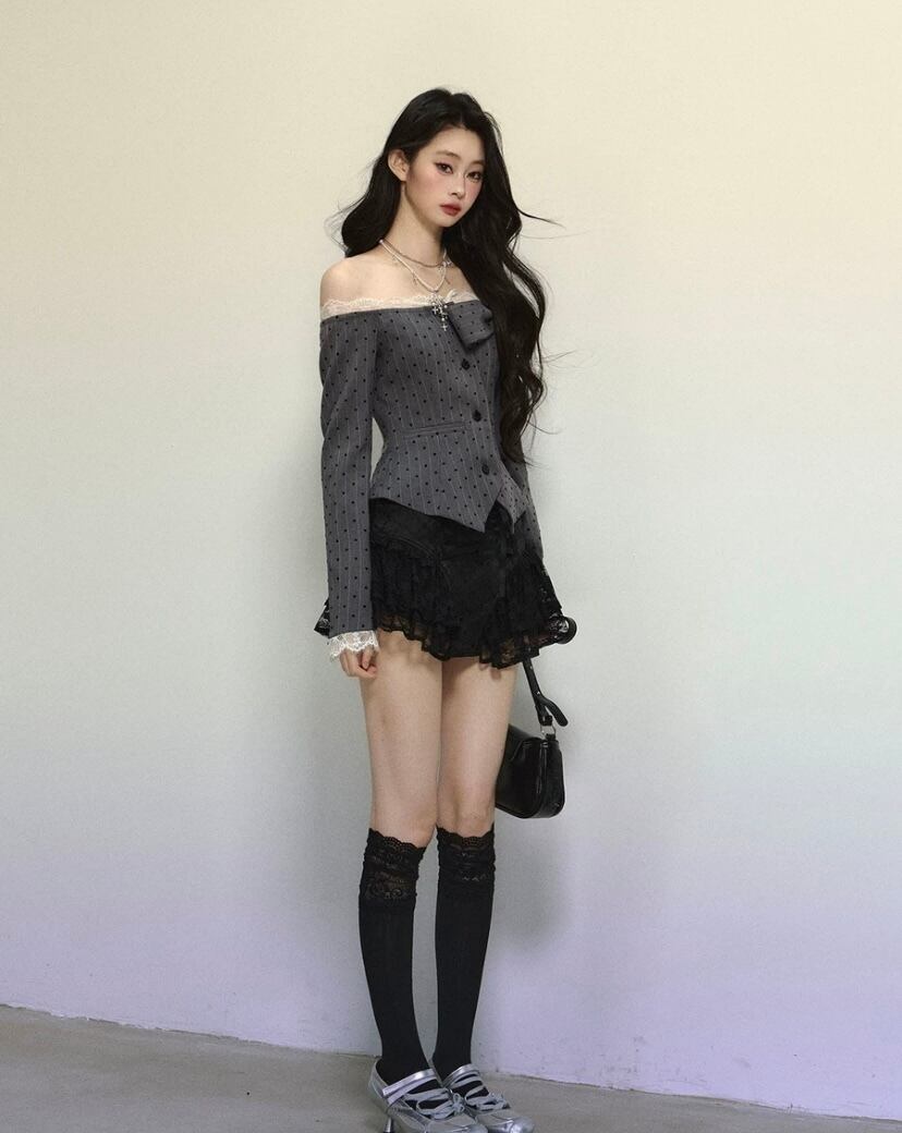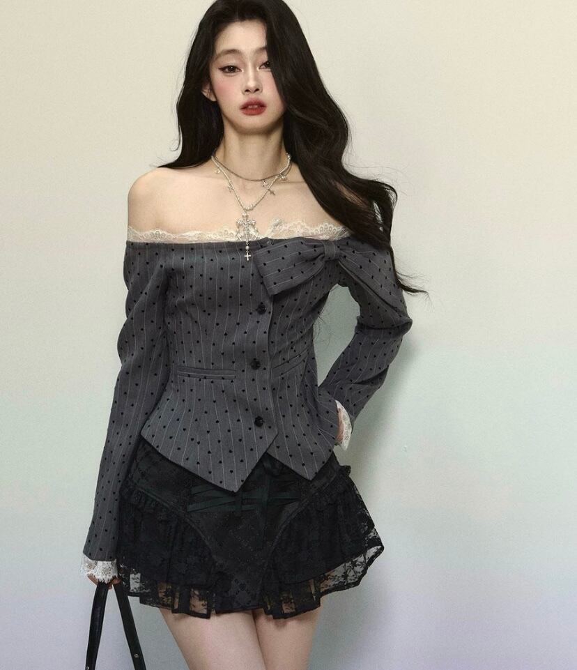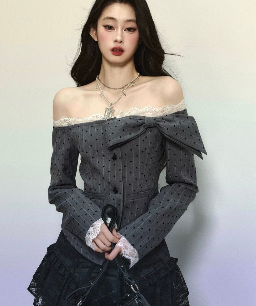 【トップス】グレー リボン ジャケット、カーディガン、ブラウス オフショルダー かわいい ガーリー、お嬢様、セクシー、デコルテ シャツ、トップス、コルセット ベアトップ 原宿、銀座 エレガント