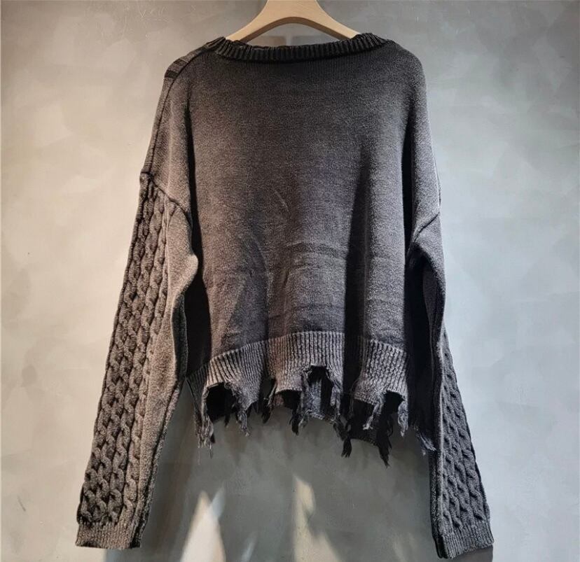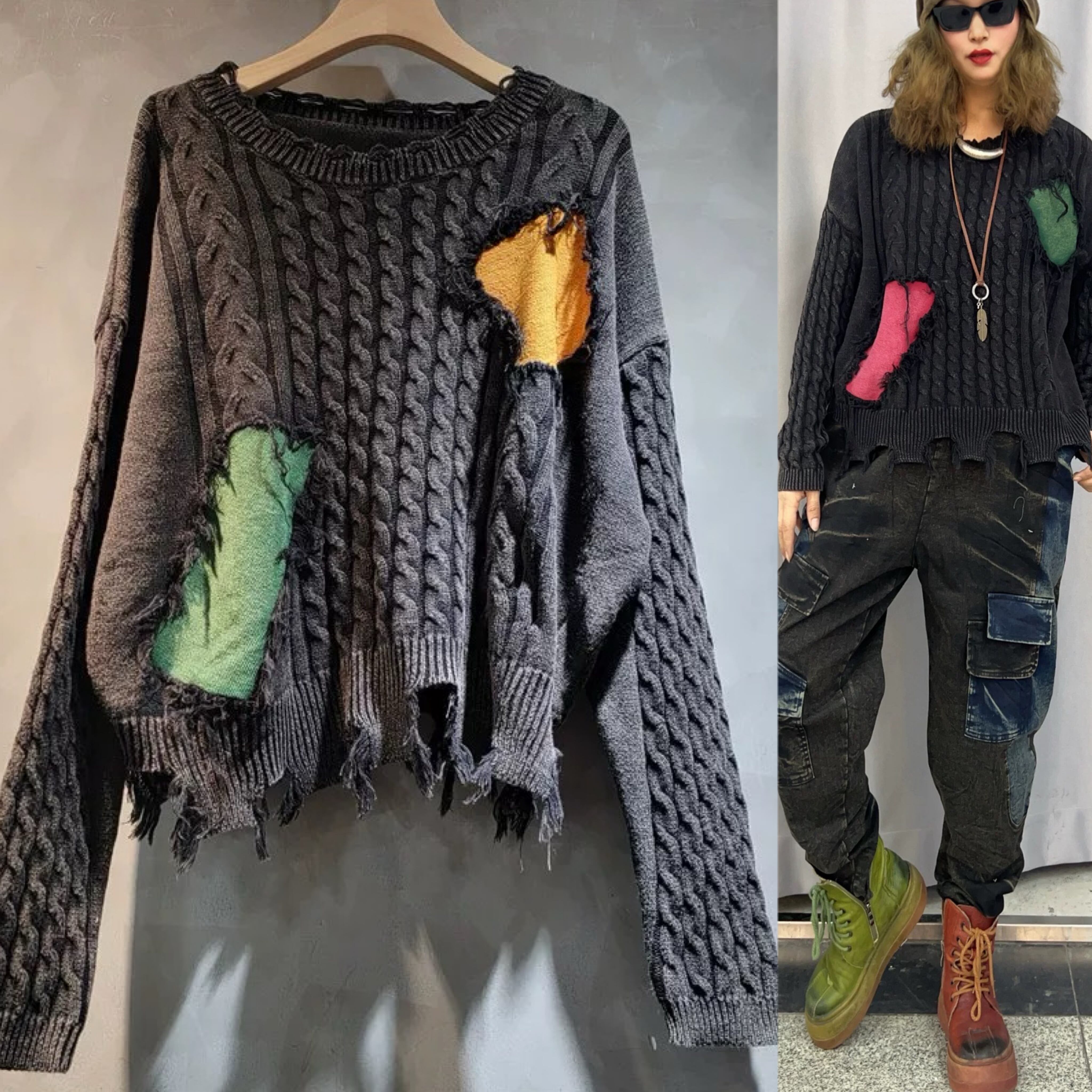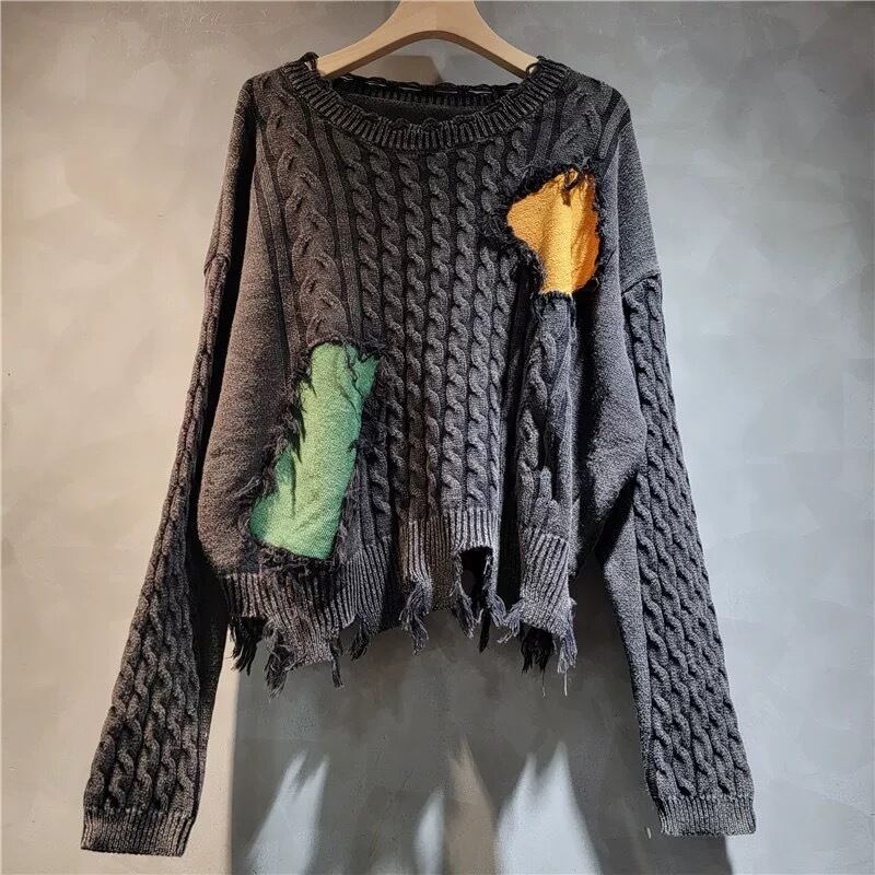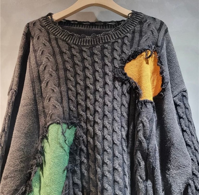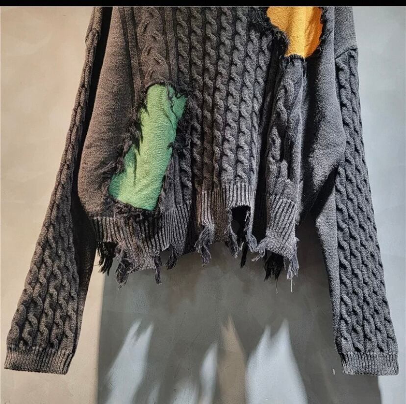 ダメージ パッチワーク、セーター ニット、カーディガン、緑、黄色、ショート丈 トップス、アウター、スウェット トレーナー ストリート、オーバーサイズ カジュアル