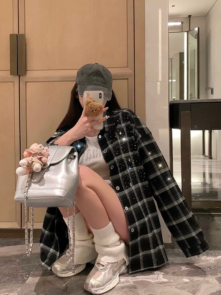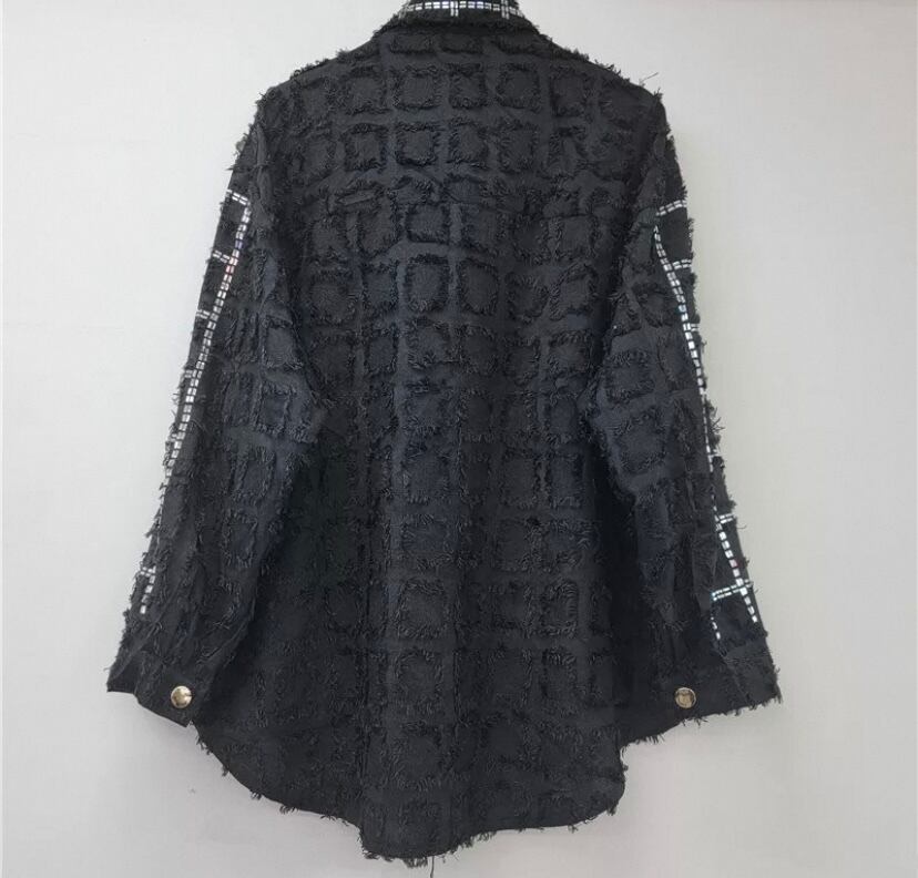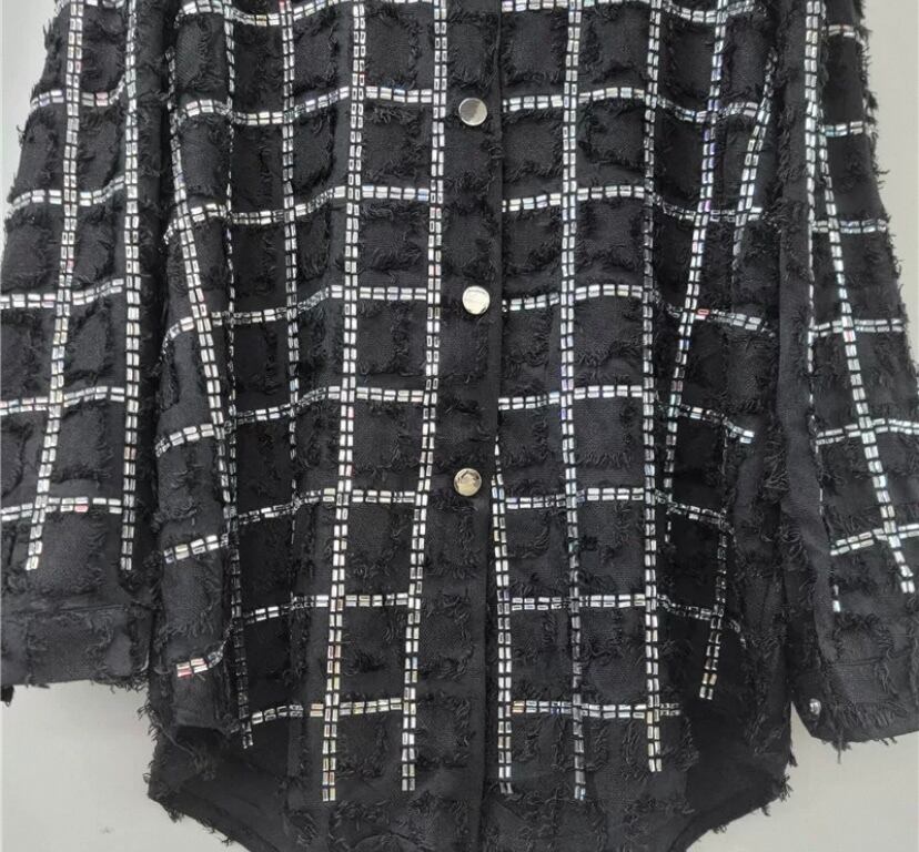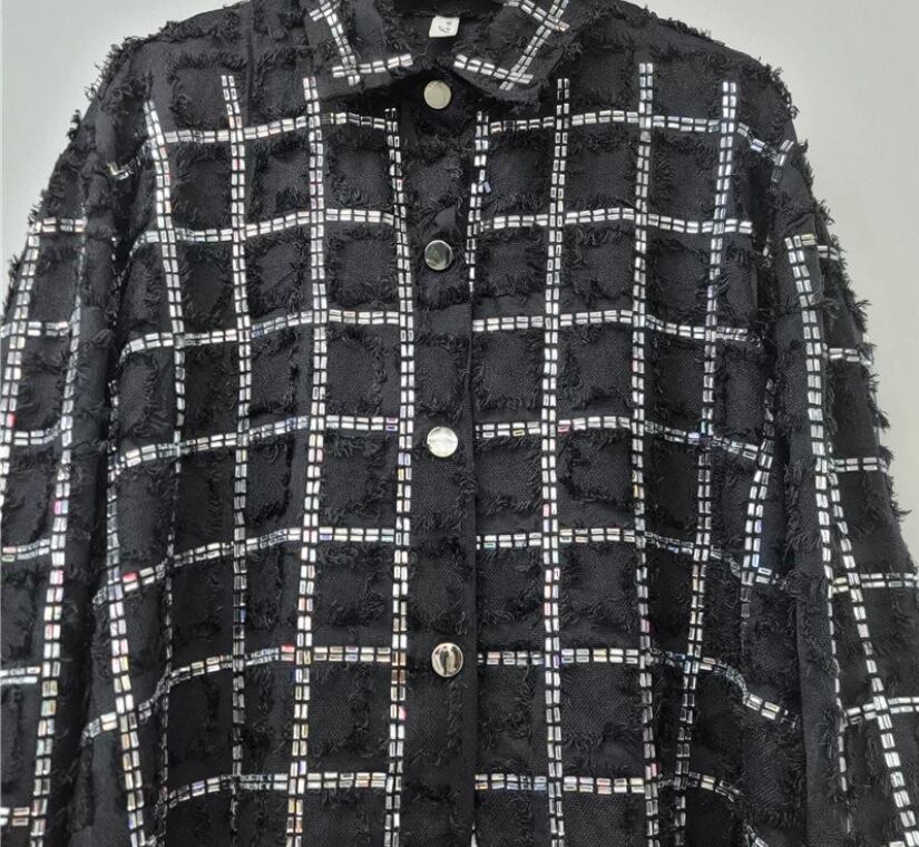 スパンコール、黒チェック、ブラック、トップスシャツブラウス