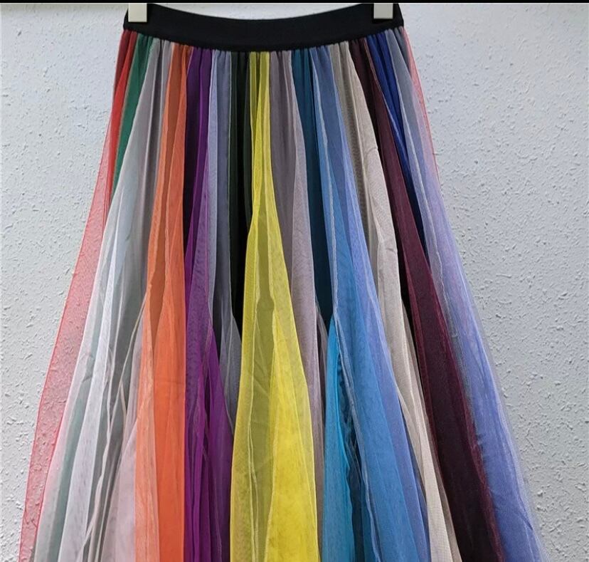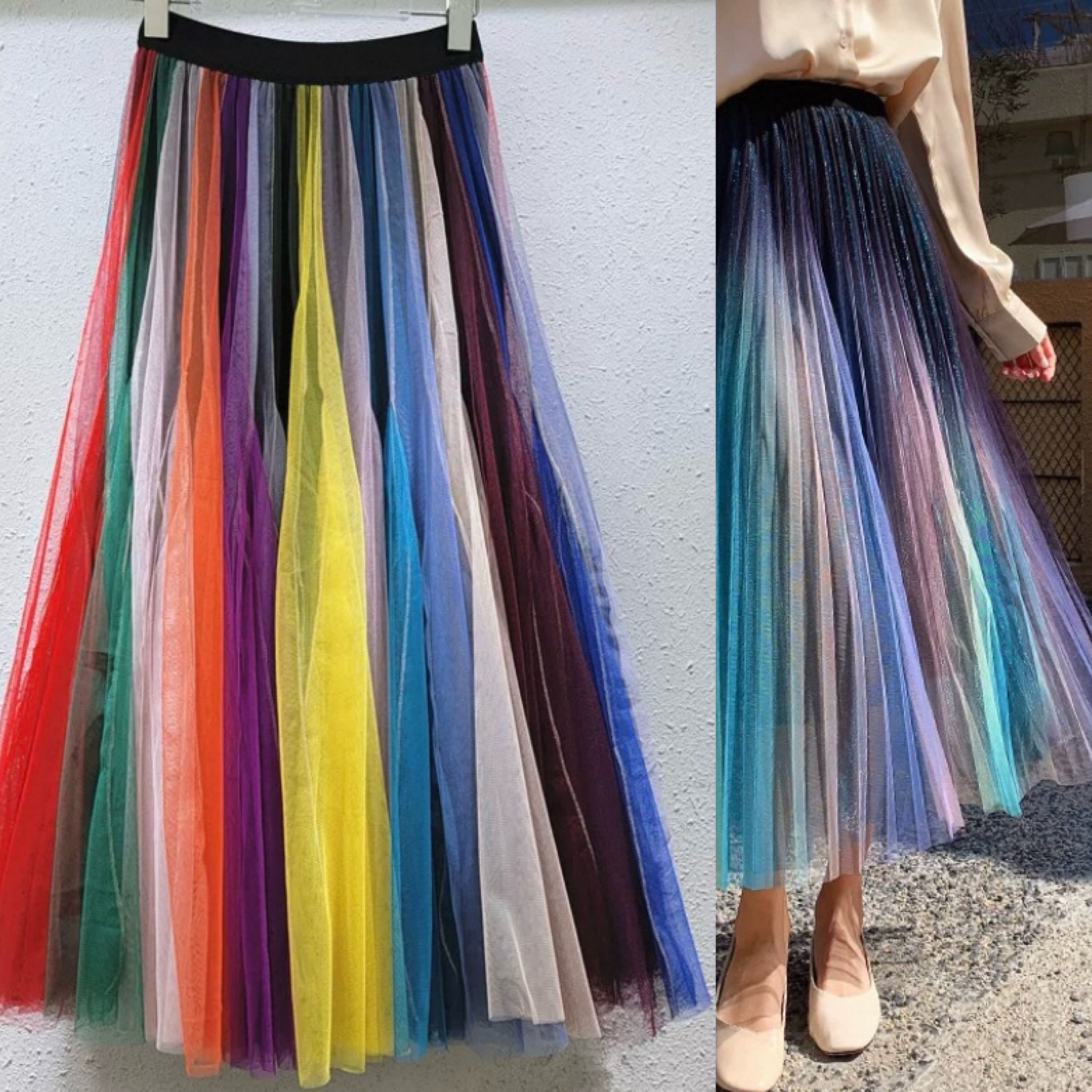 カラフル 黄色 レインボー プリーツスカート マキシスカート ボトムス フレアスカート 黄色 赤 水色 グレー