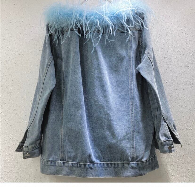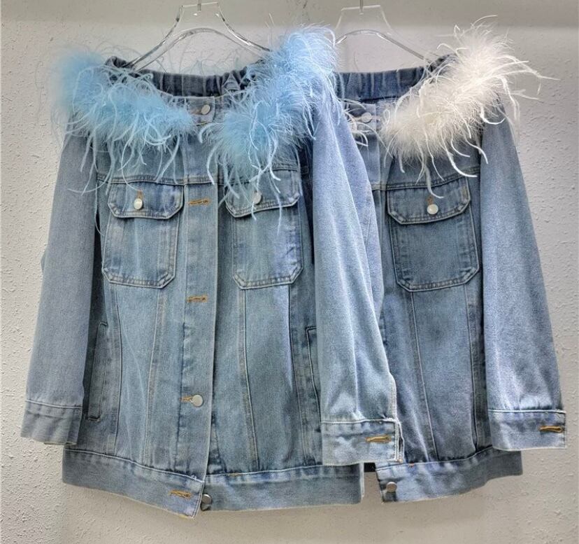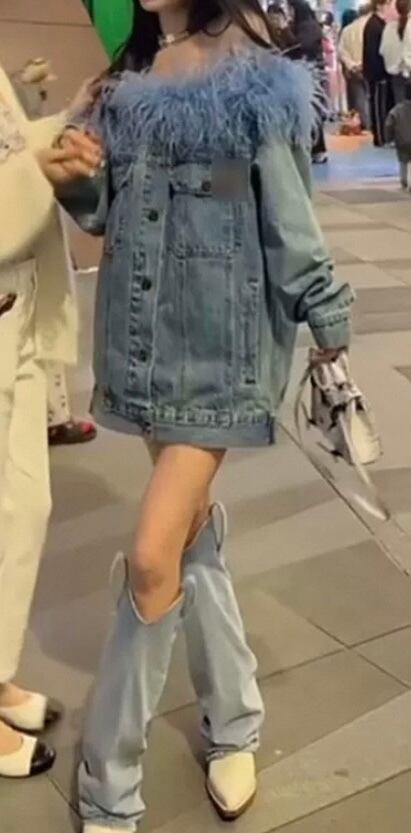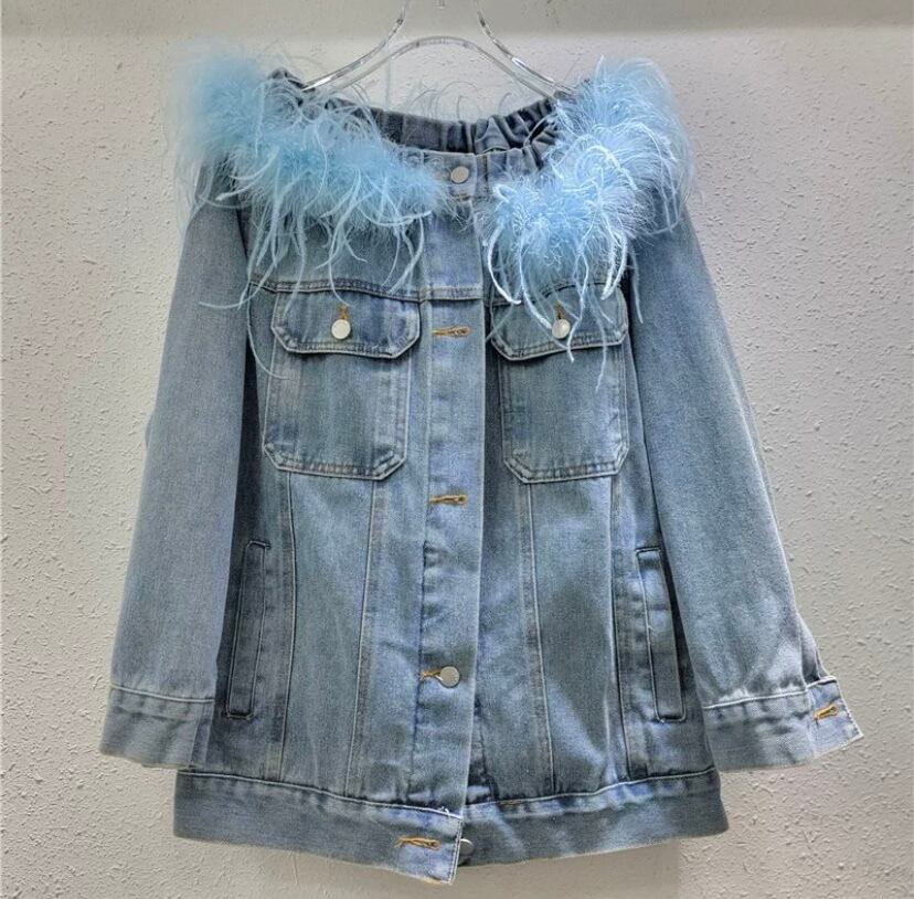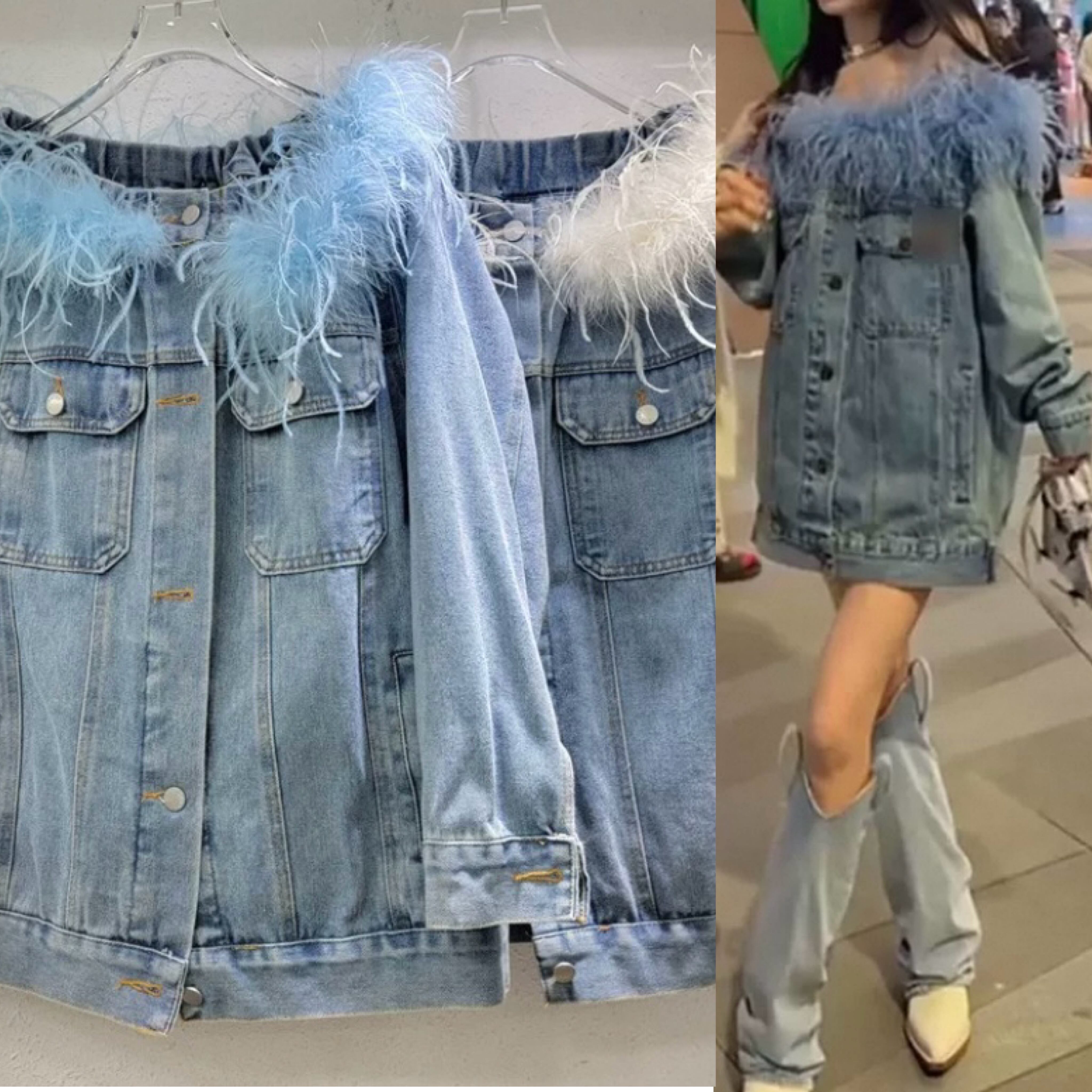 ジャケット アウター コート ワンピース オフショルダー、ファー 白 水色 デニム ジージャン ワンピース、カジュアル エレガントガン