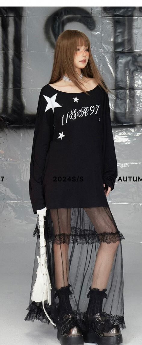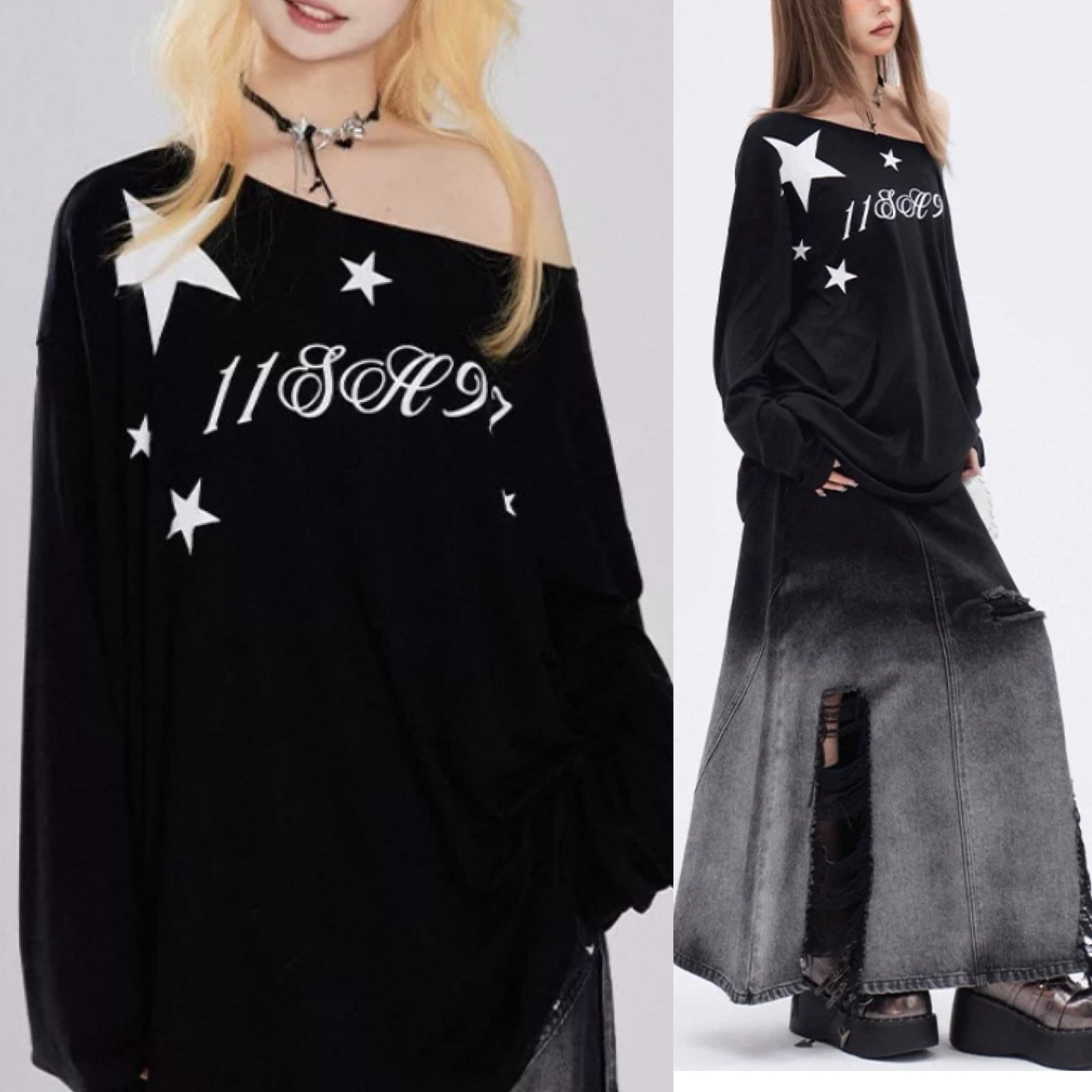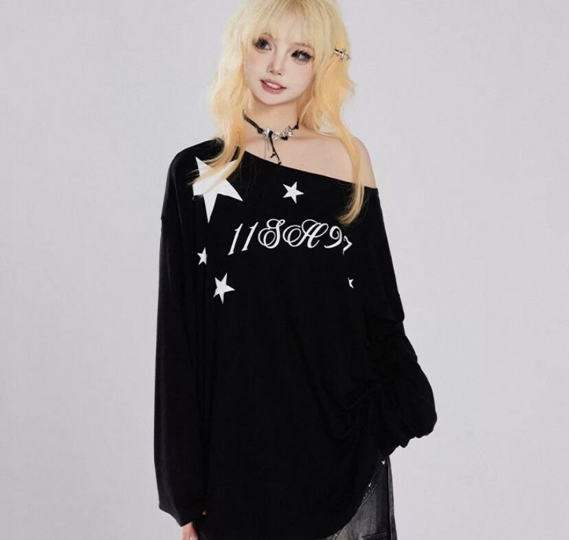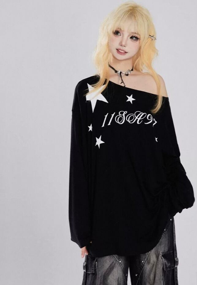 セーター、トップス 星 黒 ブラック ブラウス、トップス、カジュアル スウェット トレーナー パーカー オフショルダー かわいい 原宿 ロック 渋谷 ギャル