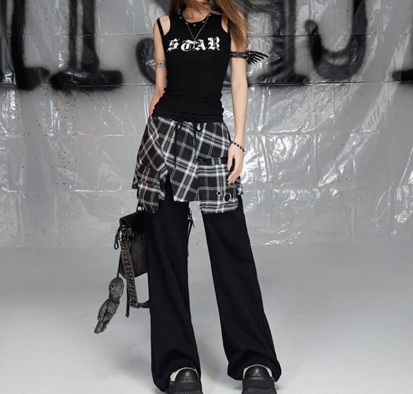 キャミソール タンクトップ、黒 白 星 メッシュ オフショルダー、トップス、ブラウス、ロック 原宿、渋谷 ギャル パンク かわいい