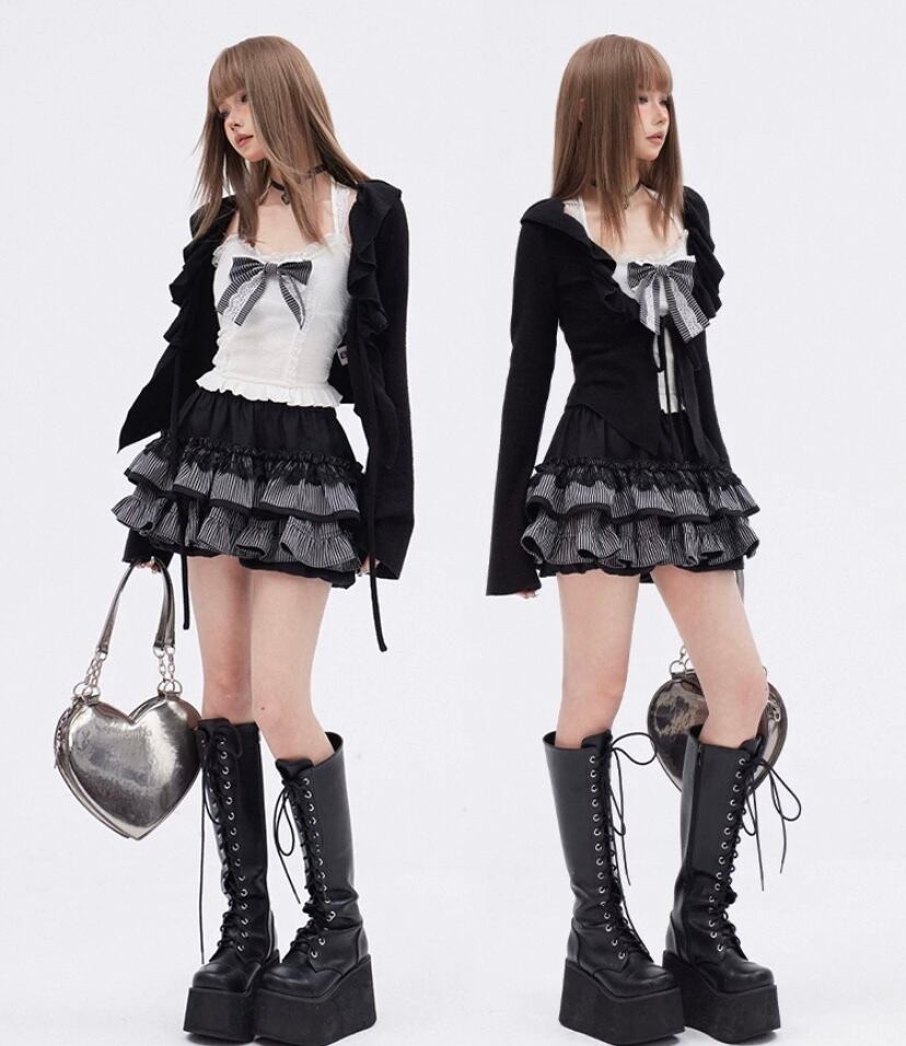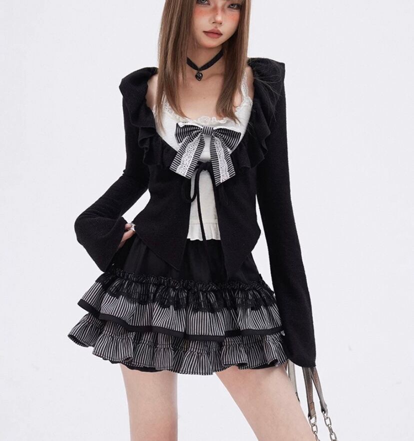 【3セット】黒 白、キャミソール、ミニスカート、フリル、ボトムス リボン、黒 カーディガン、トップス セットアップ、かわいい ガーリー、原宿、セクシー