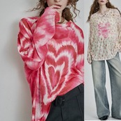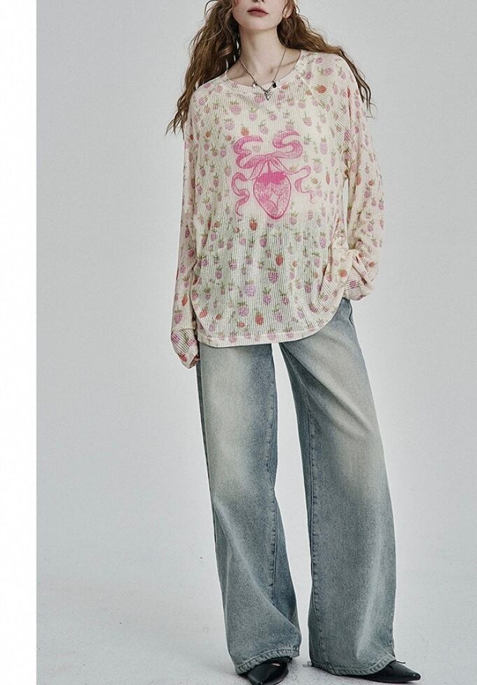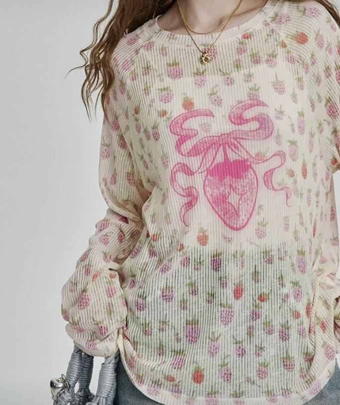 トップス Tシャツ、カジュアル ハート かわいい。イチゴ ブラウス Tシャツ。ロンT スウェット 原宿 かわいい 花柄、赤 ピンク
