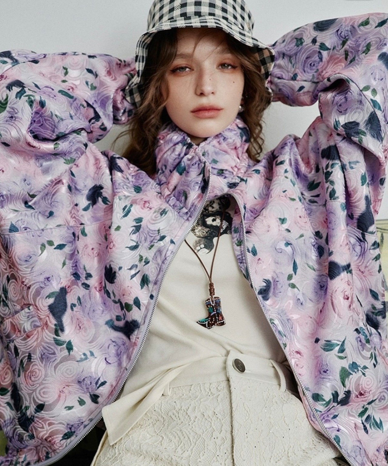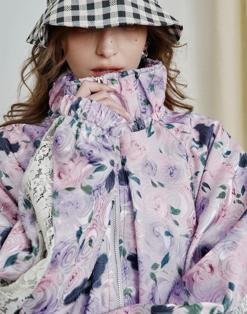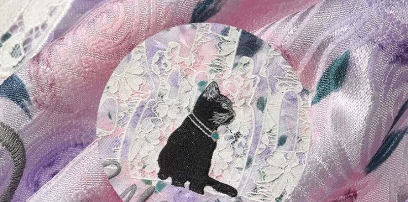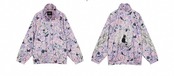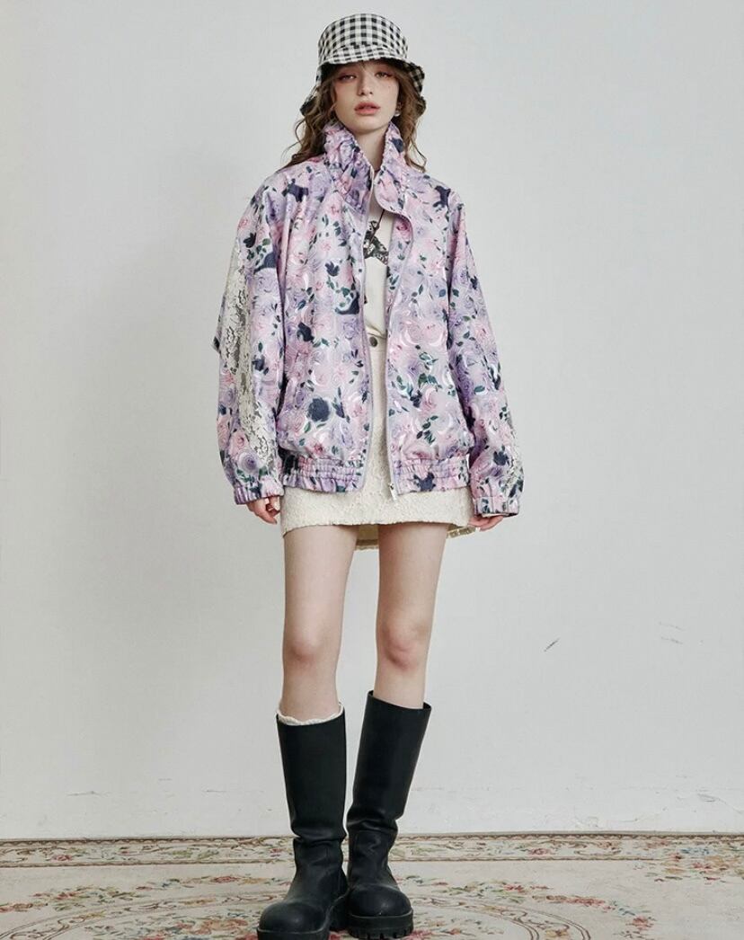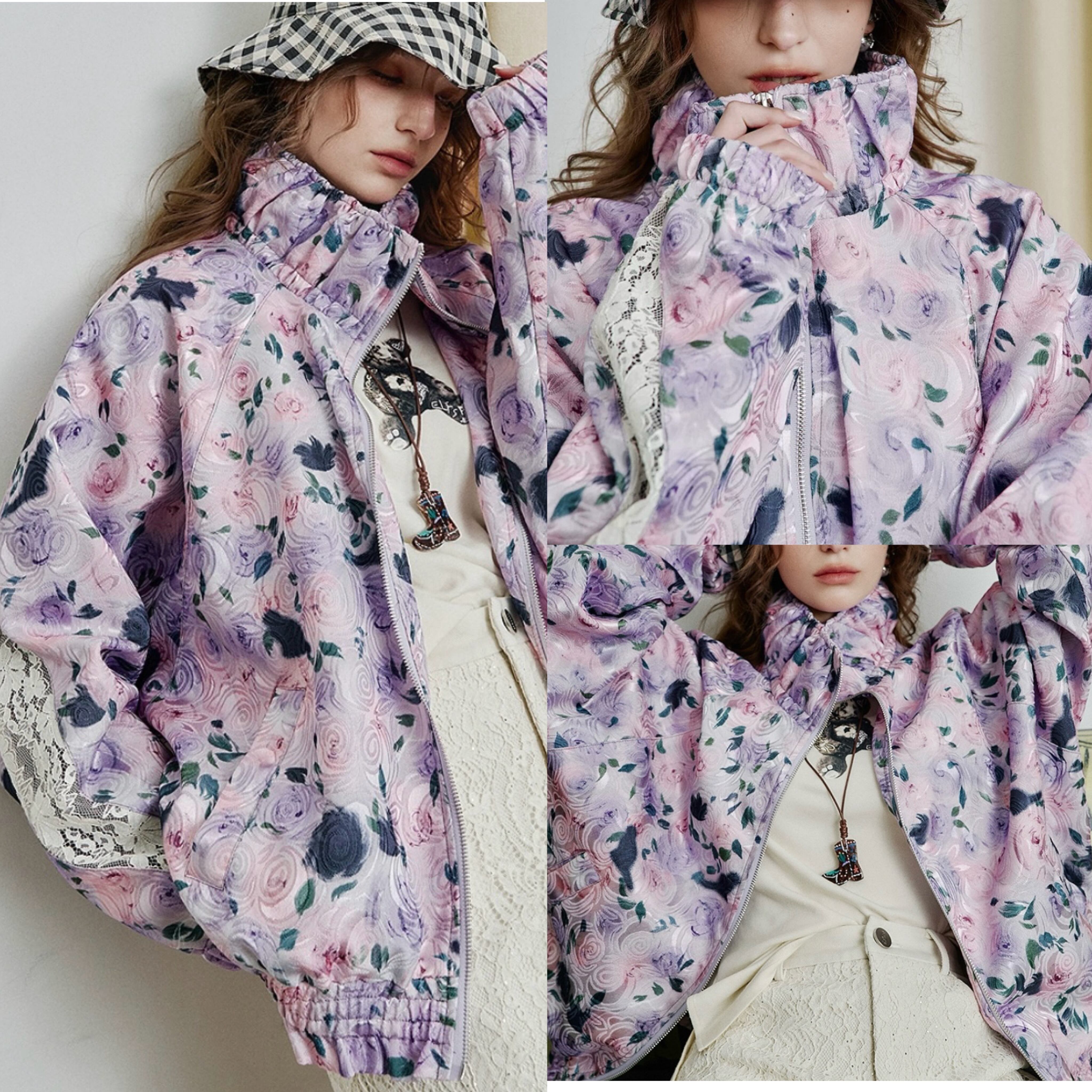 紫 フラワー 花柄 薔薇 バラ、ピンク 黒猫 キャット ペット レース ジャケット、ジャンバー ブルゾン、アウター、カーディガン コート かわいい 原宿 華やか、お嬢様、スポーツ ウィンドブレーカー、キャンプ アウトドア