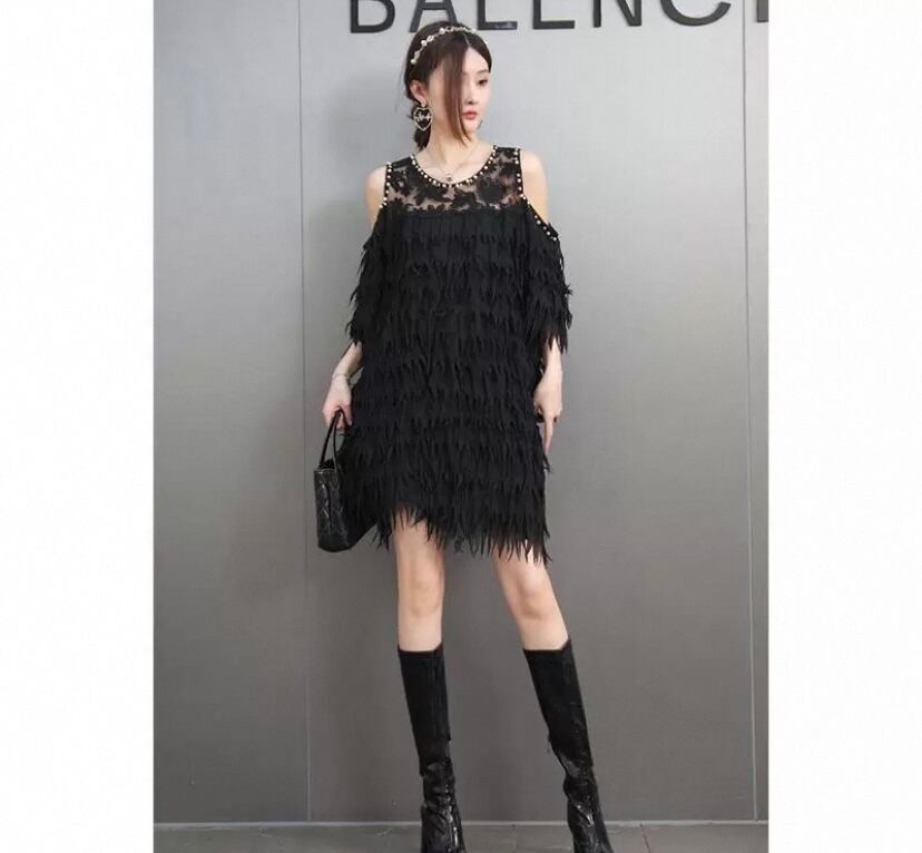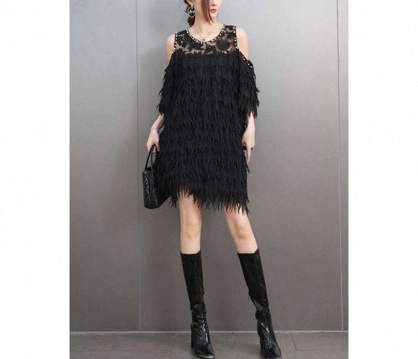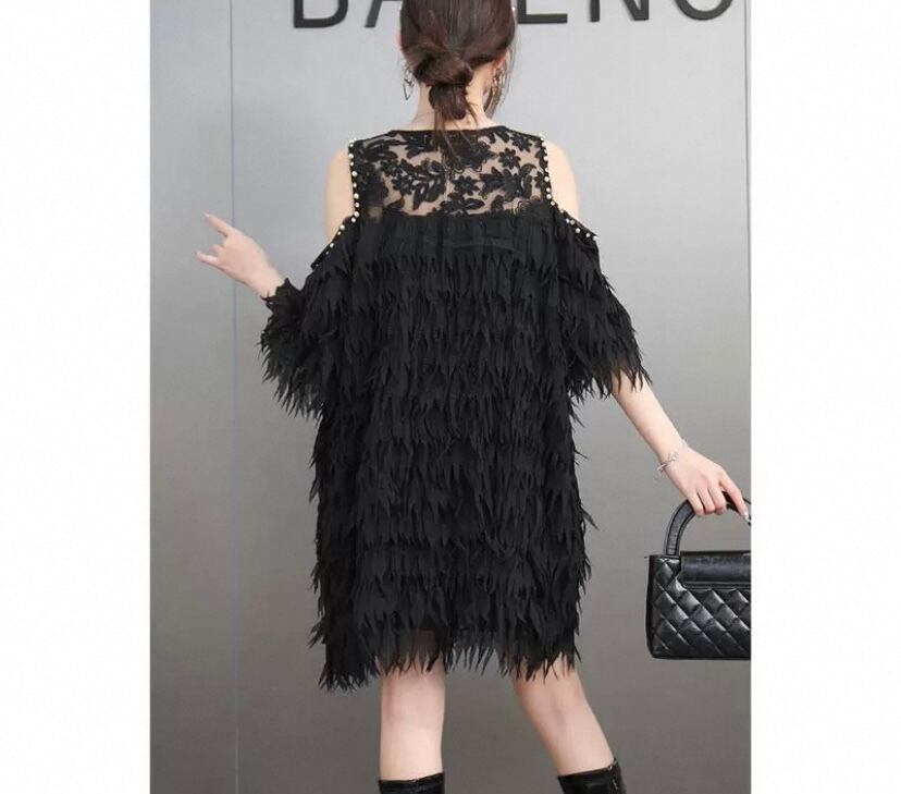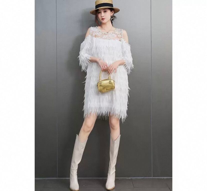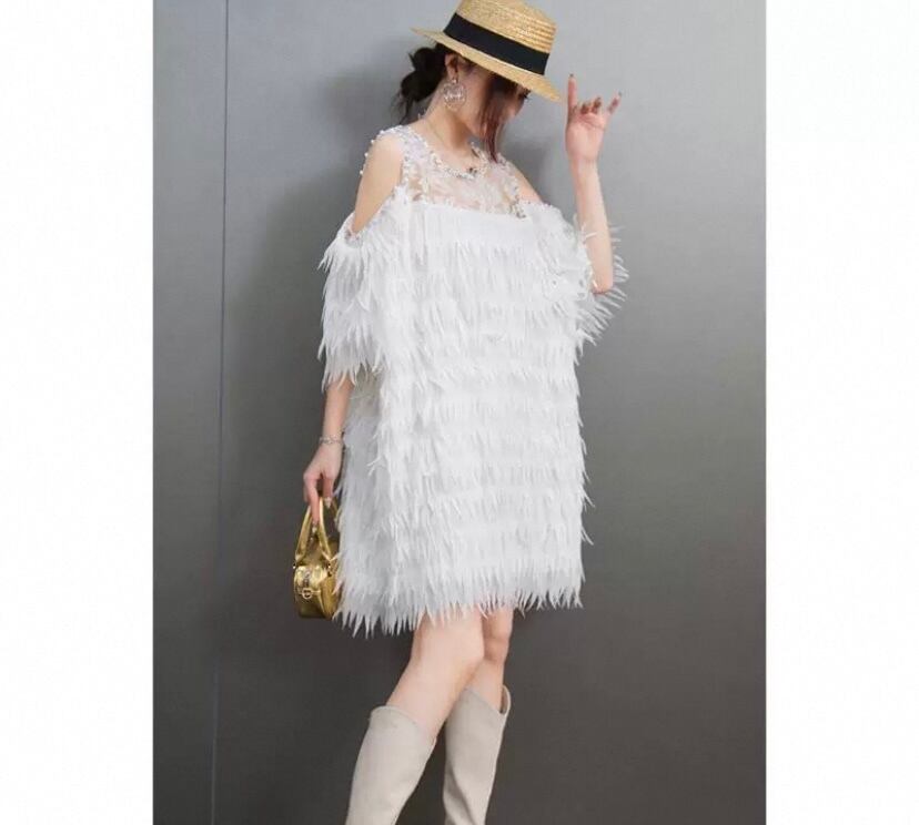 白 黒 オフショルダー、エレガント、ミニスカート ブラウス、トップス、チュニック ワンピース、レース オフショルダー 型 黒 花柄、ファー 羽 フェザー ゴージャス ドレス チュニック