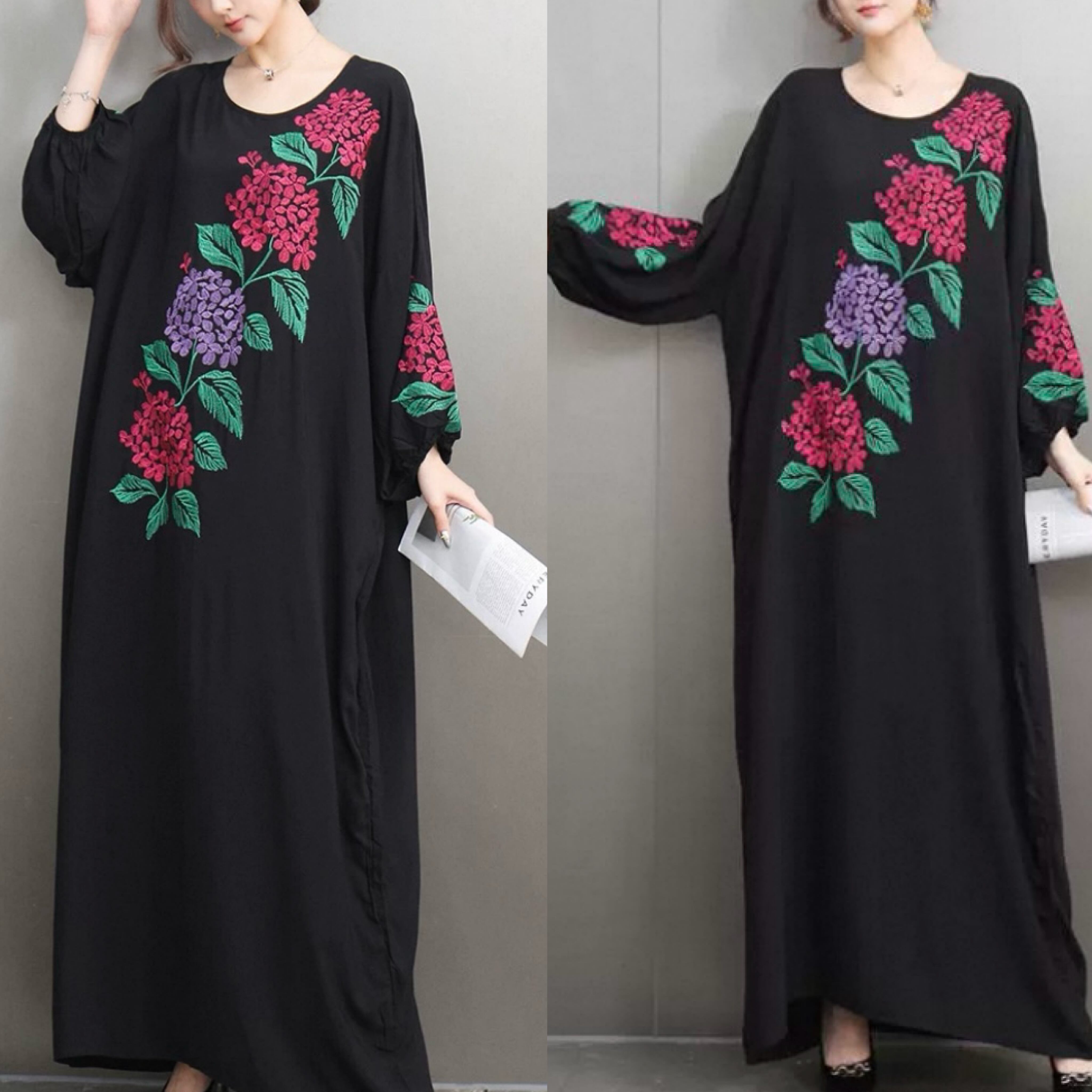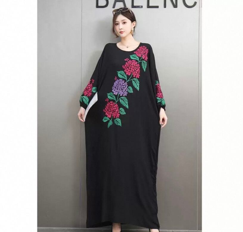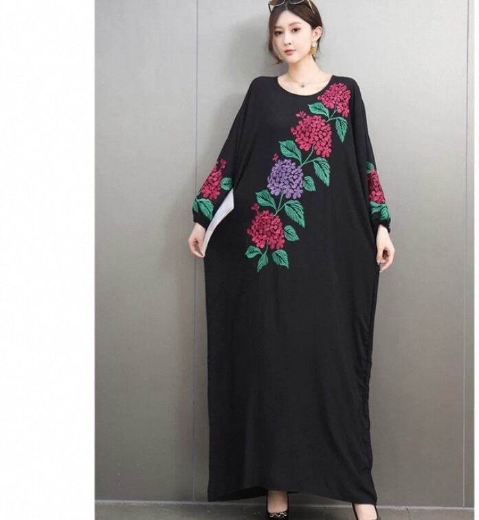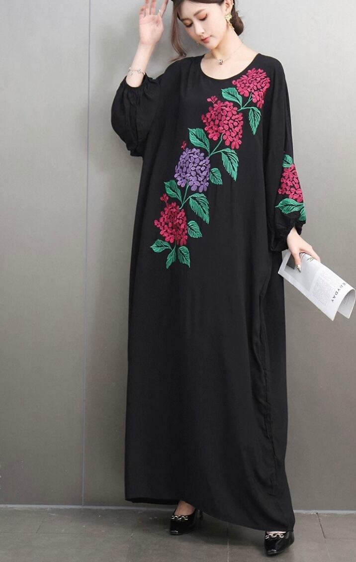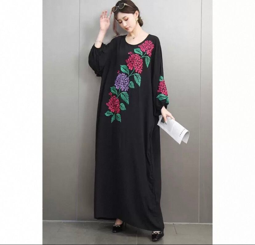 黒 紫陽花、ピンク、紫 花柄 フラワー エレガント マキシスカート ワンピース ロング 黒 チュニック ブラウス、XL ゆったり