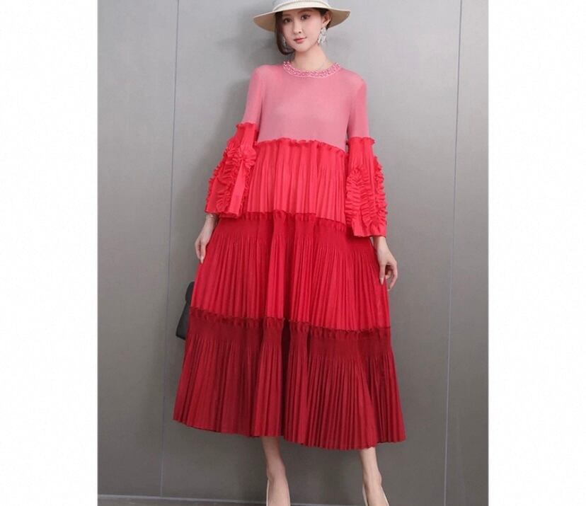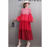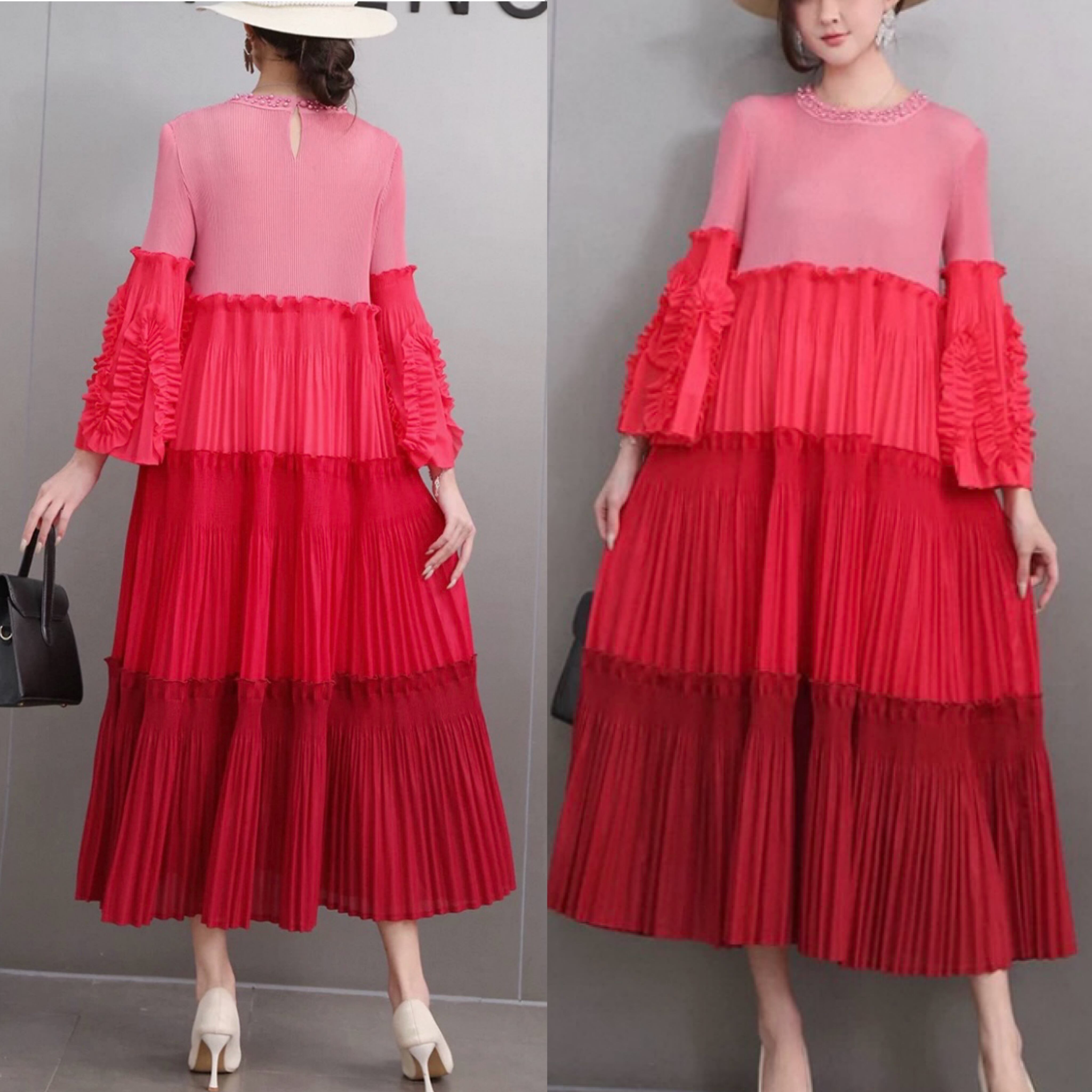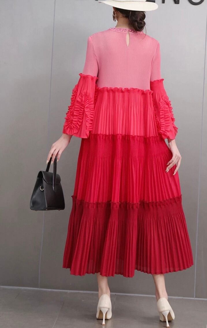 ピンク、赤 グラデーション、ボーダー ワンピース、マキシ、ブラウス、シンプル、カジュアル、ゆったり、XL チュニック エレガント