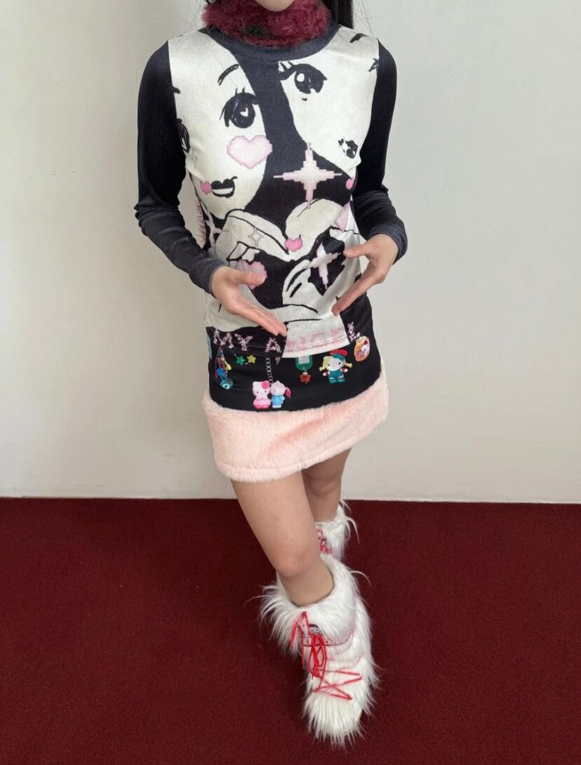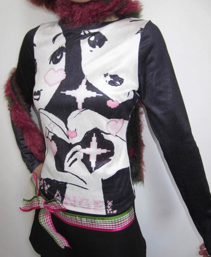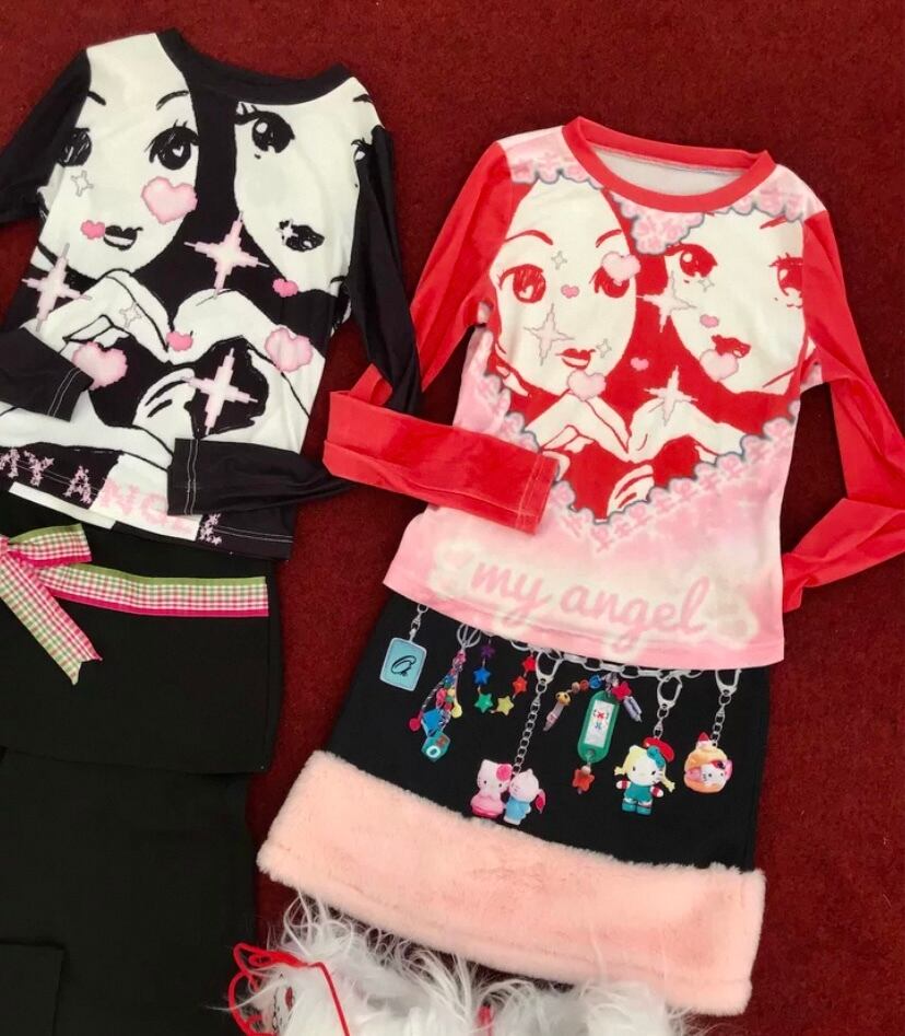 トップス、黒 赤 人形、かわいい Tシャツ。ロングT シャツ ブラウス、トップス 原宿 ガーリー、赤 黒 人形