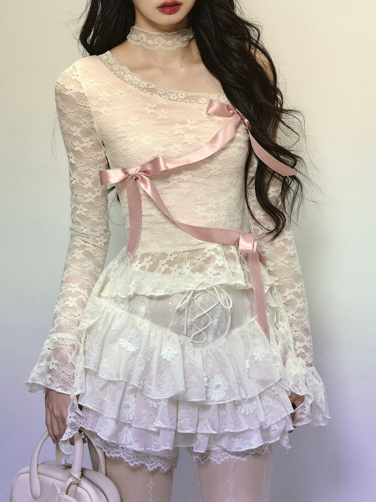 レース 白 ホワイト リボン、かわいい ガーリー、トップス
