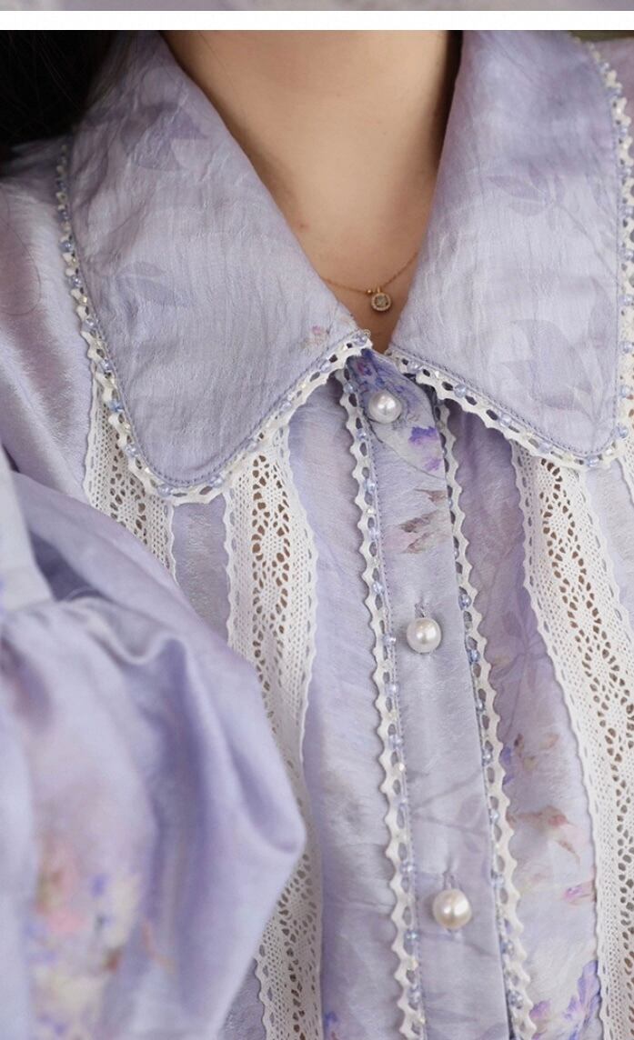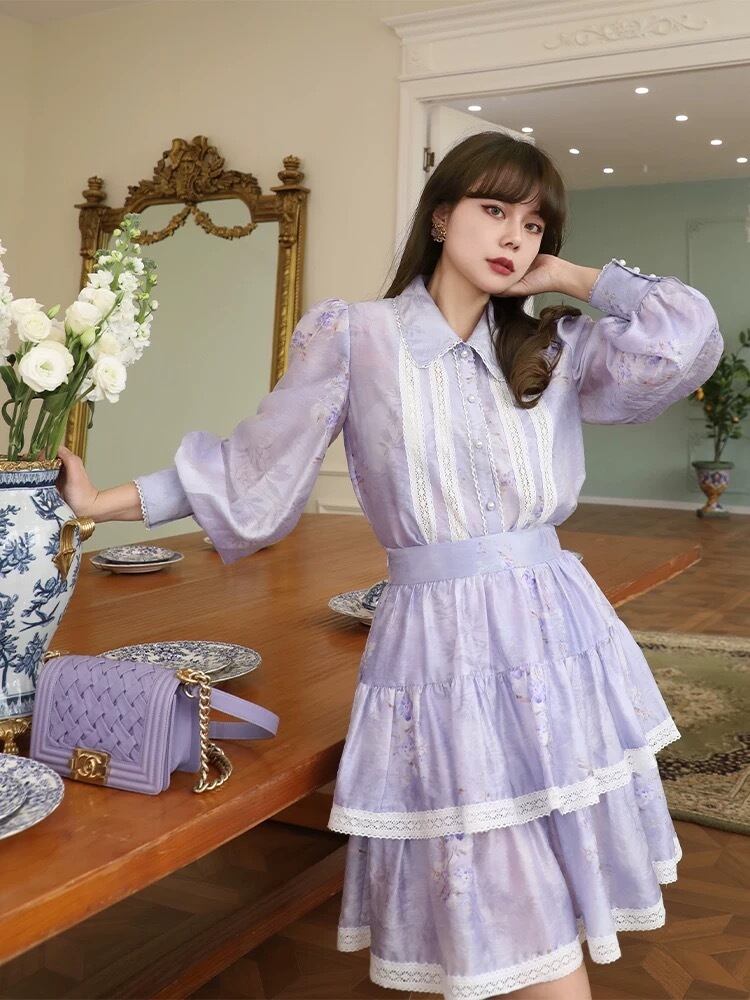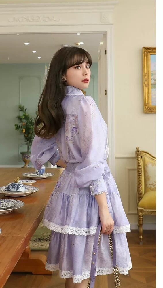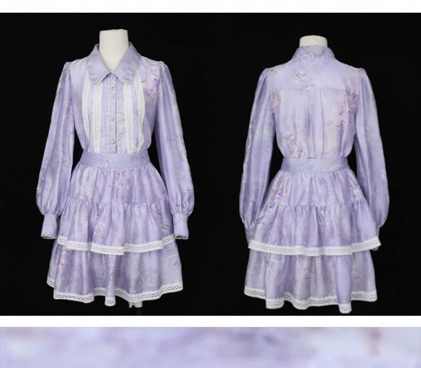 セットアップ スーツ ブラウス、紫 花柄、フレア スカート、ボトムス エレガント お嬢様