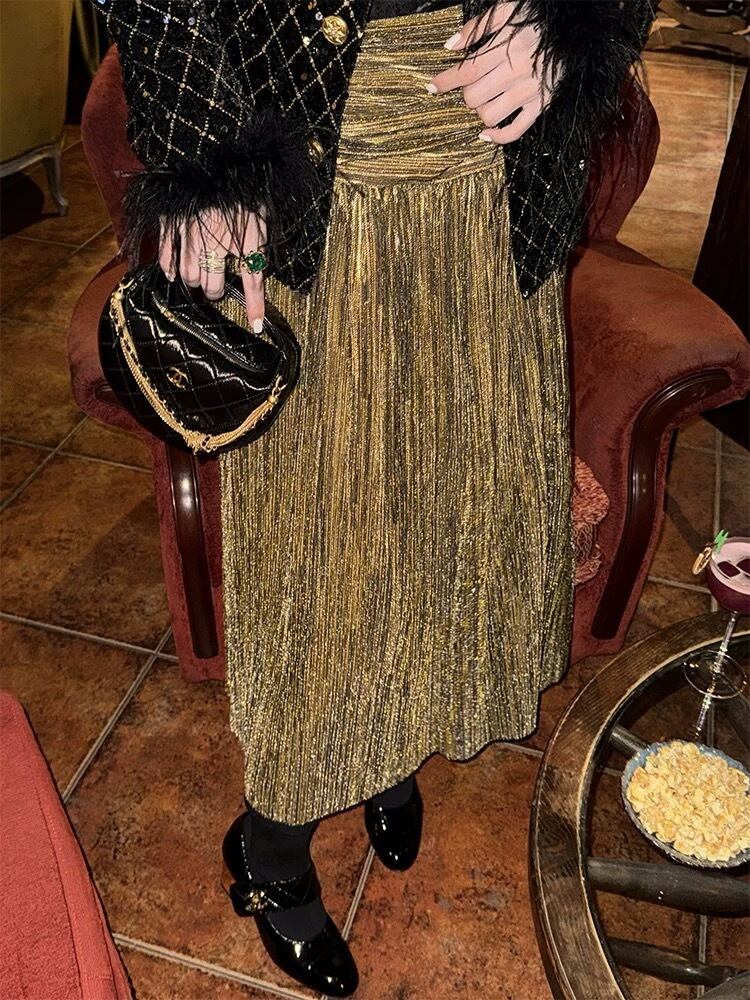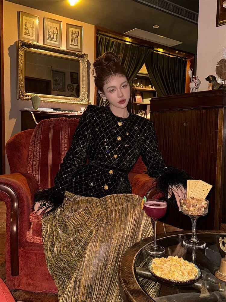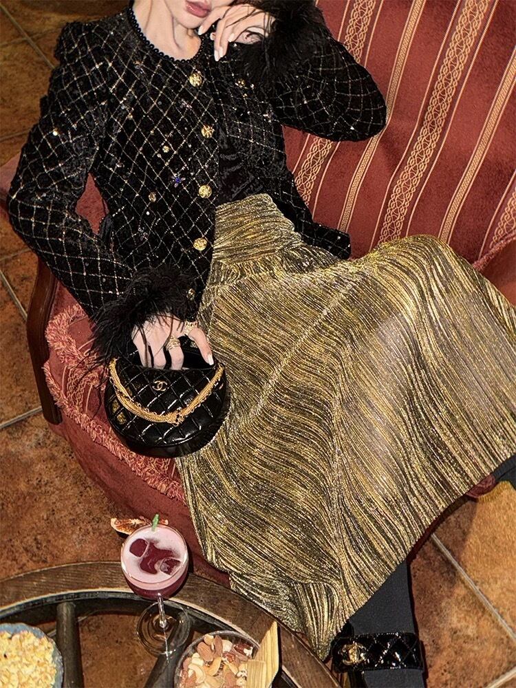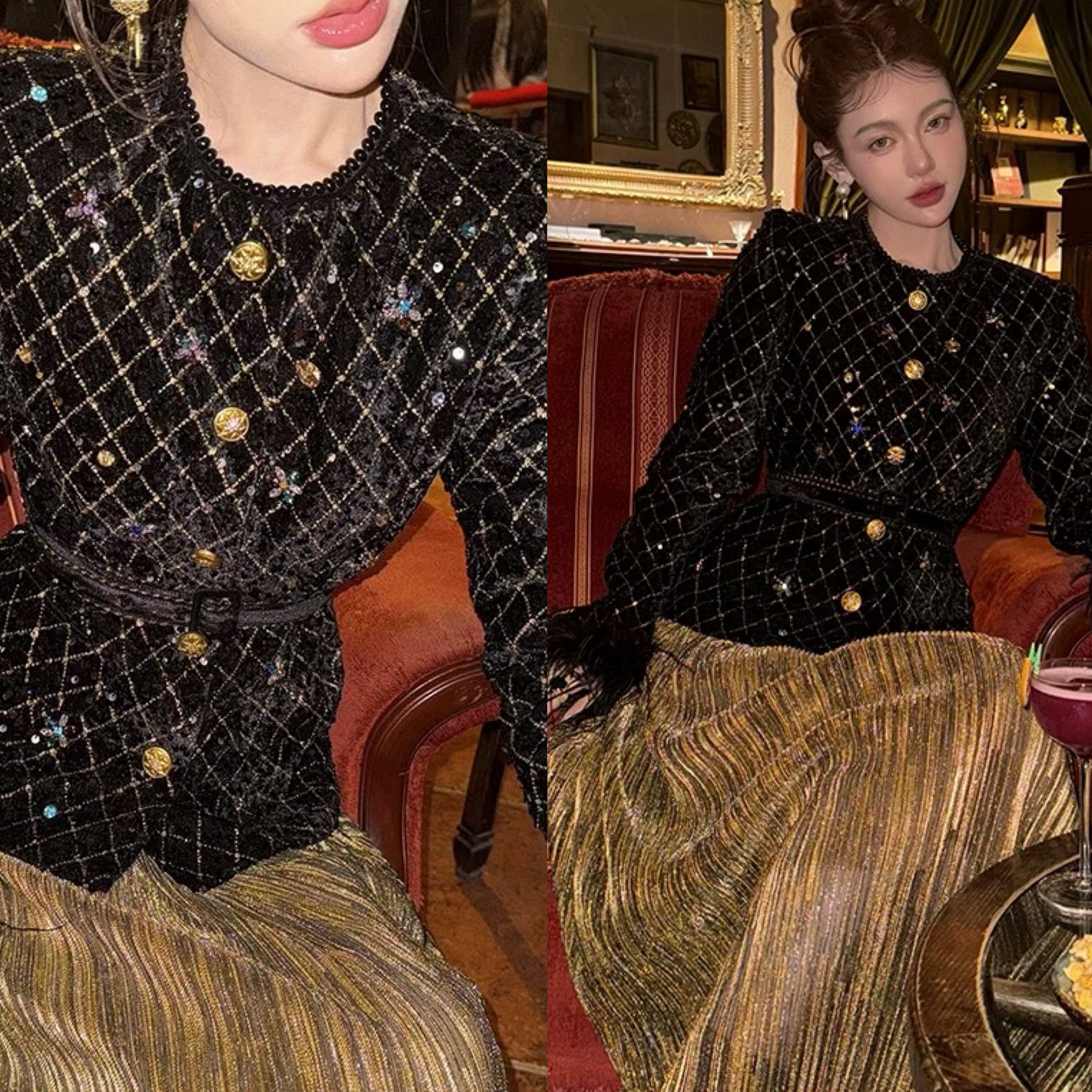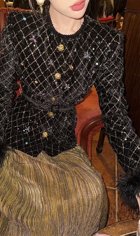 黒 XL ジャケット、ファー ツイード、キラキラ ゴージャス エレガント ゴールドチェック、アウター、トップス、コート、カーディガン