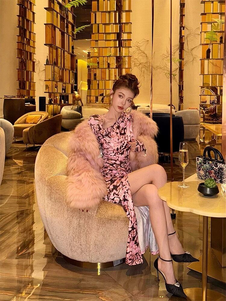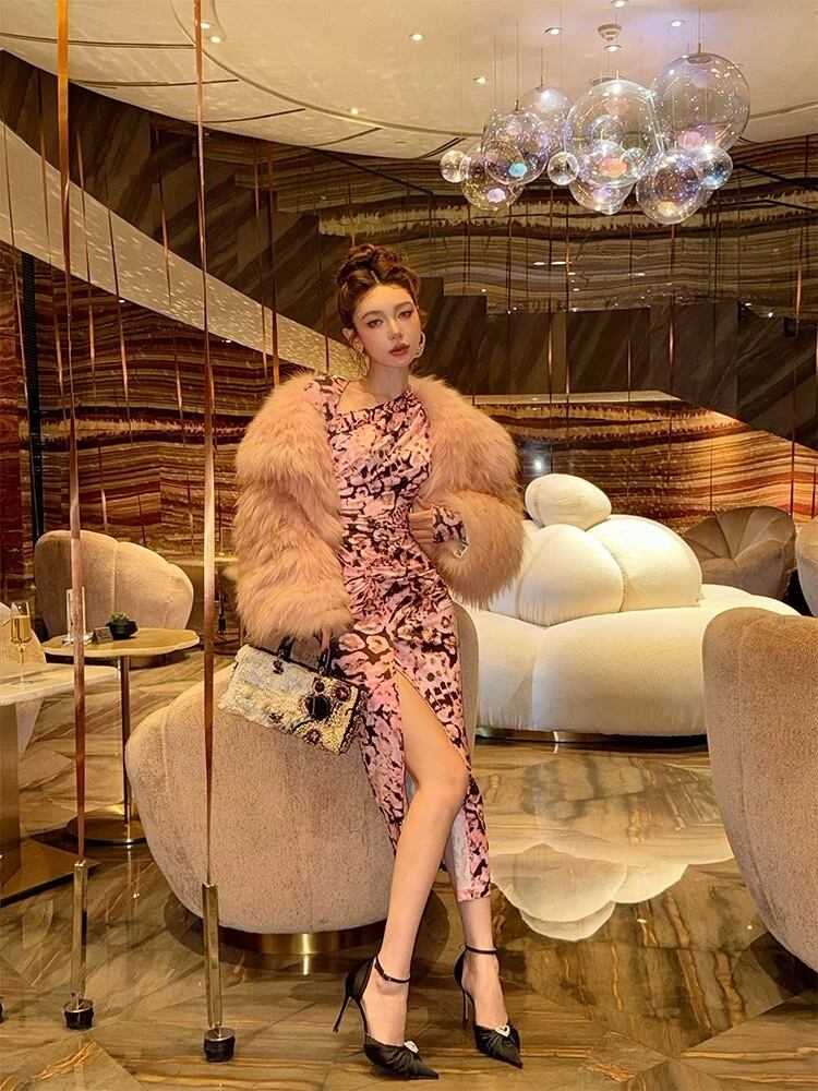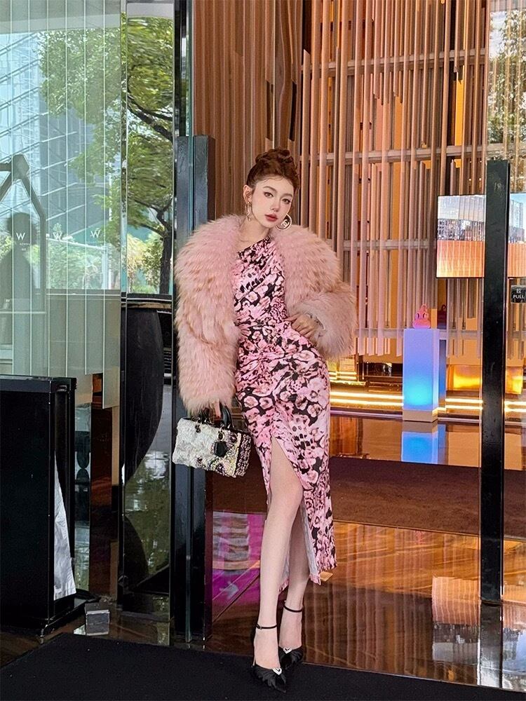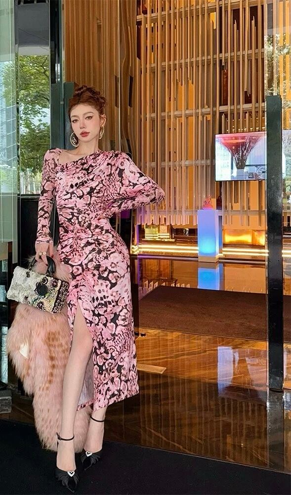 ピンク花柄、エレガント、スリットワンピース、マキシ、セクシーマーメイドタイトゴージャス クラブ ダンス、セクシー、お嬢様 パーティー ドレス ワンピース スカート