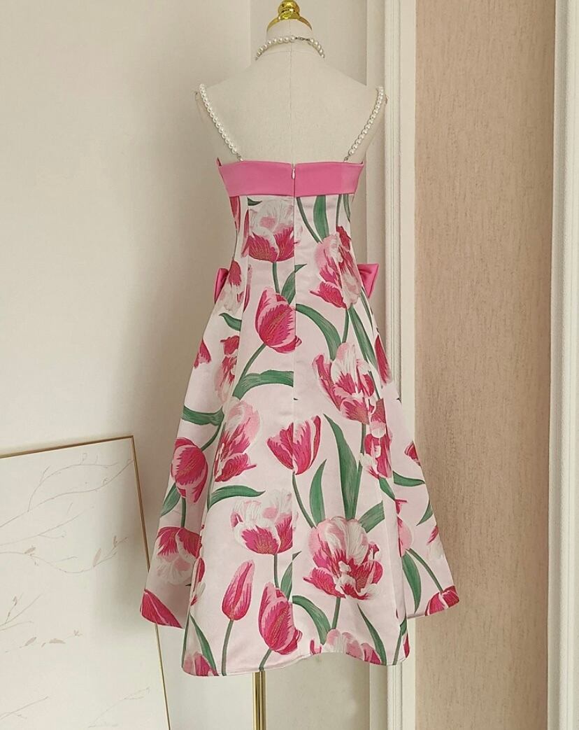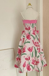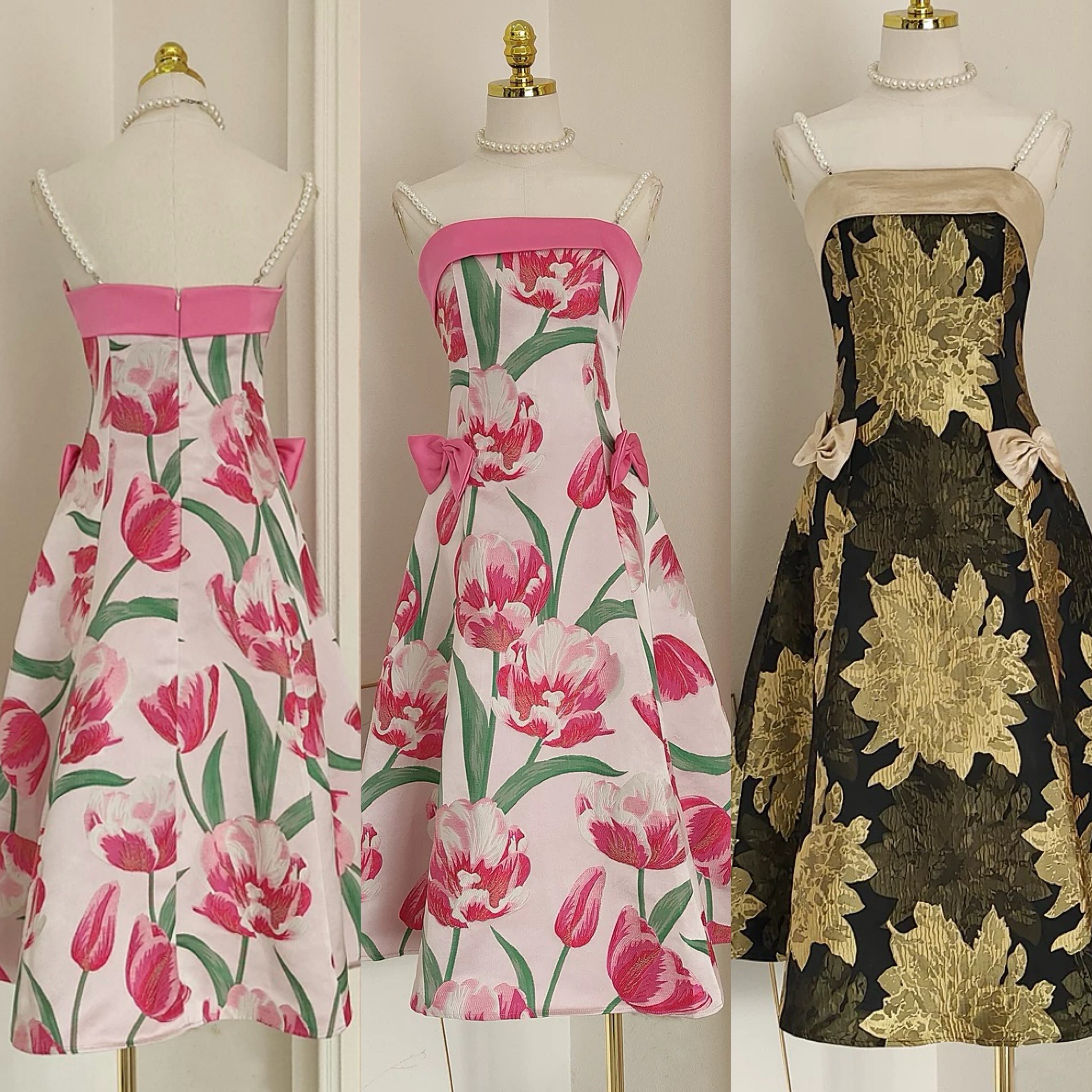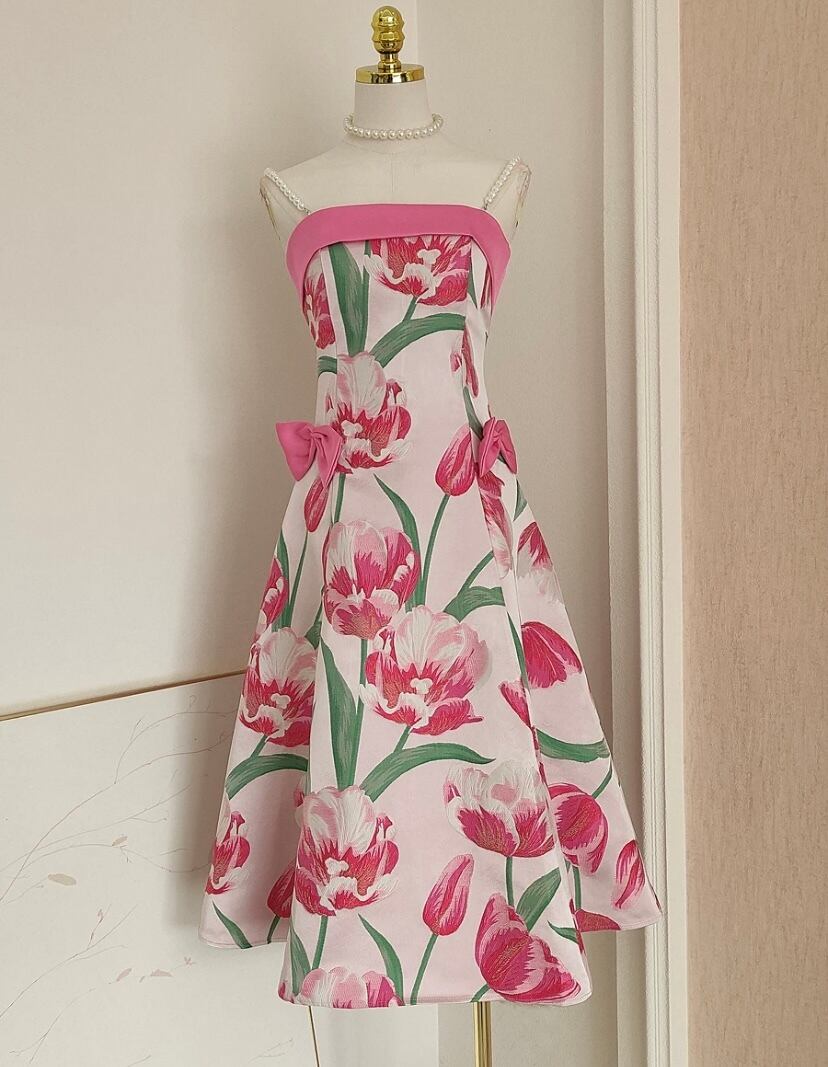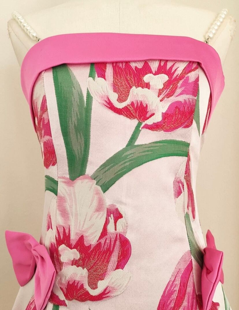 ベアトップ キャミソール パール チェーン 花柄、ピンク ゴールド 黒 フラワー バラ チューリップ、エレガント リボン ドレス 和柄 和風 着物 パーティー ワンピース チューリップ ドレス