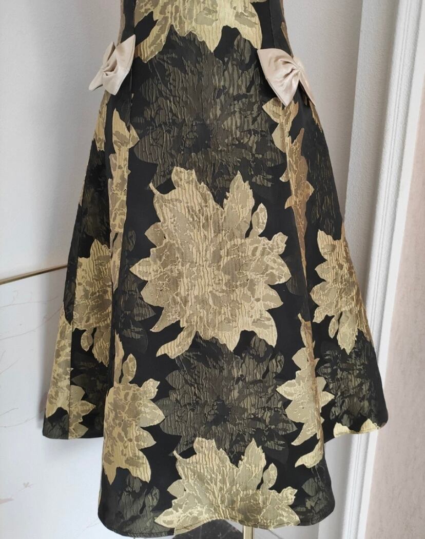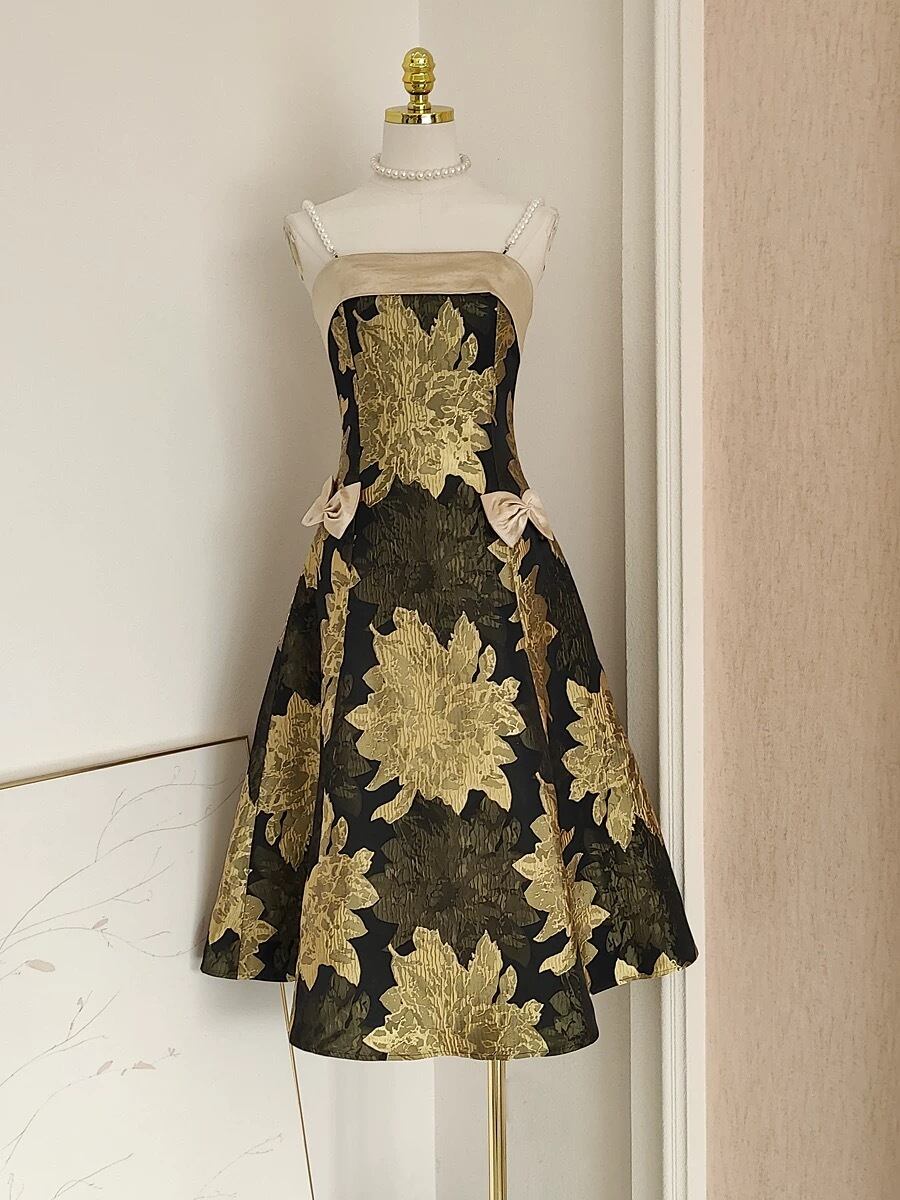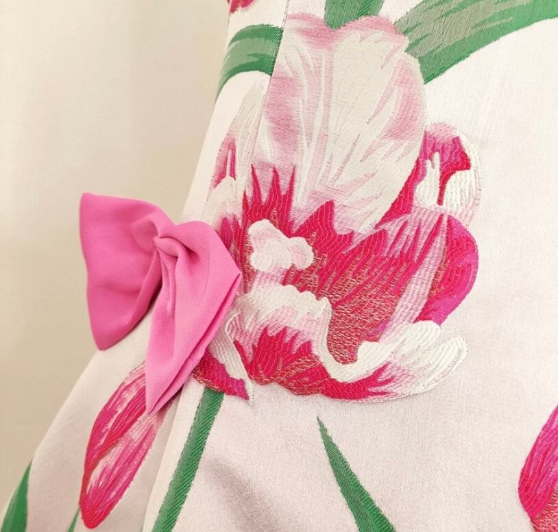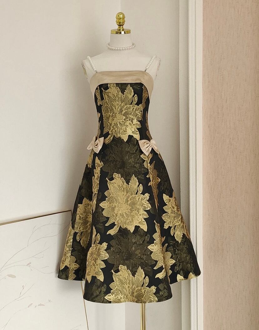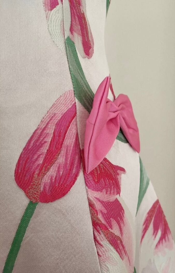 ベアトップ キャミソール パール チェーン 花柄、ピンク ゴールド 黒 フラワー バラ チューリップ、エレガント リボン ドレス 和柄 和風 着物 パーティー ワンピース チューリップ ドレス