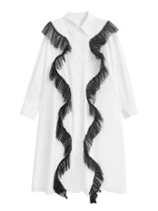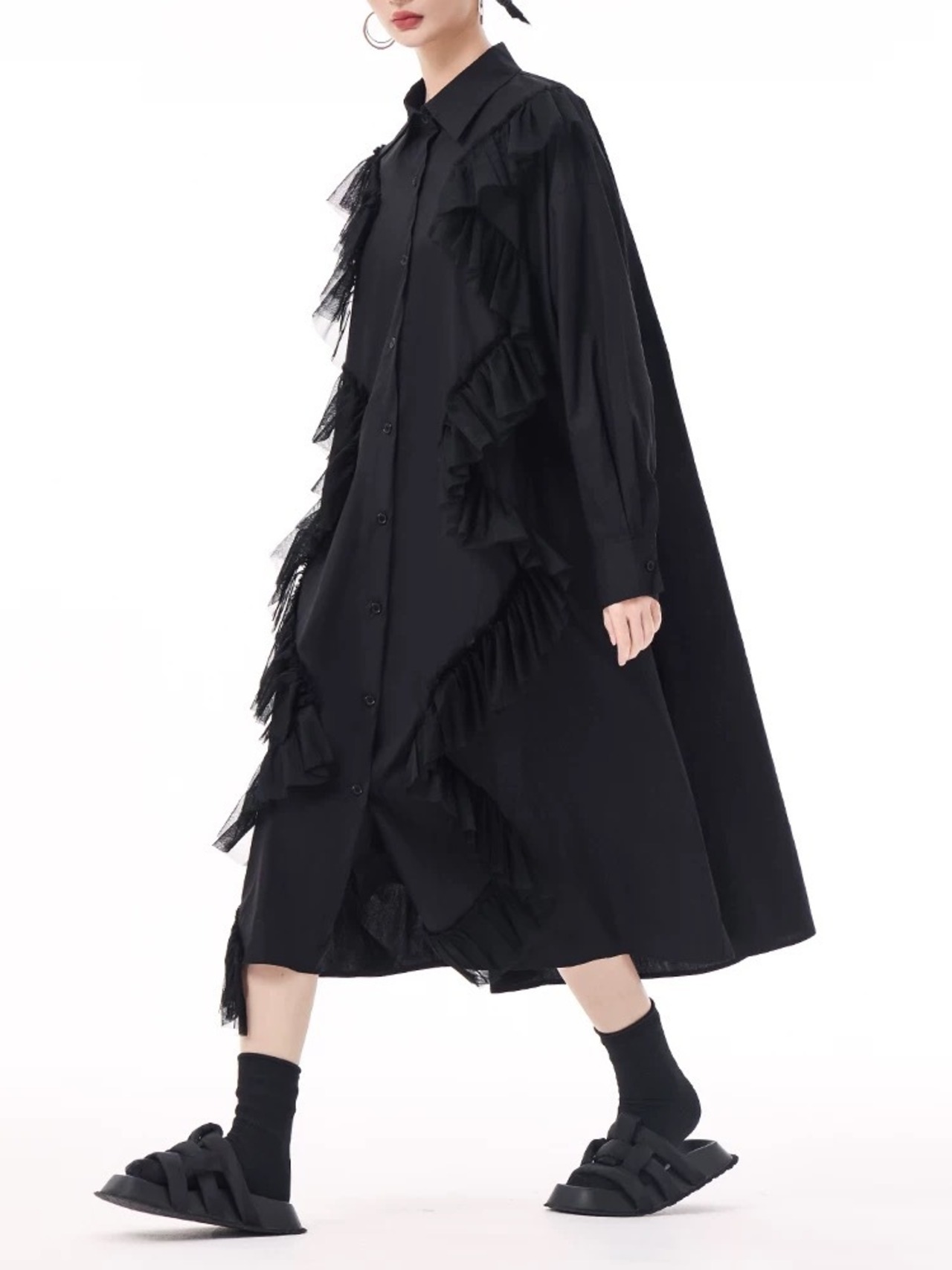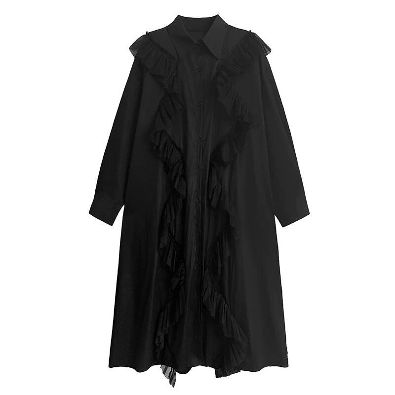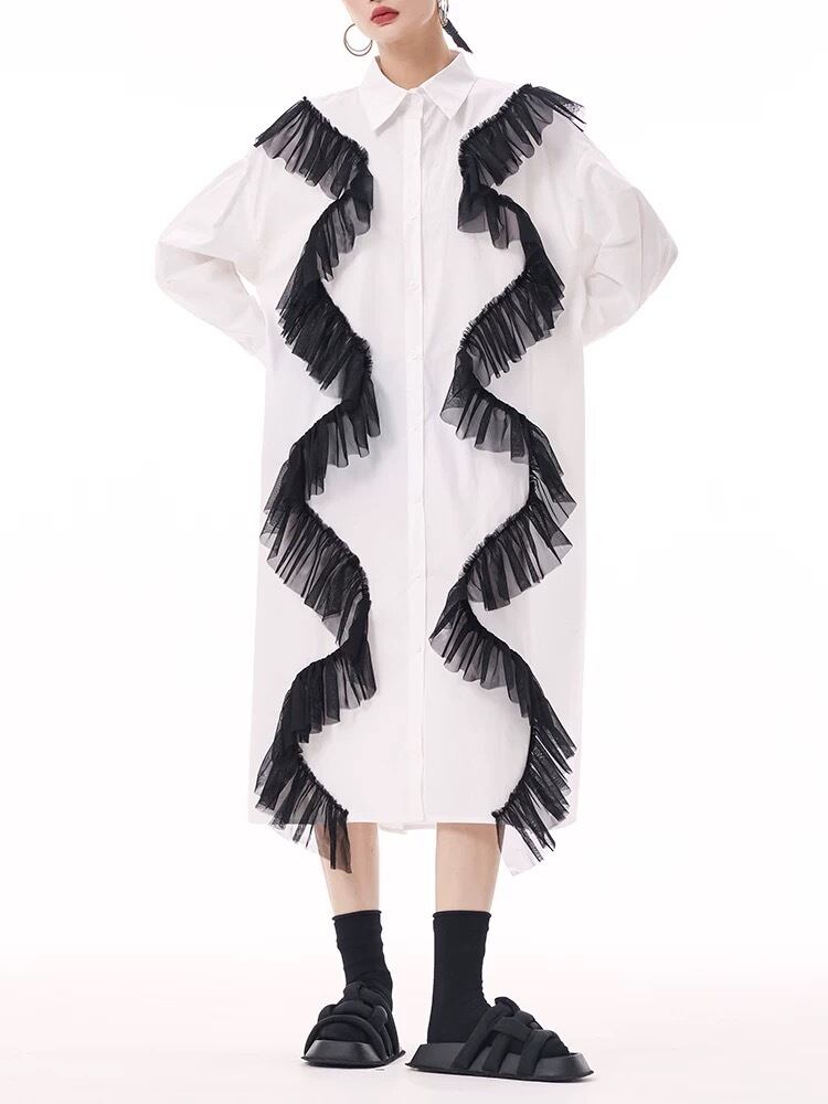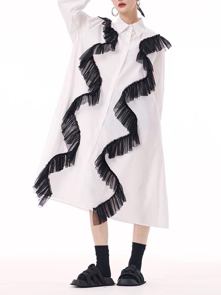 黒 白、ゆったり、オーバーサイズ シャツ、ブラウス、ワンピース フリル