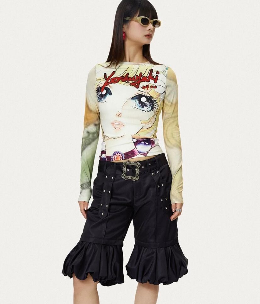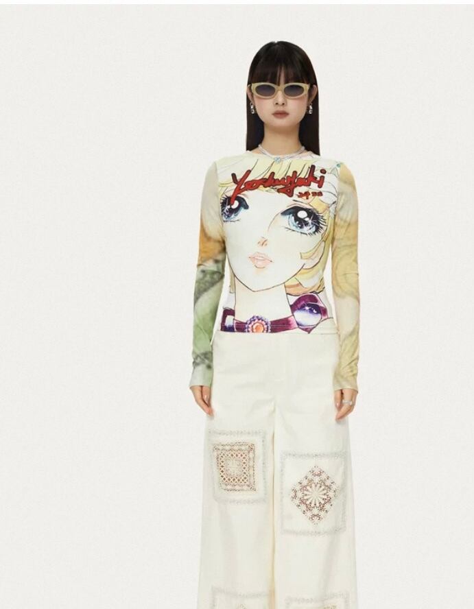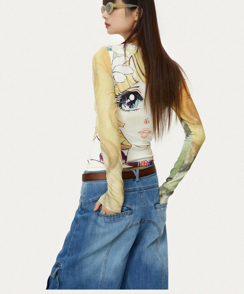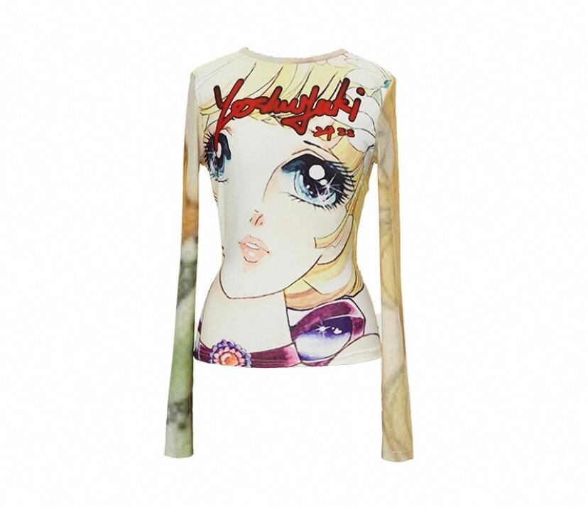 長袖 黄色 顔 漫画 女の子 可愛い Tシャツ。トップス ブラウス、カジュアル 金 髪 目