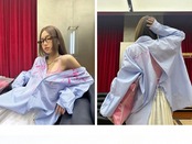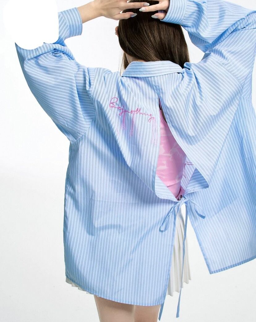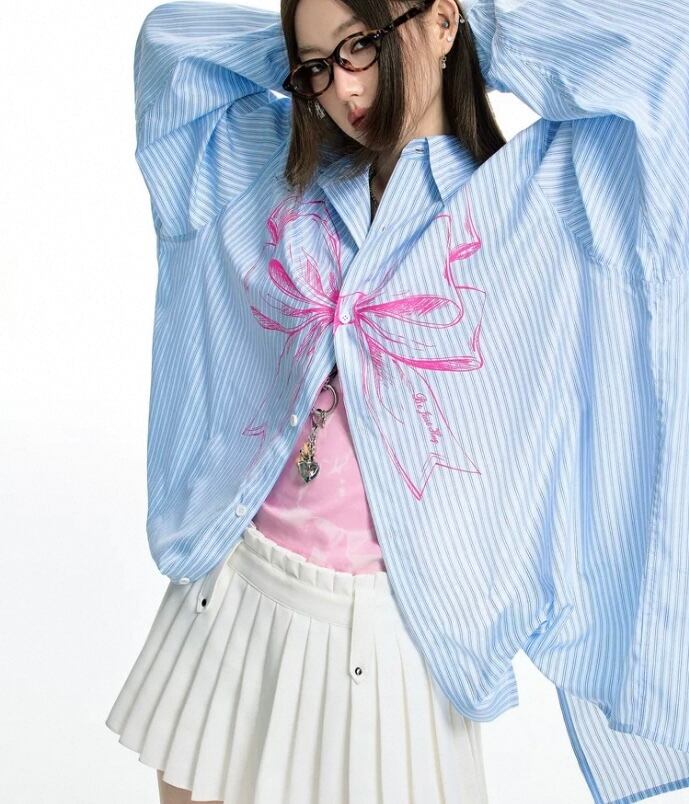 ピンク水色ストライプ、リボン、背中、カジュアルオーバーサイズ、ゆったりシャツブラウス、トップスストレート