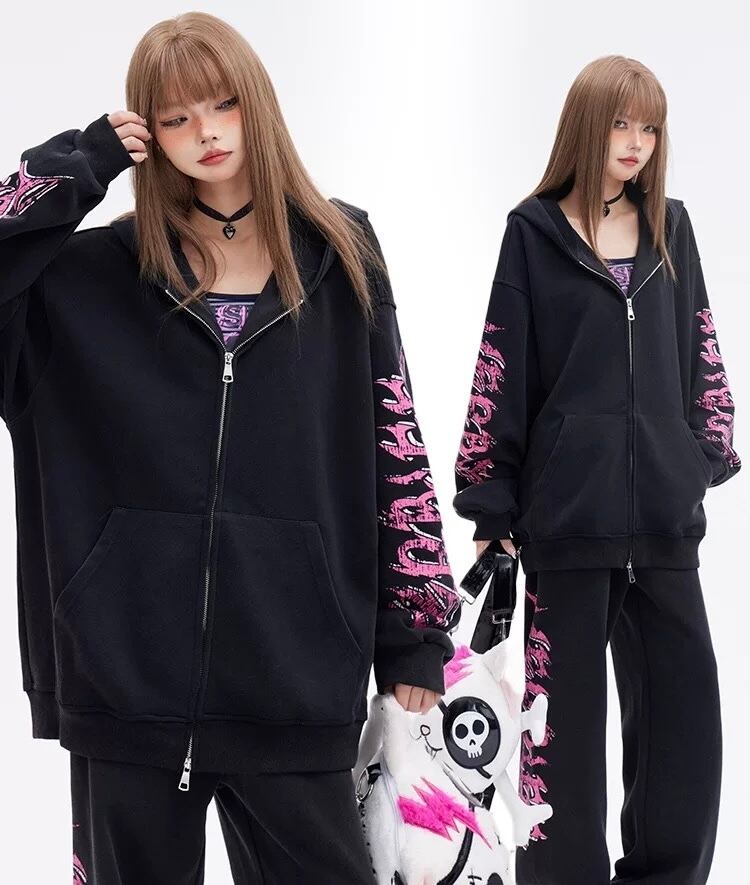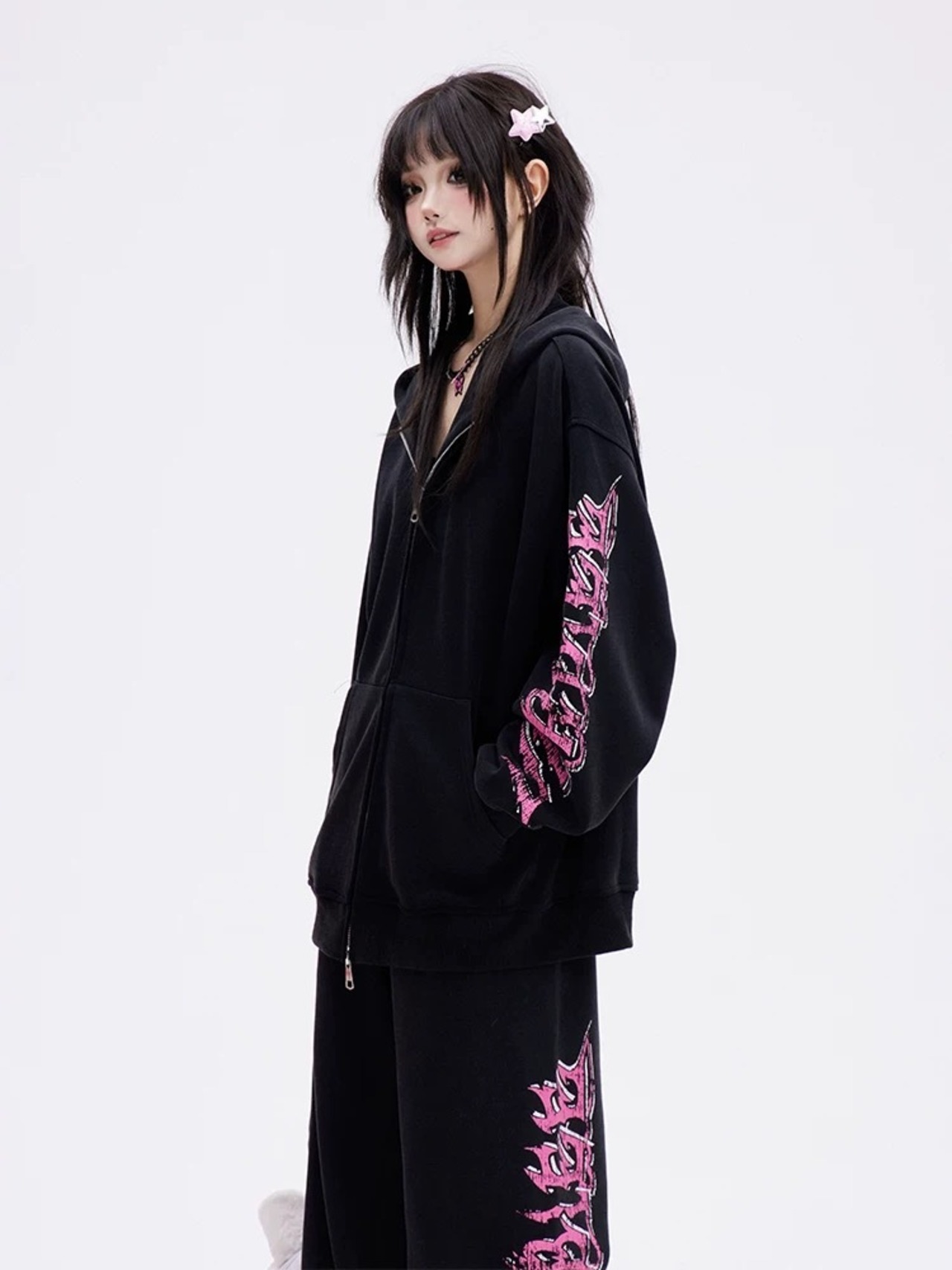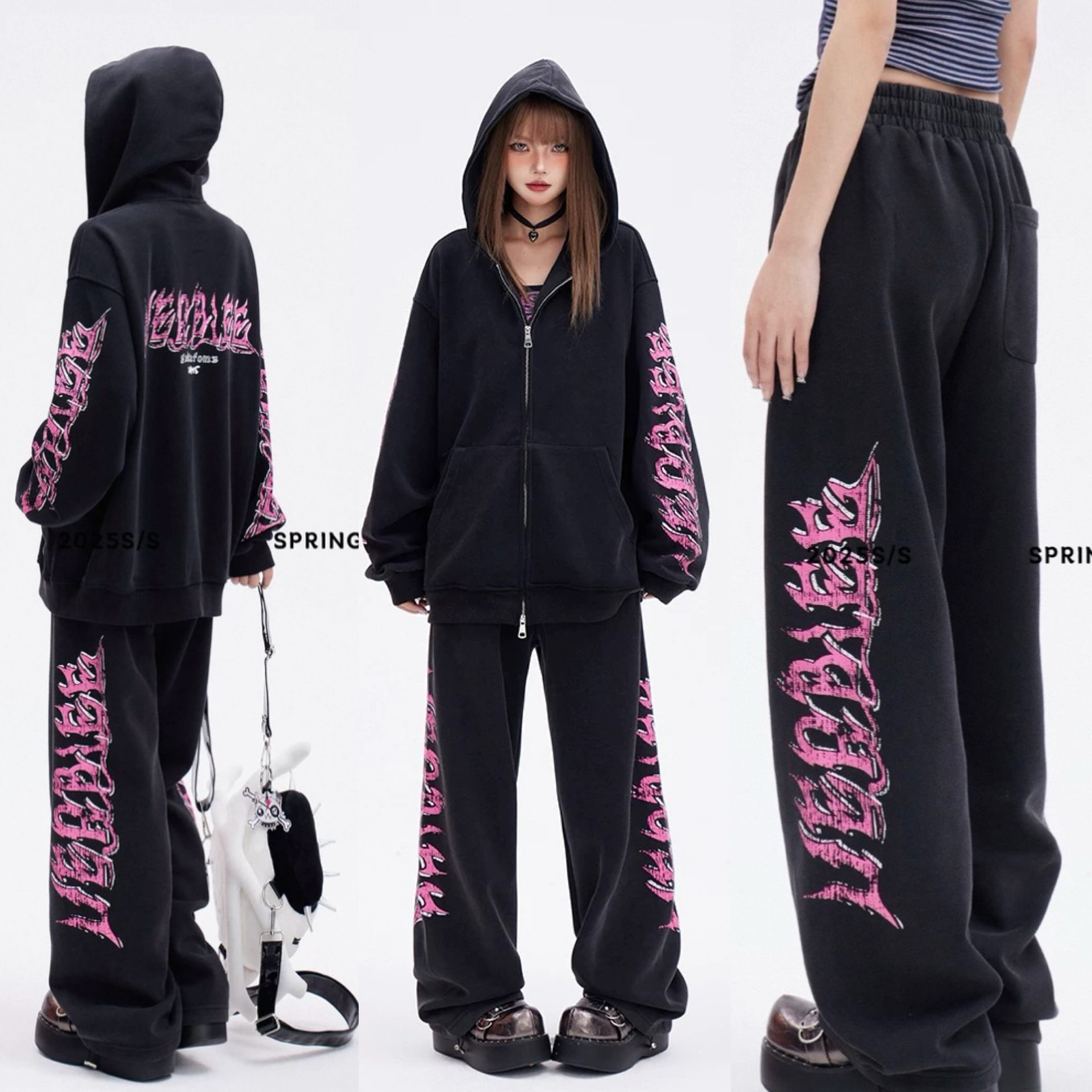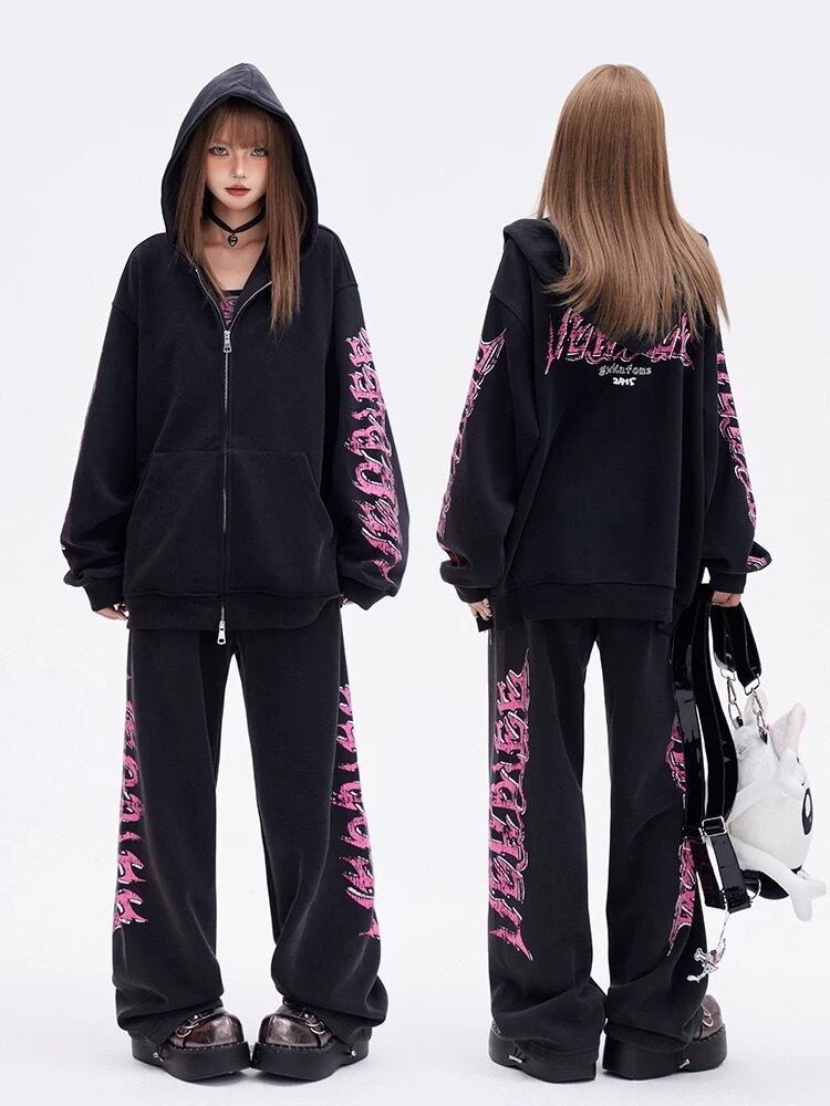 【セットアップ】トレーナー パーカー、黒 ピンク ストリート パンツ、スウェット パーカー フード ボトムス ストリート 原宿 ギャル 渋谷 Y2K ダンス ルームウェア 黒