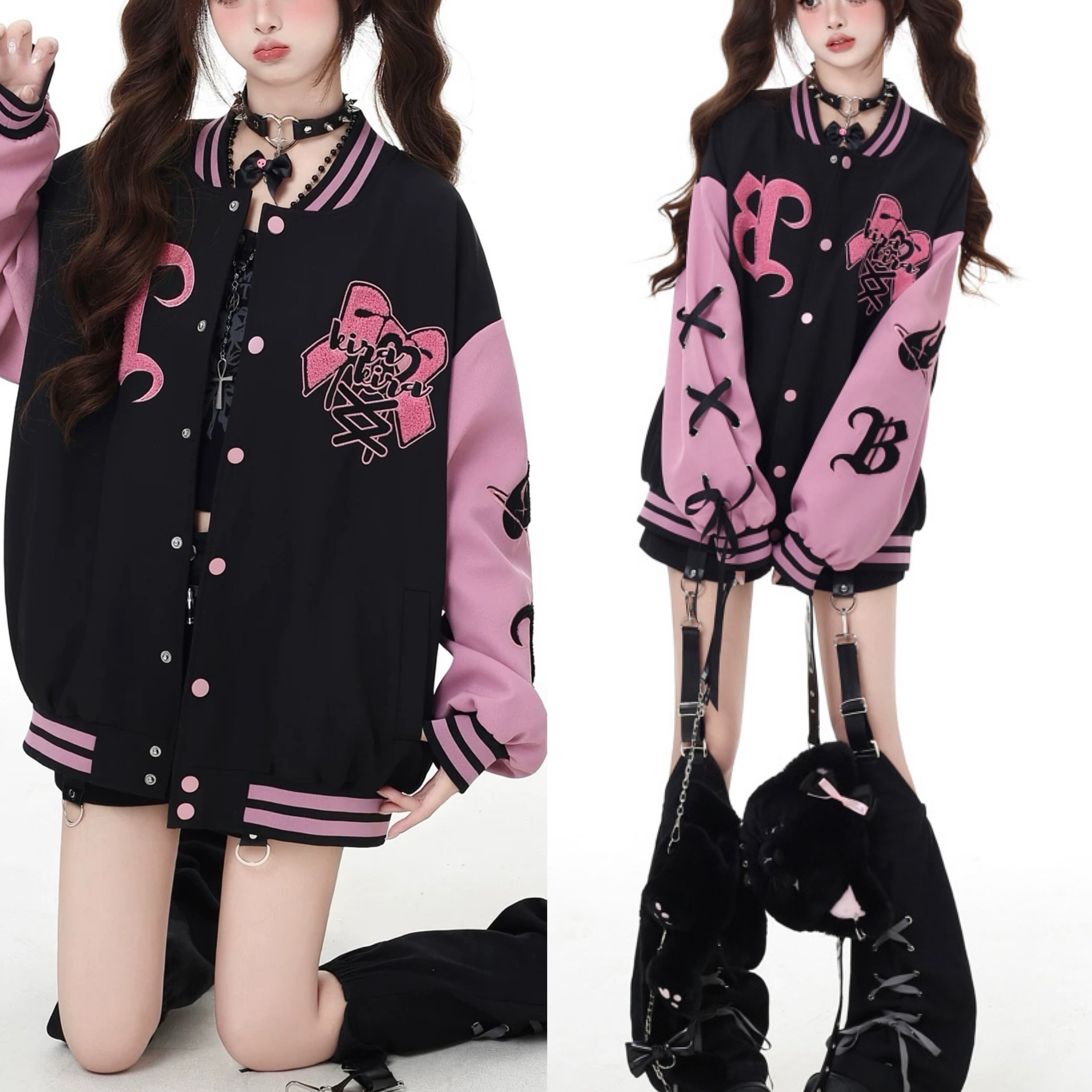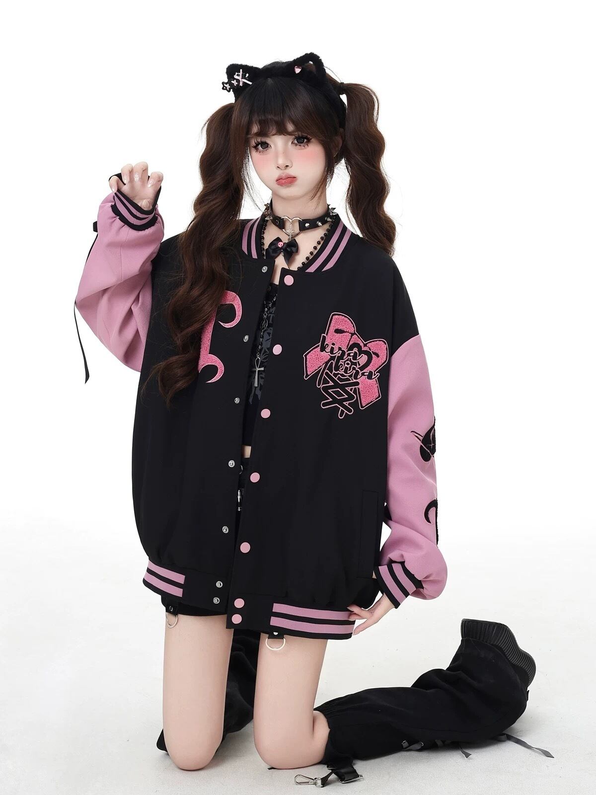 ピンク、黒 リボン、スタジャン、かわいい ガーリー、原宿、姫 ジャケット、アウター、コート、カーディガン、トップス スタジアム、ジャンバー ブルゾン