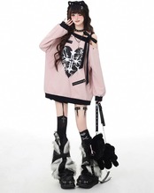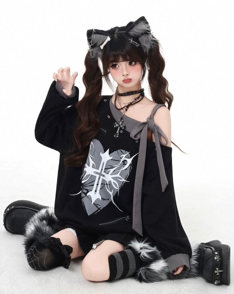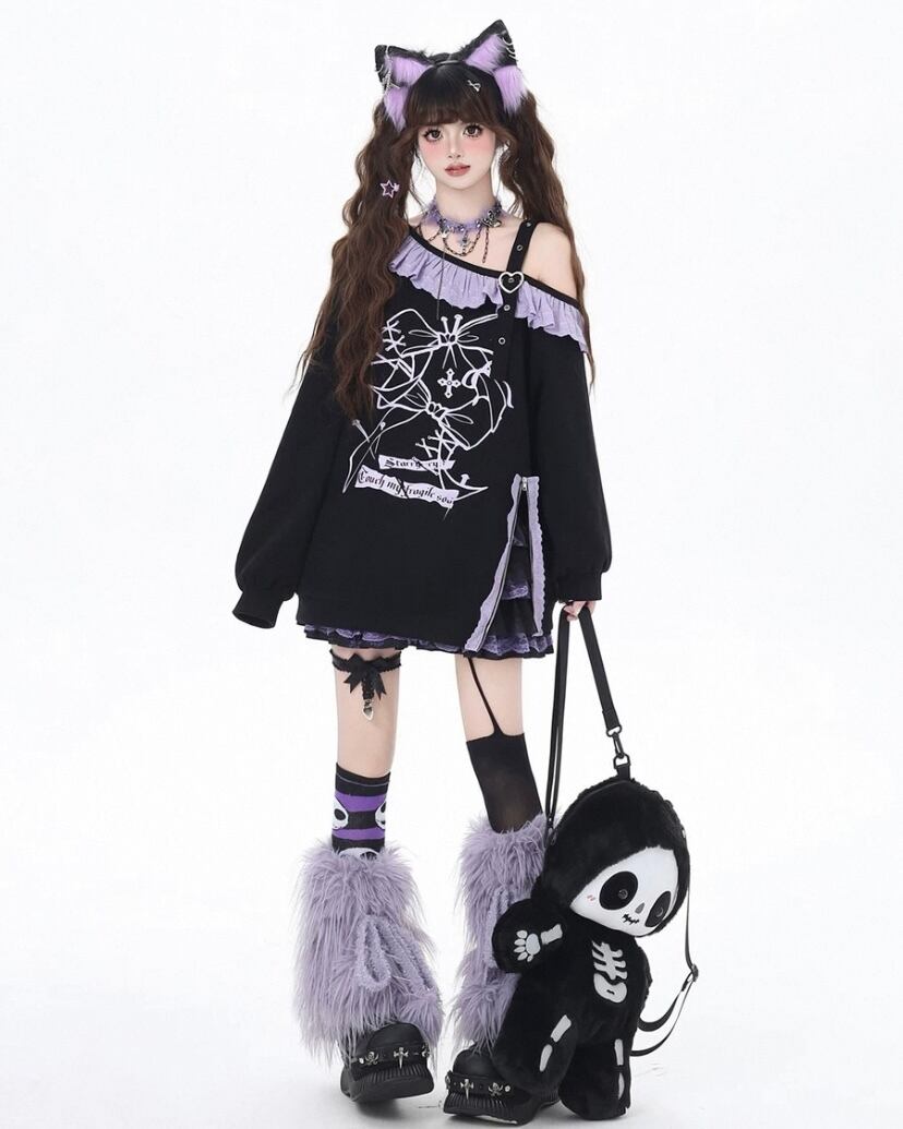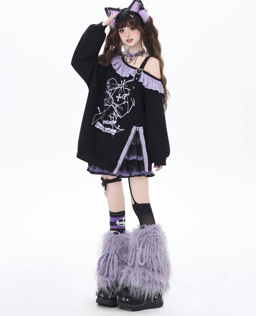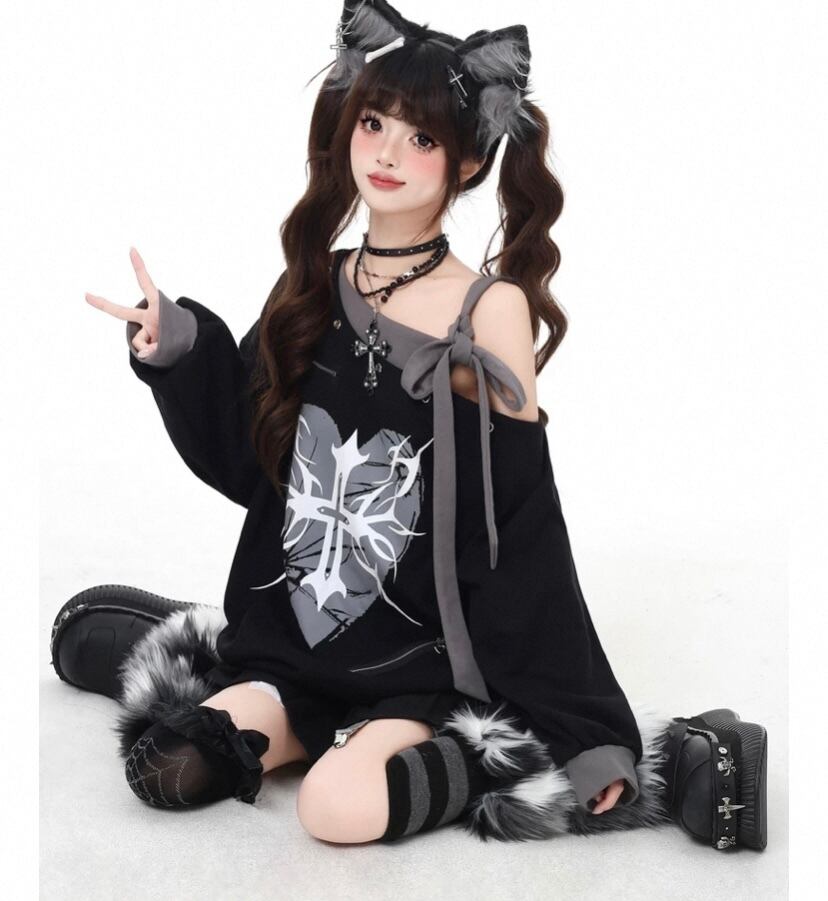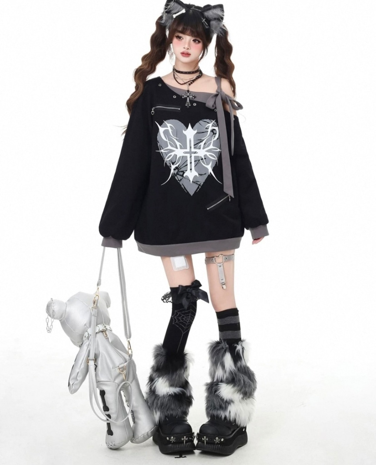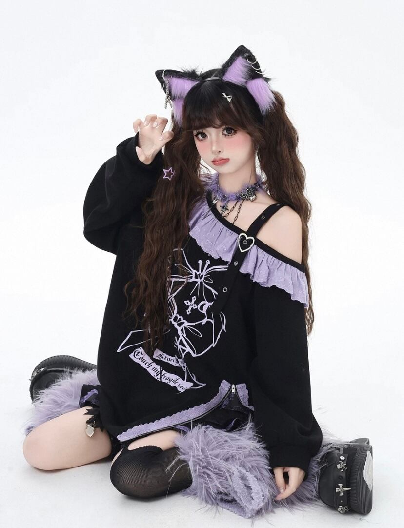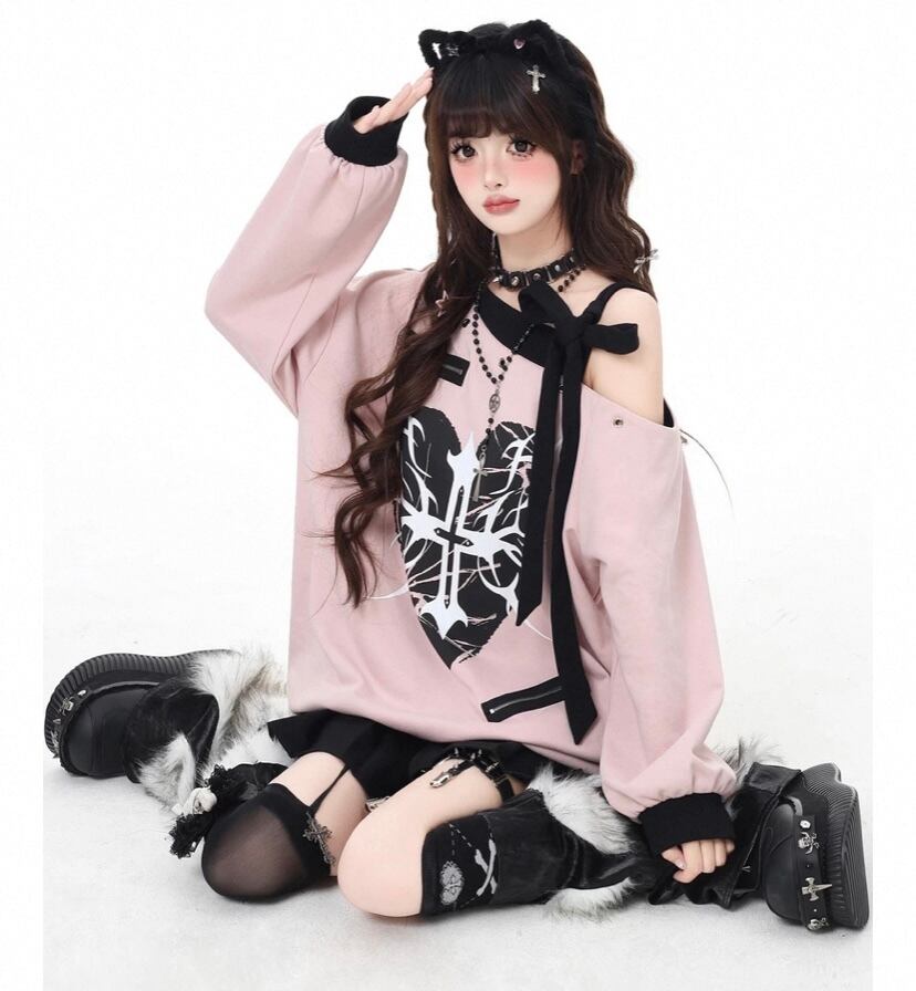 紫ハートピンク、カジュアルトレーナースウェットかわいい原宿ガーリー、スウェット、トップス、フリルリボンオフショルダーハートブラウスカジュアル