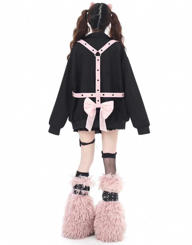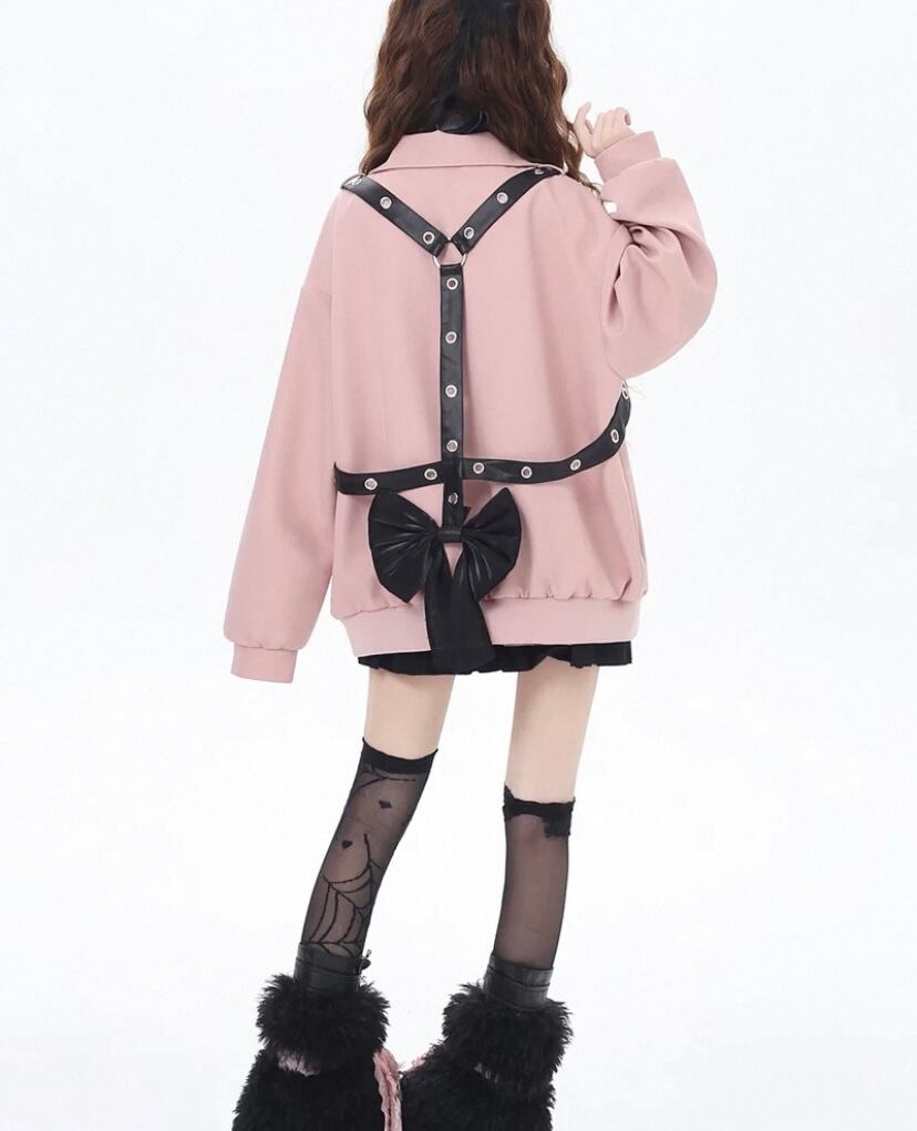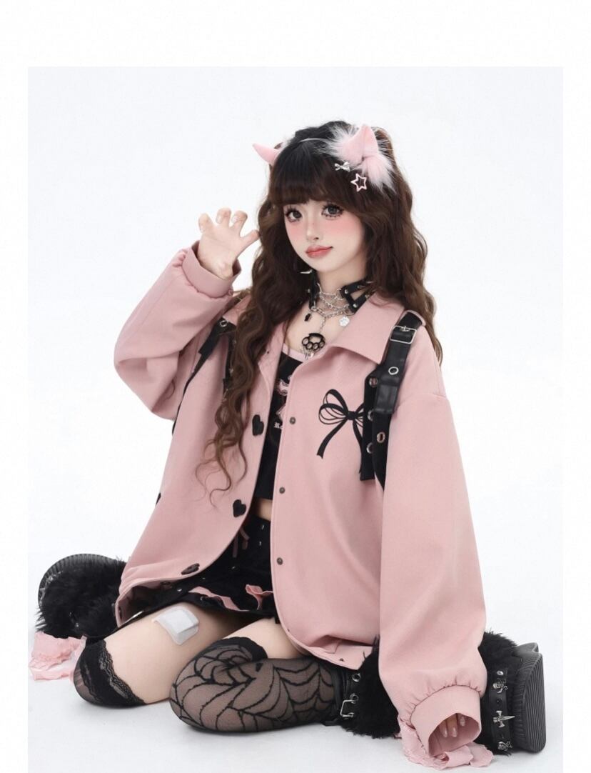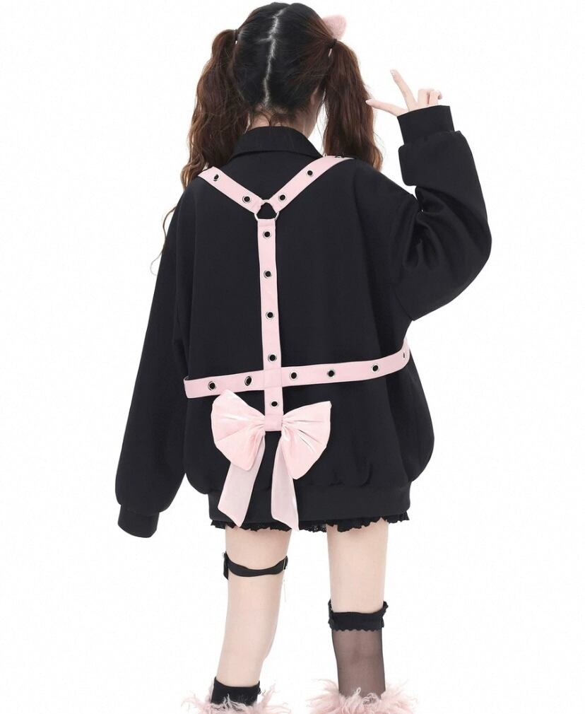 黒 ジャケット リボン ベルト ピンク カーディガン コート、ブルゾン ベルトハート ボタン ジャケット アウター カーディガン コート ブルゾン ガーリー 原宿 可愛い姫