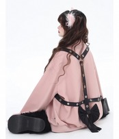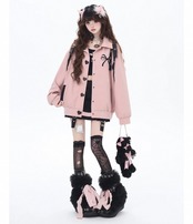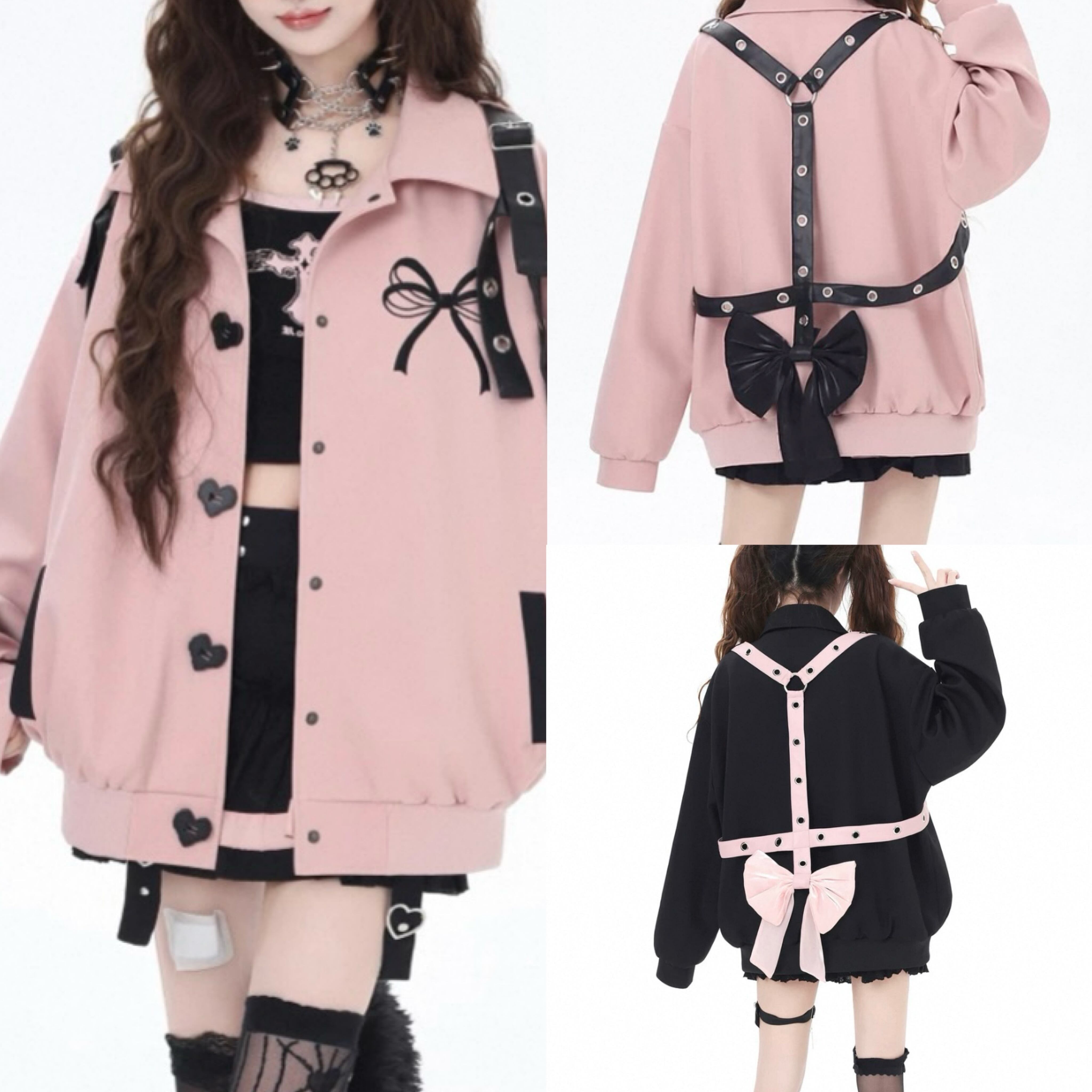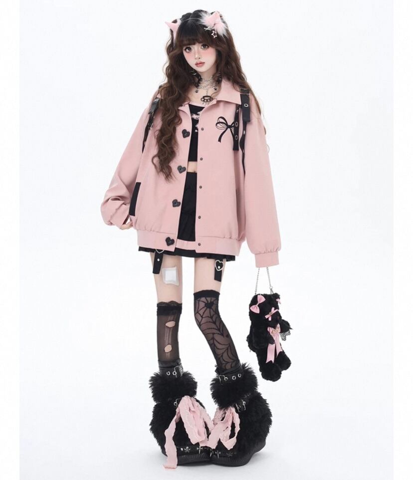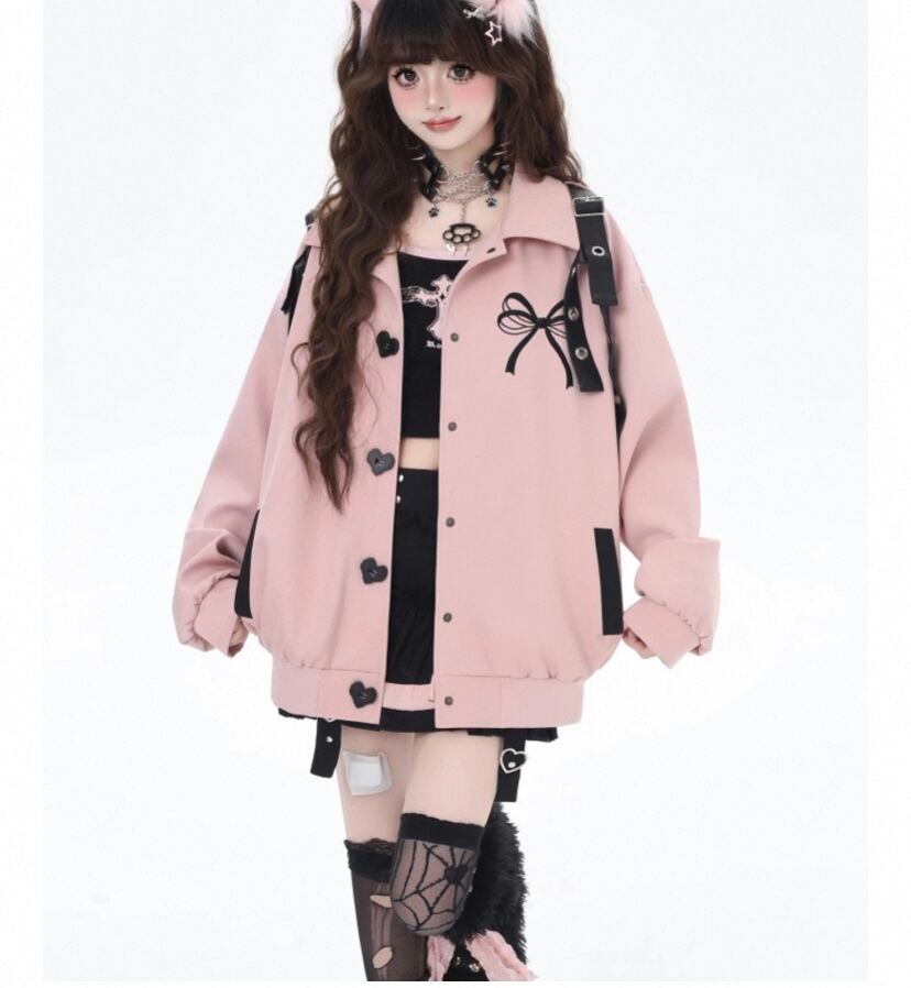 黒 ジャケット リボン ベルト ピンク カーディガン コート、ブルゾン ベルトハート ボタン ジャケット アウター カーディガン コート ブルゾン ガーリー 原宿 可愛い姫