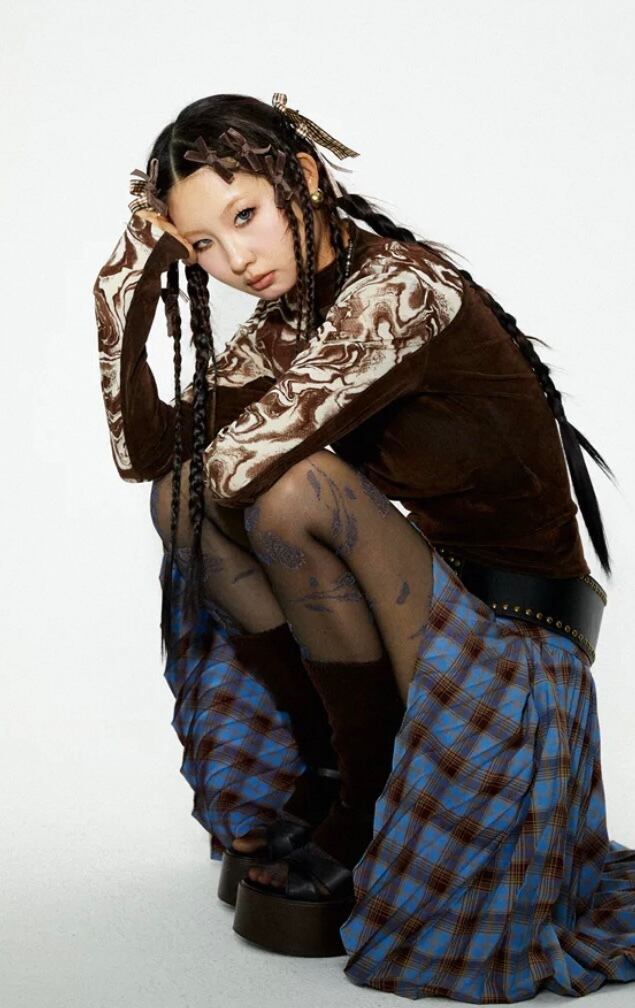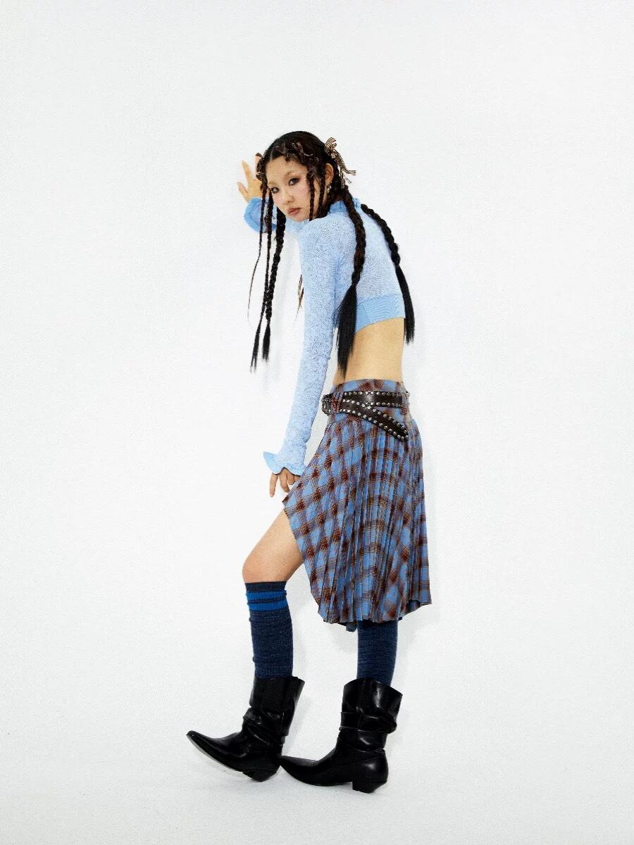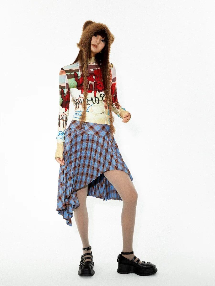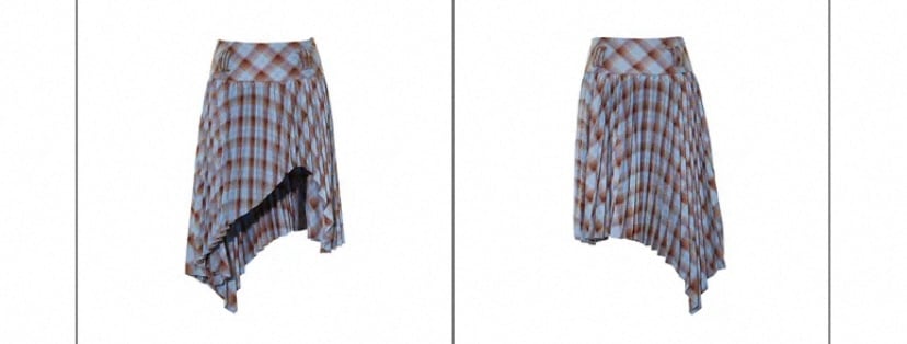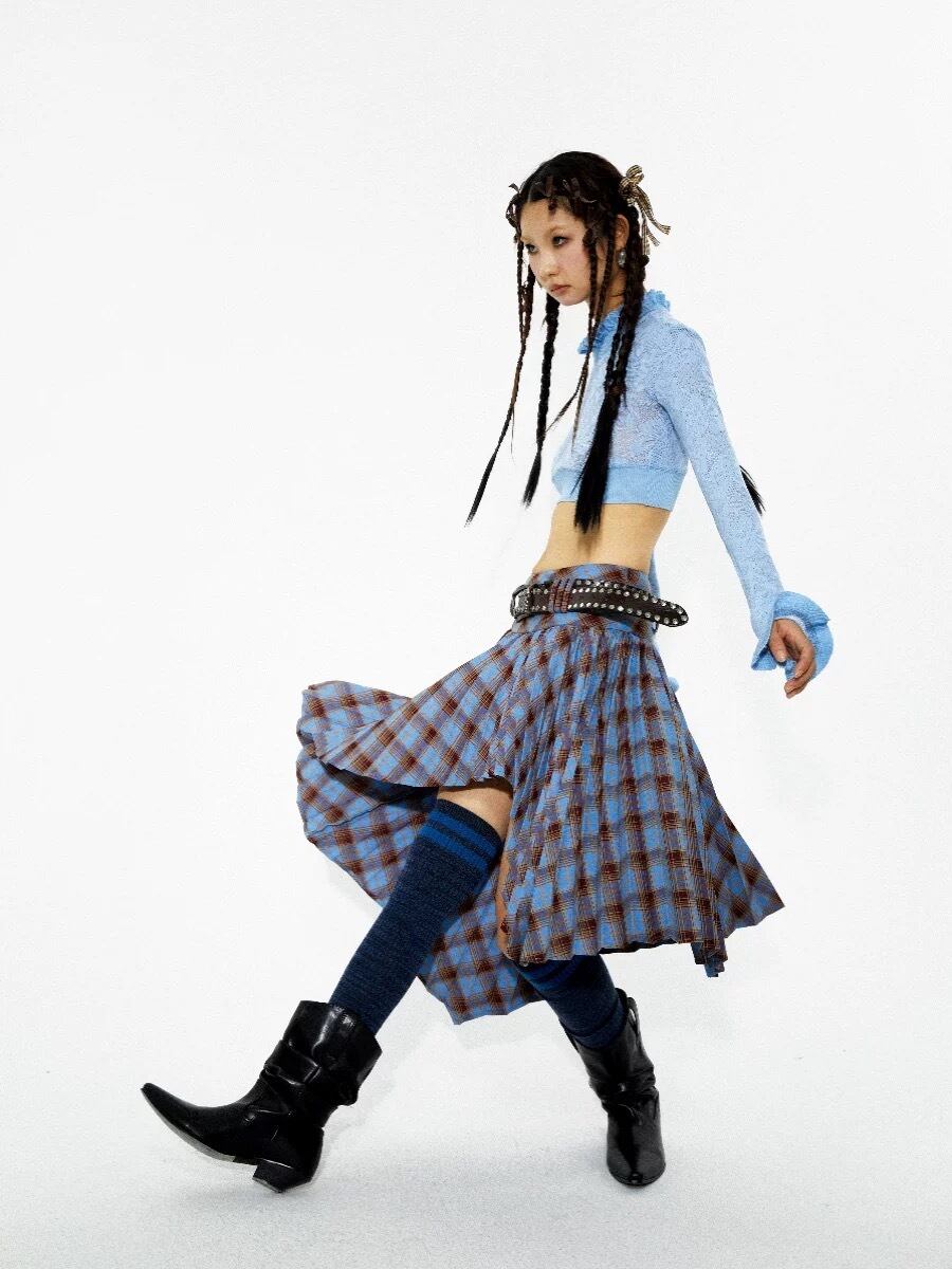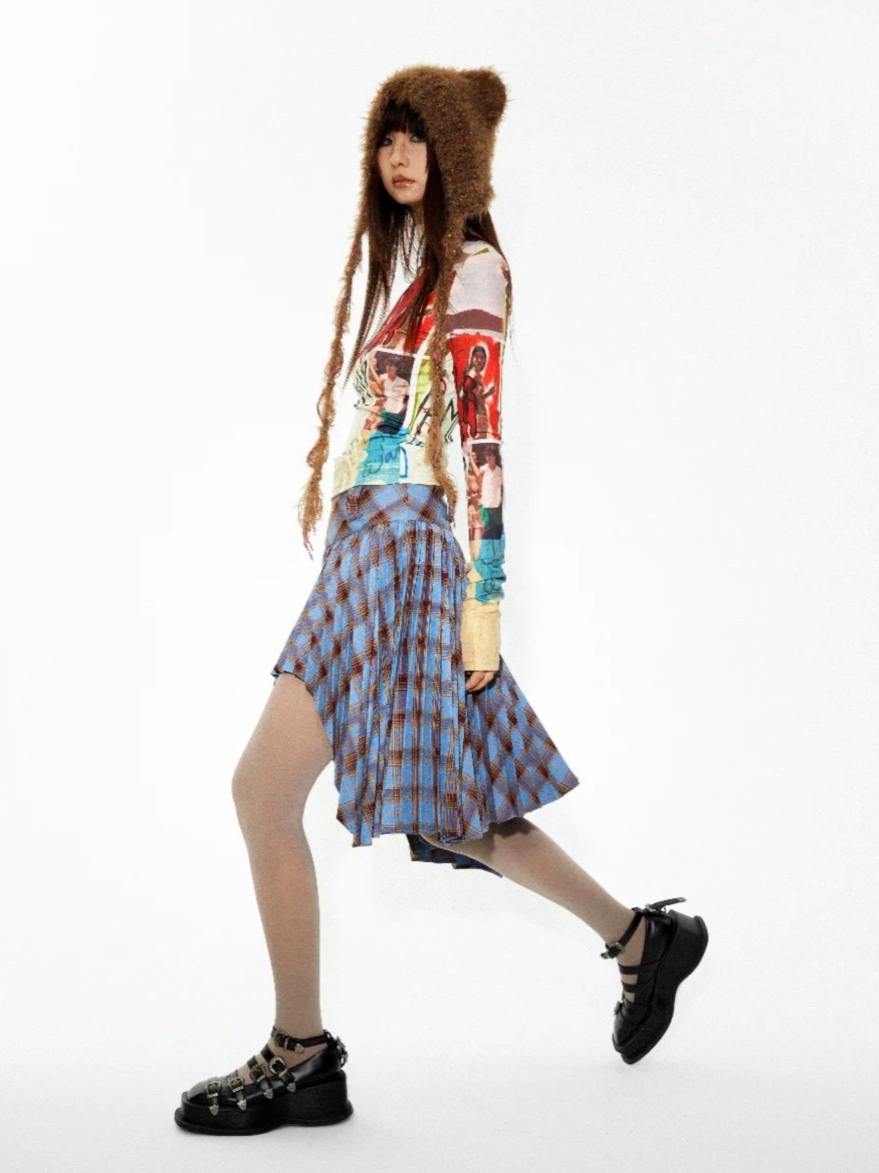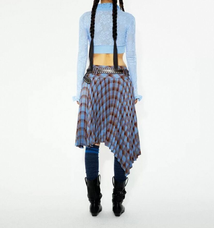 アシンメトリー プリーツスカート、水色、茶色 チェック ボーダー ストライプ、フレア カジュアル