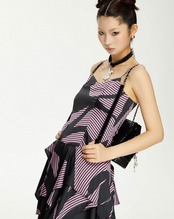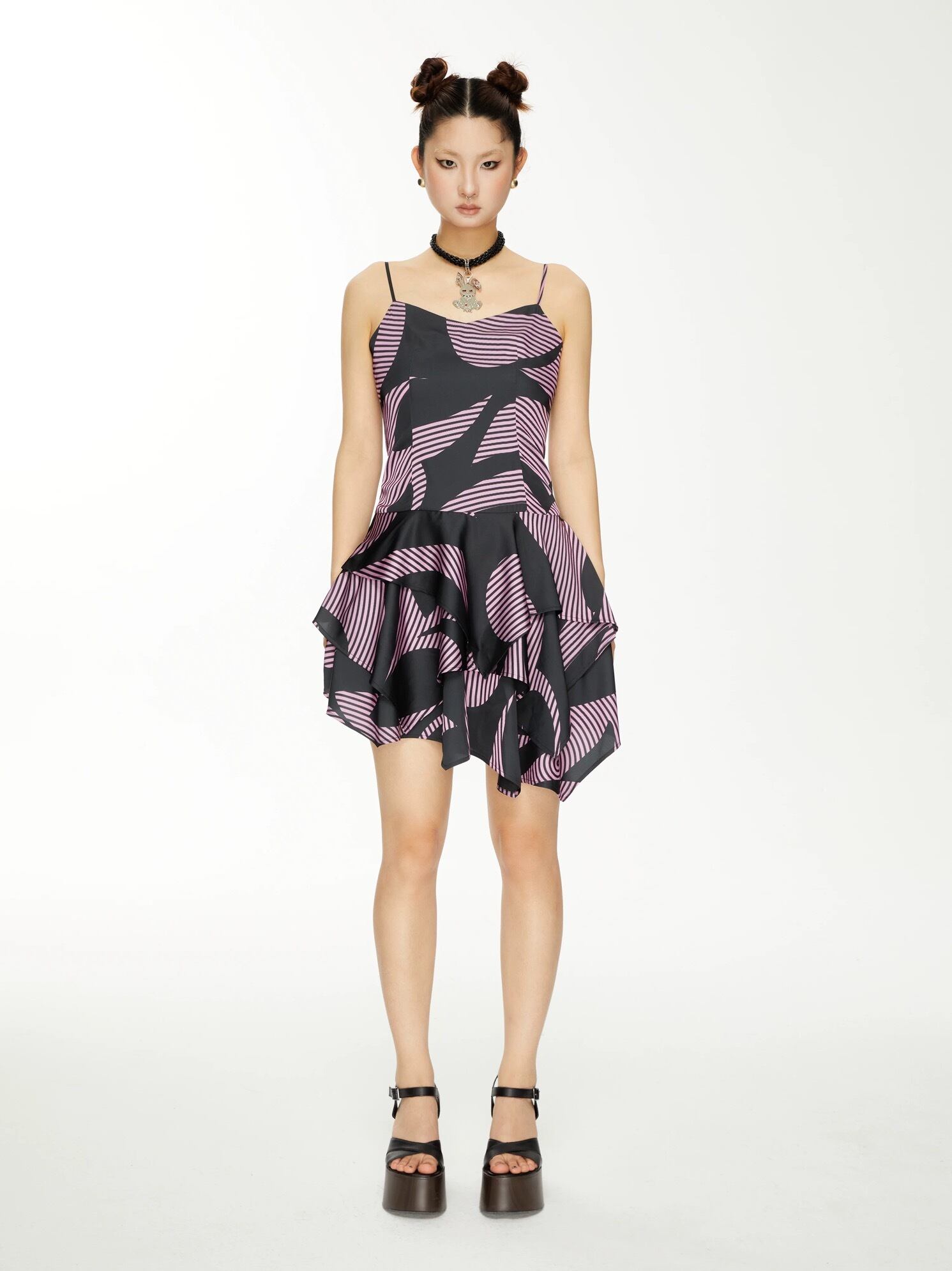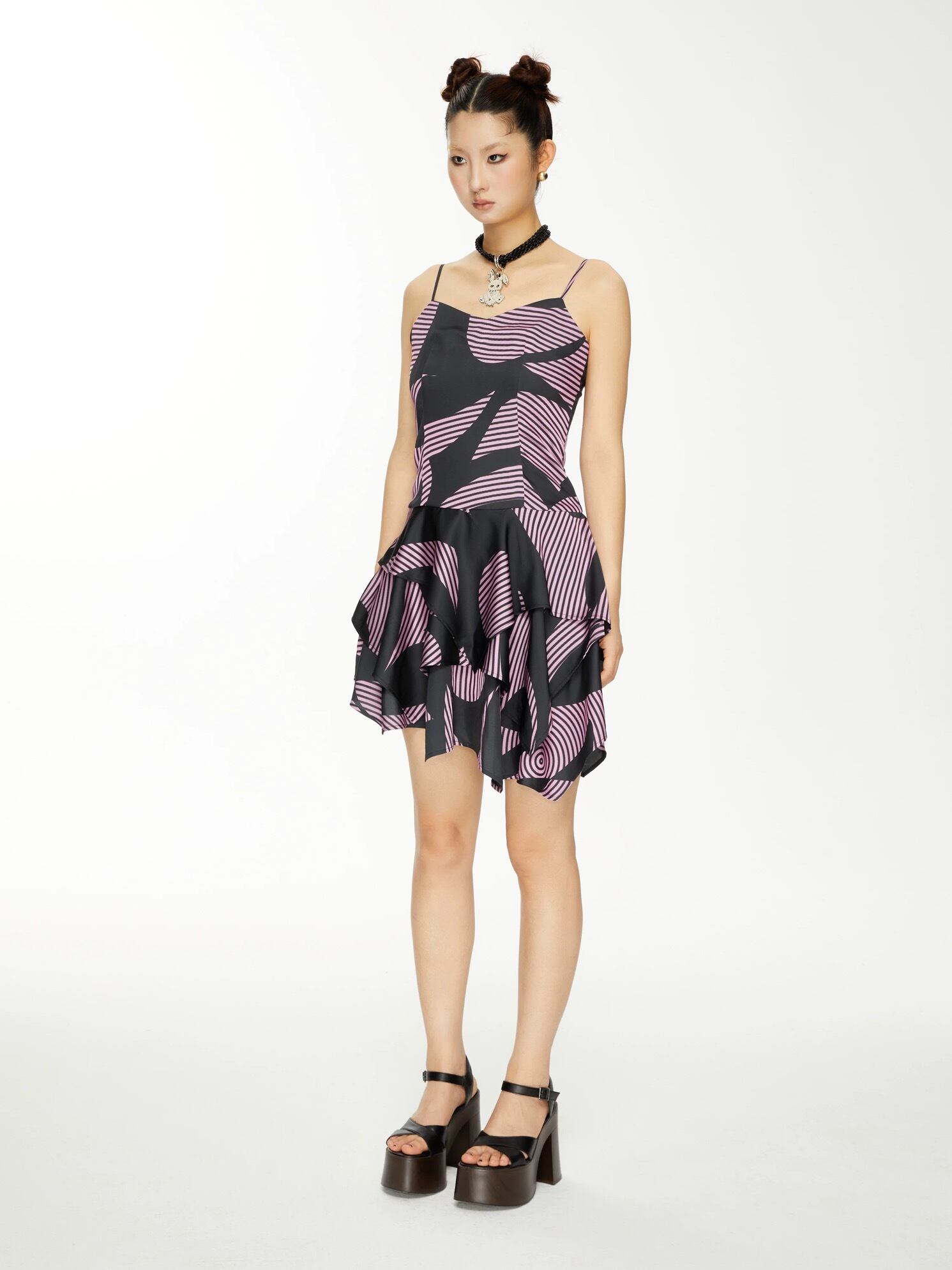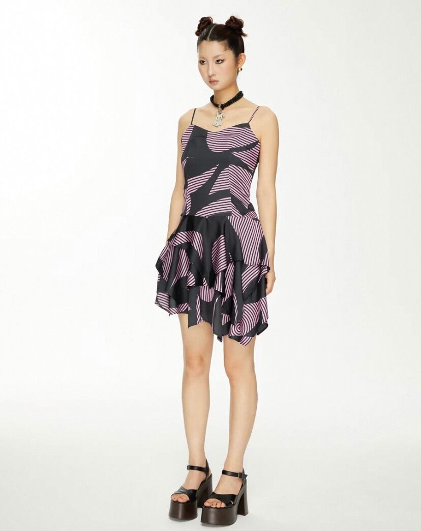 キャミソール ストライプ 幾何学模様。うずまき 黒 紫 パープル キャミソール バルーンスカート ワンピース 個性的 宇宙 サイバー