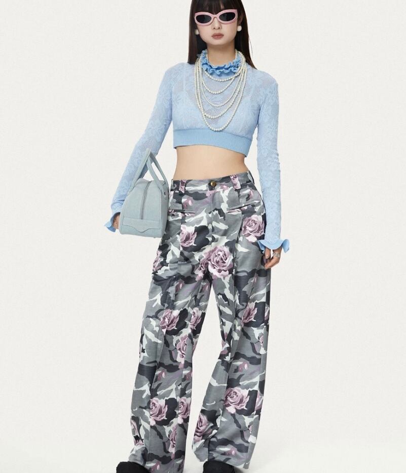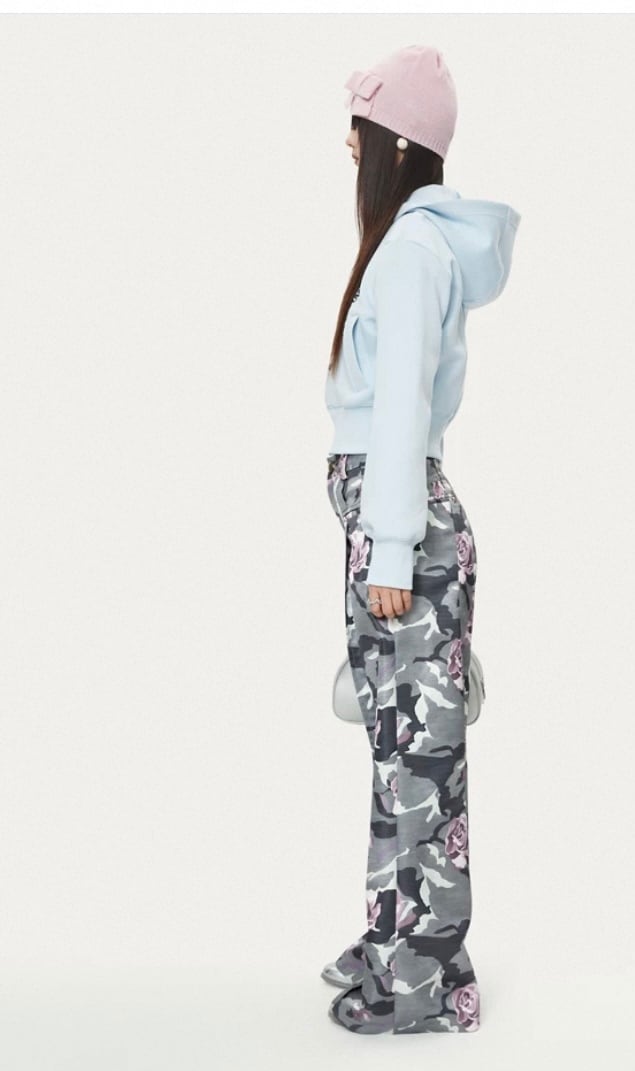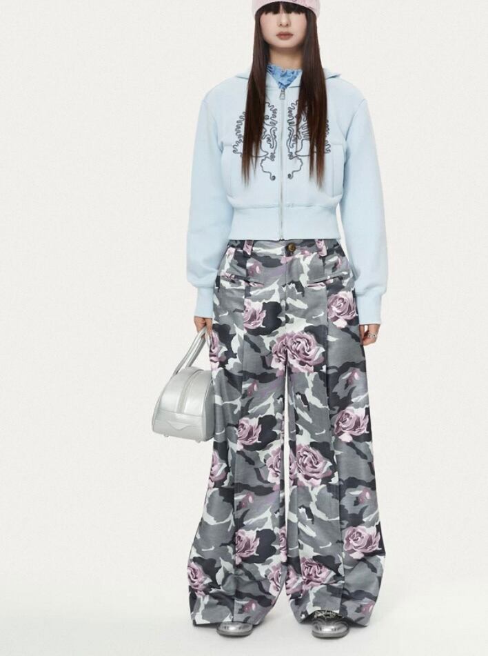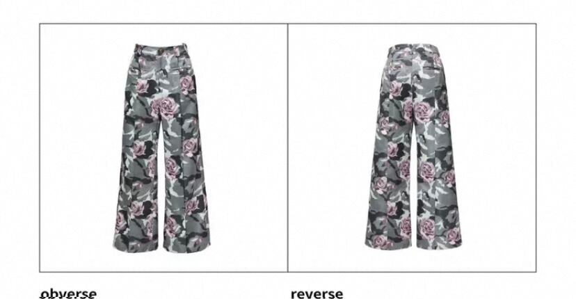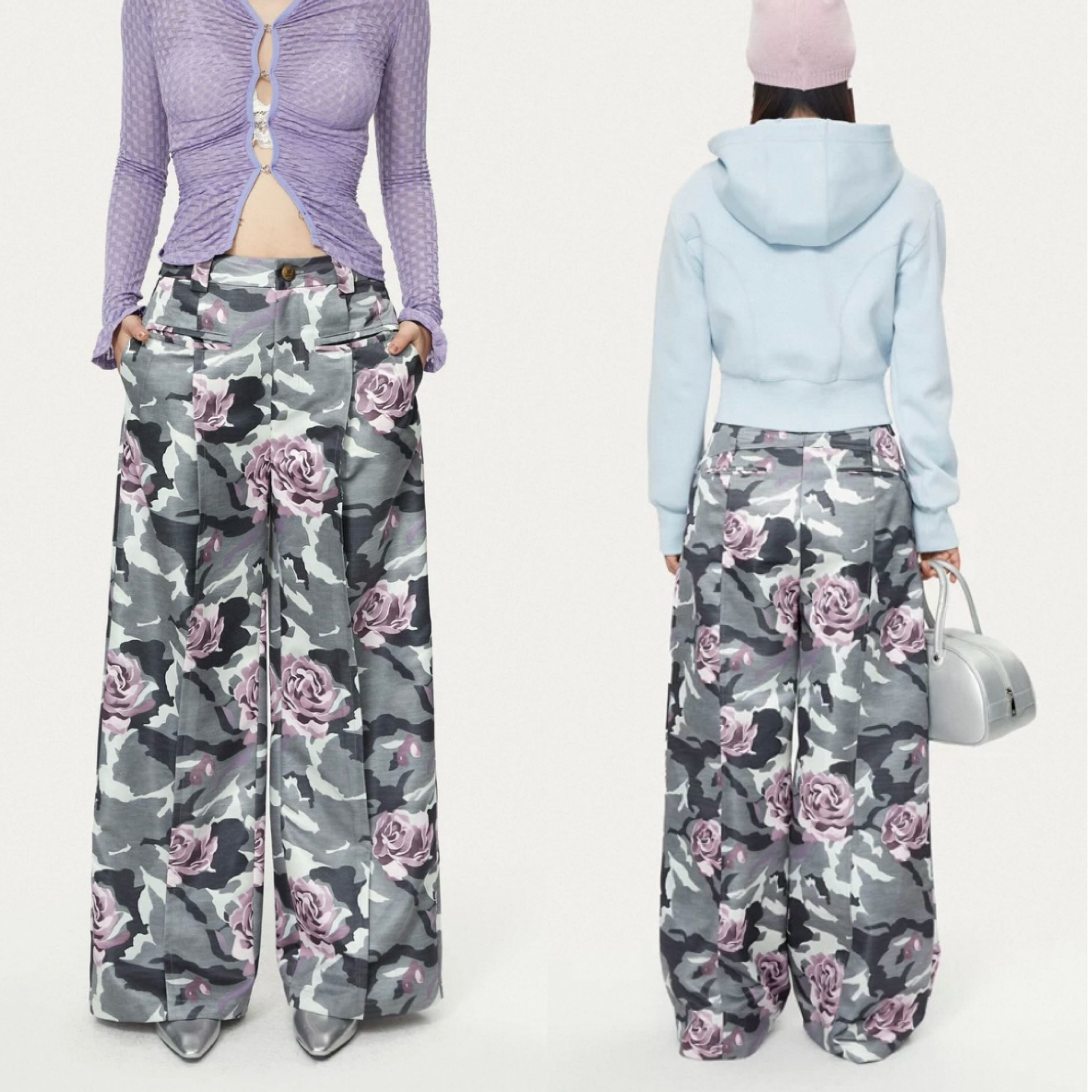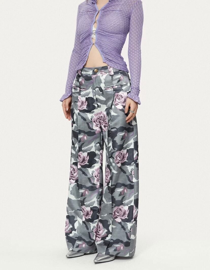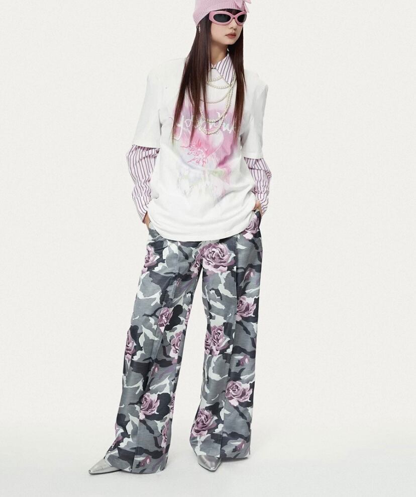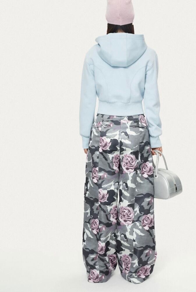 緑、グリーン、ピンク、花 バラ 薔薇 フラワー 迷彩、カモフラージュ、太めパンツストレートボトムス、ズボン、ロング デニム パンツ、エレガント 表参道、青山 銀座