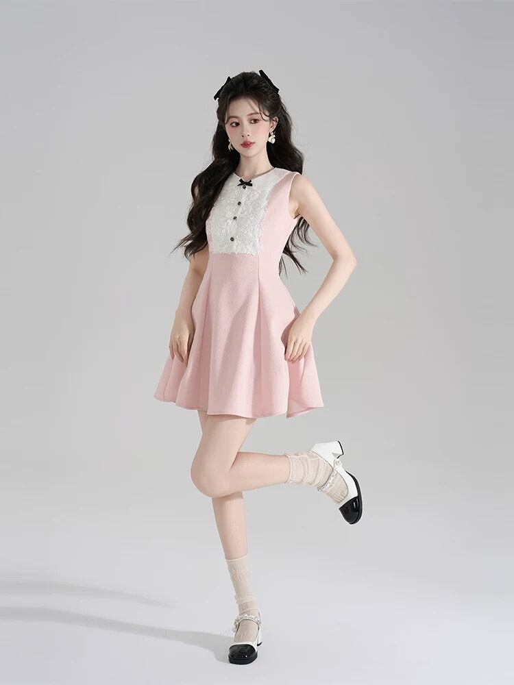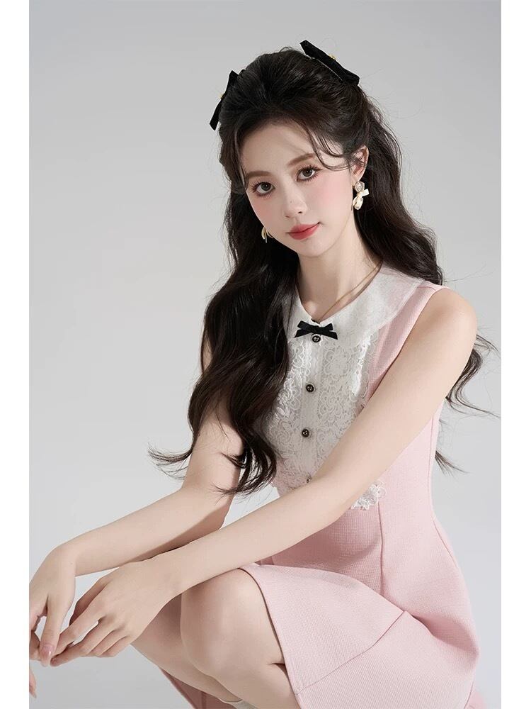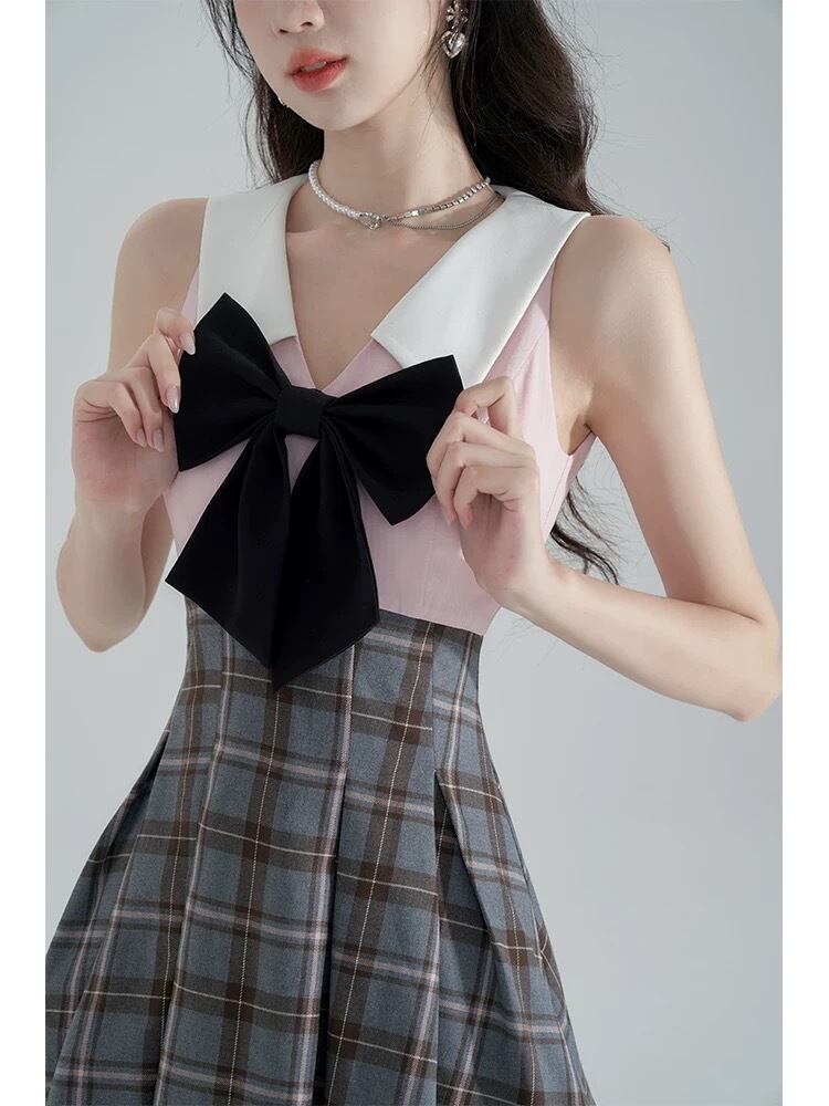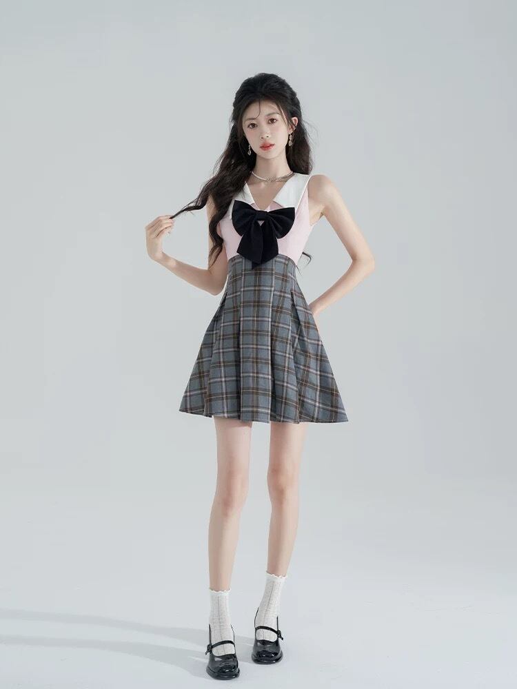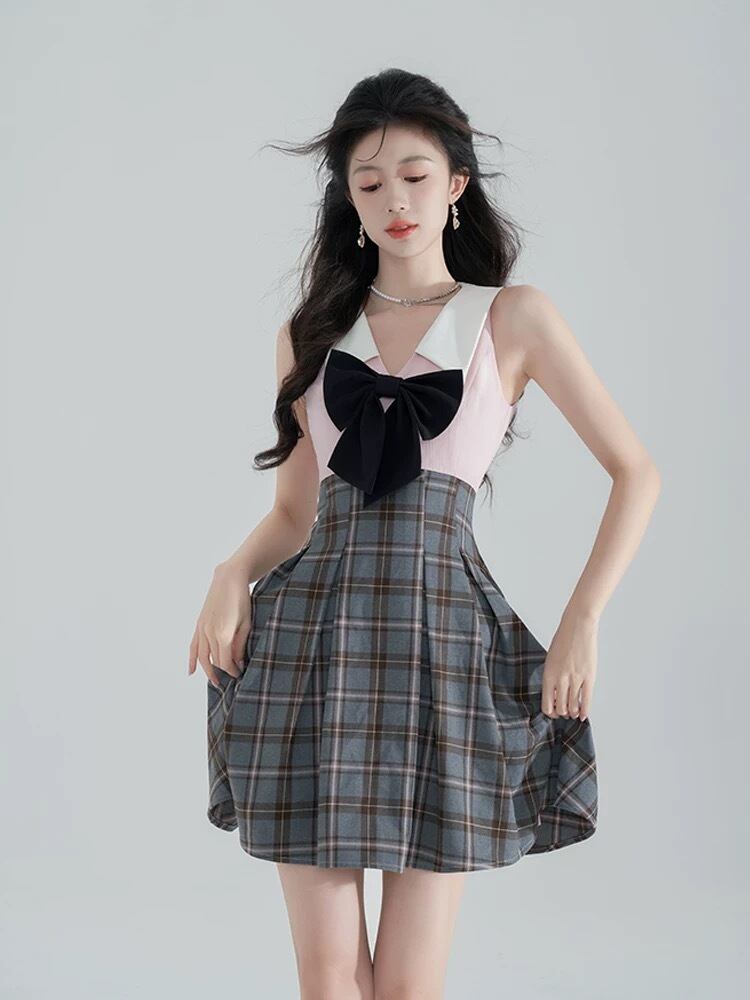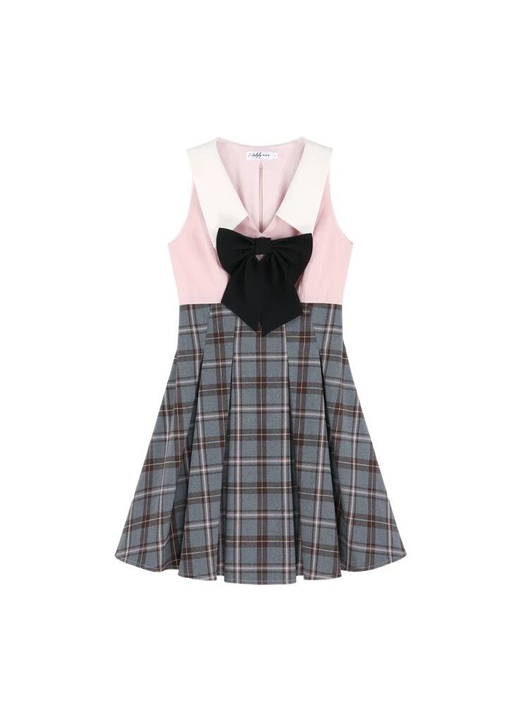 ピンク グレー チェック、リボン ガーリー、お嬢様、かわいい 原宿、渋谷 銀座、表参道、エレガント パーティー スクール チェック リボン ドレス