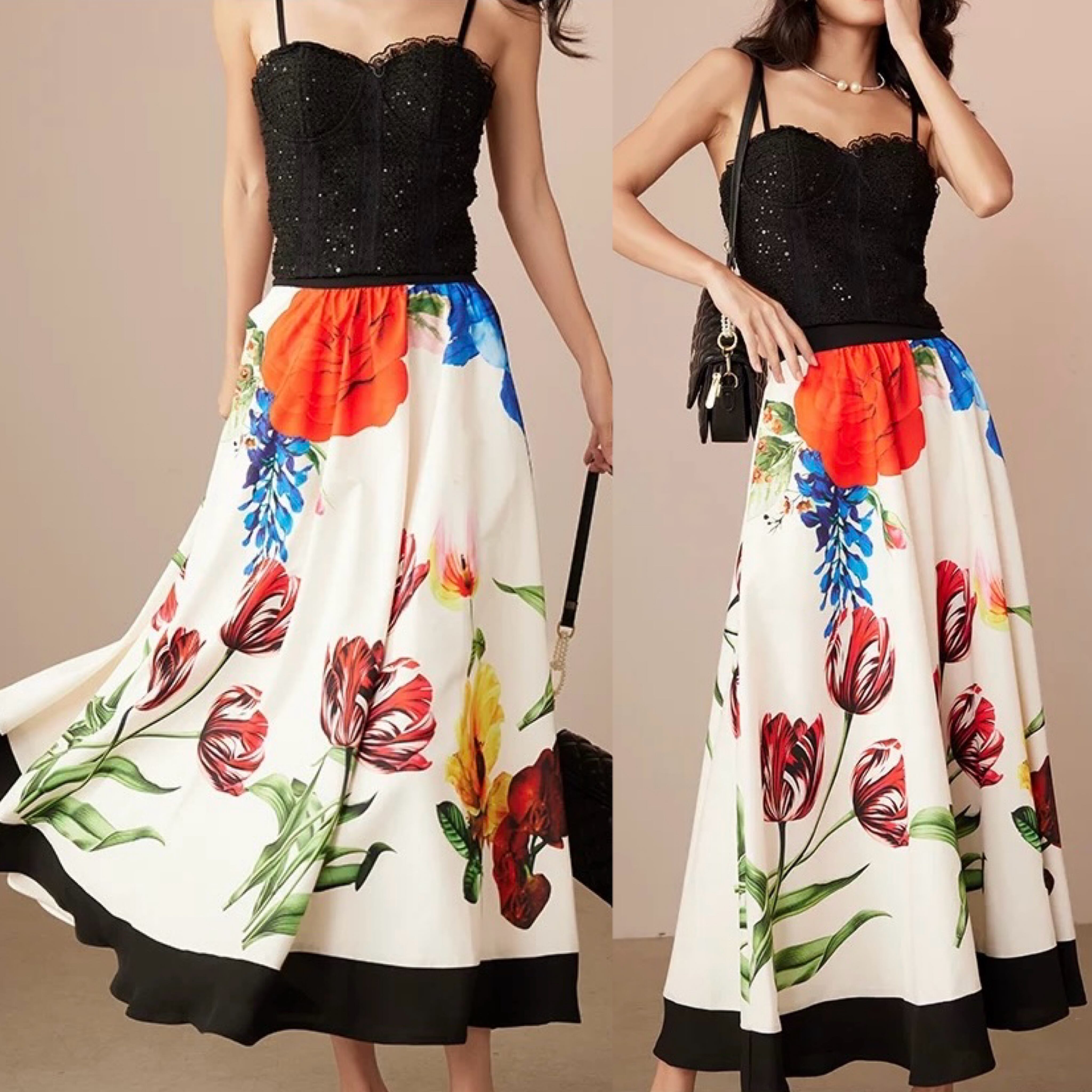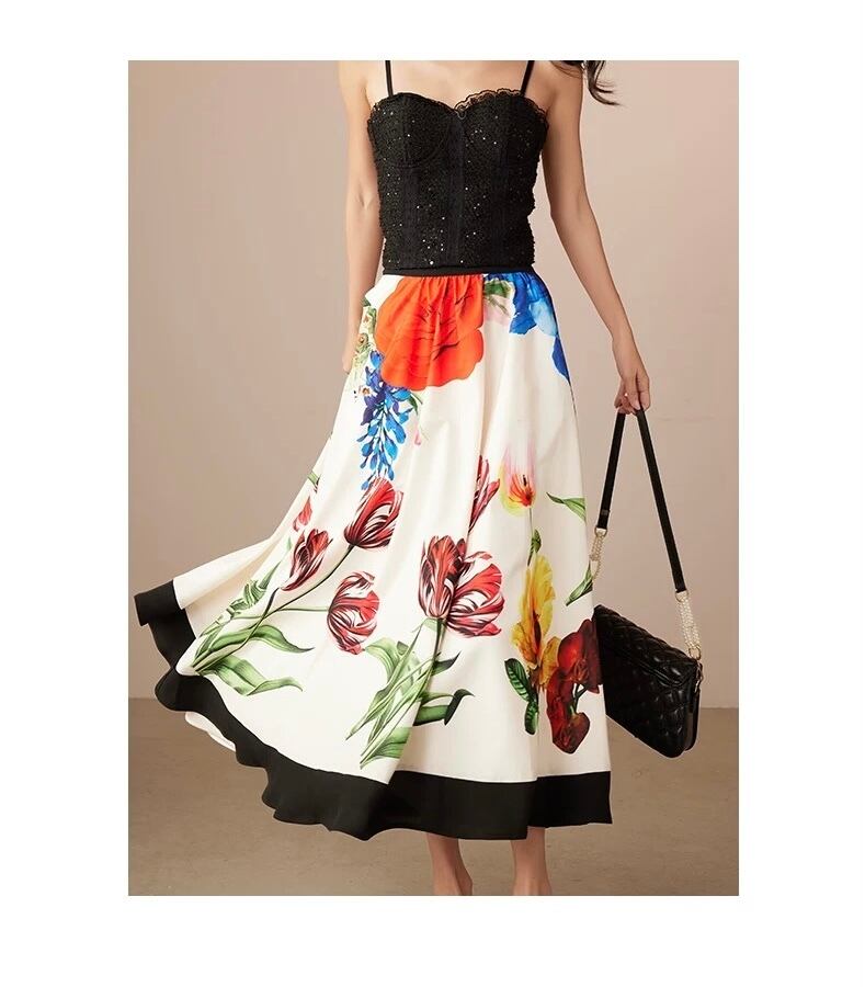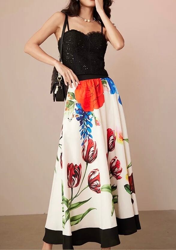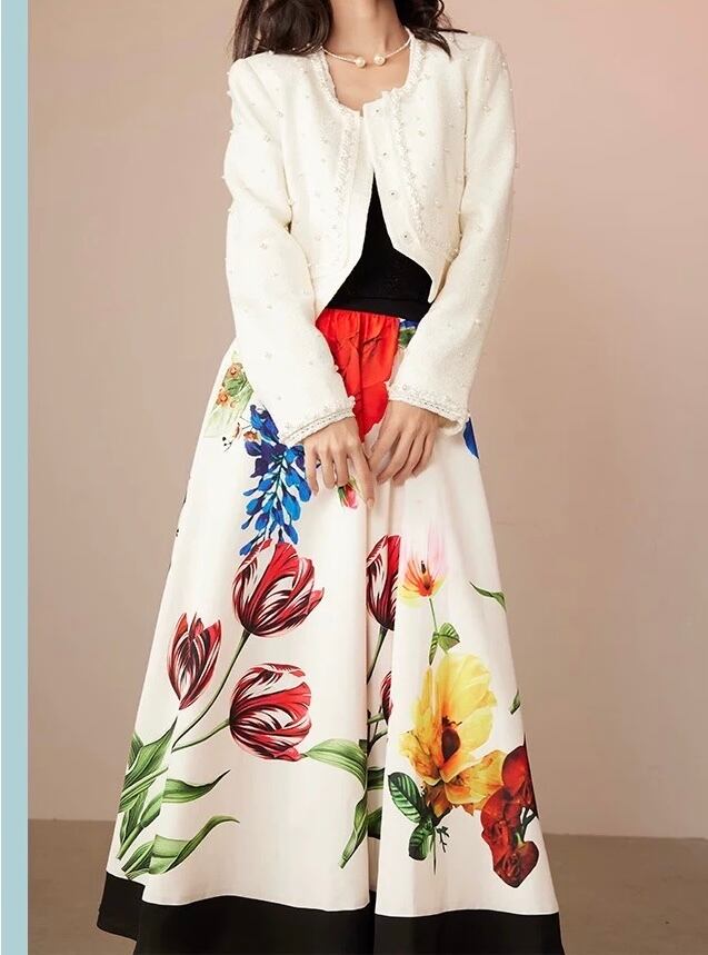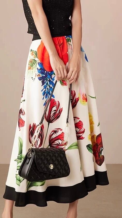 ベージュ、白 花柄、フラワー カラフル チューリップ、ロングスカート、ボトムス、マダム、銀座表参道、 青山 エレガント パーティー、チューリップ、薔薇 カラフル、赤 ポピー、草 水色、紫陽花 春夏、さわやか 空